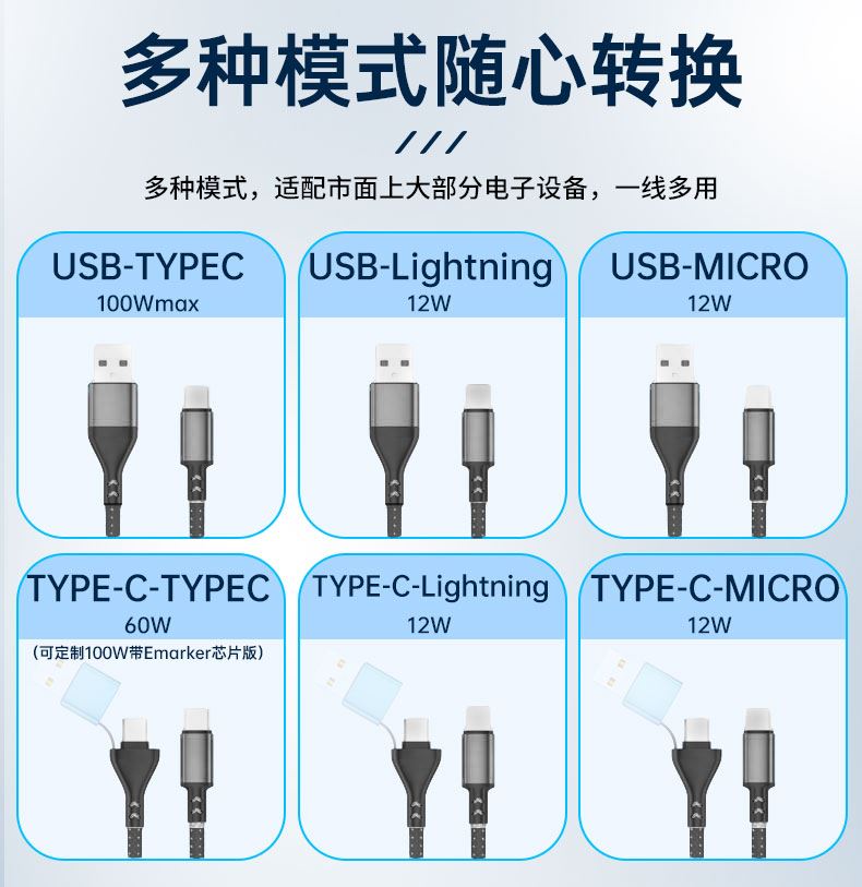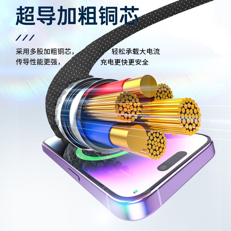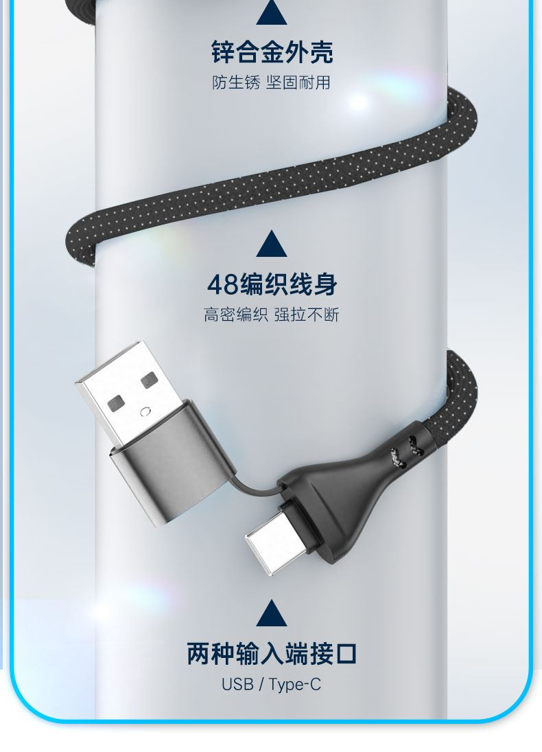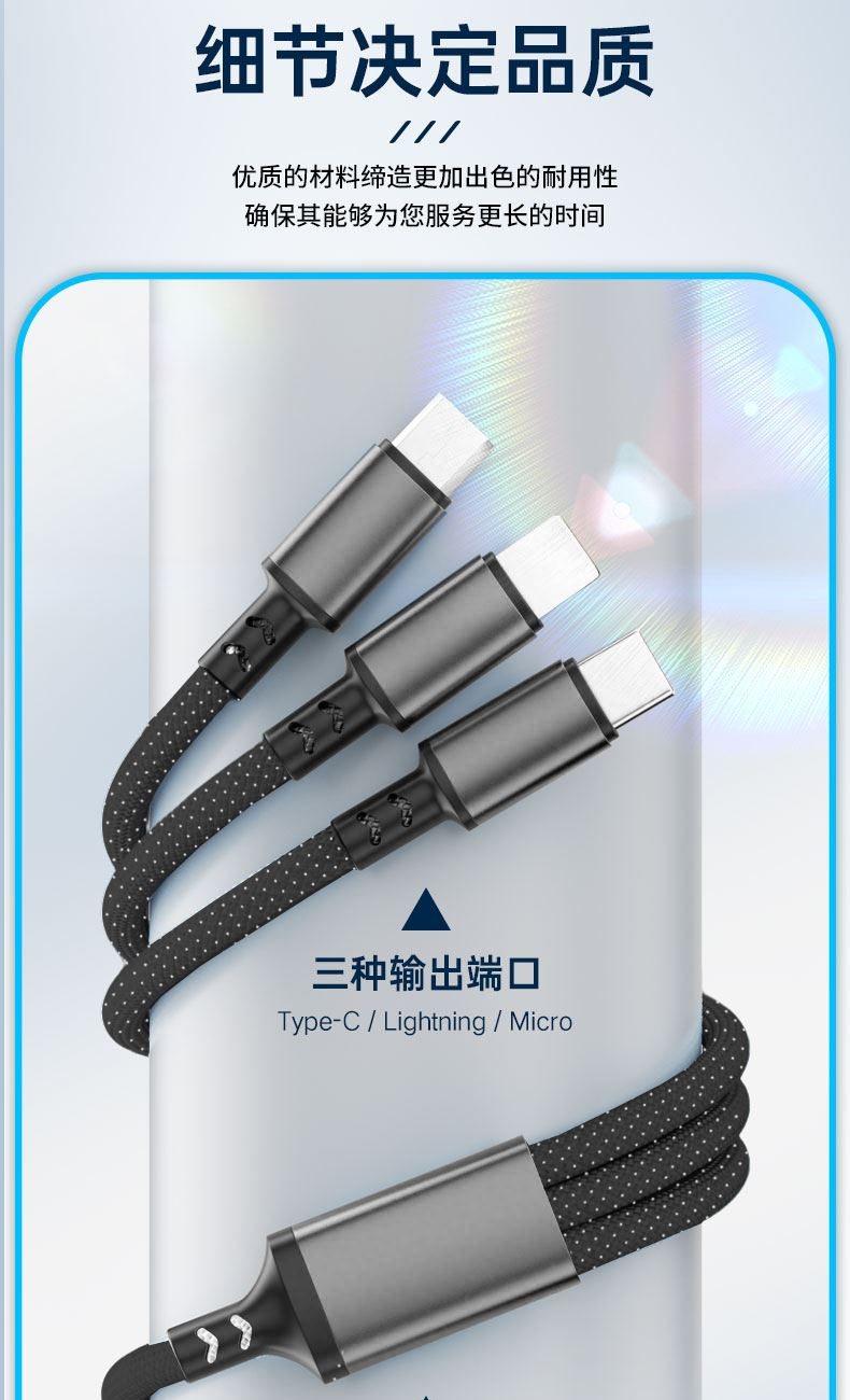 克 重: 45g 线 长:1.2 米 材 质:PVC 铝合金 输 出:5A 接口:micro/TYPE-C/苹果 协 议:SCP QC3.0 铜丝:60*2+15*2 0.08纯铜 颜 色:灰白色 快充100W、尼龙编织材质、耐拉耐折,易收纳,携带方便,适用于苹果,安卓,type-C 适用范围:适用于市面上所有常见手机。