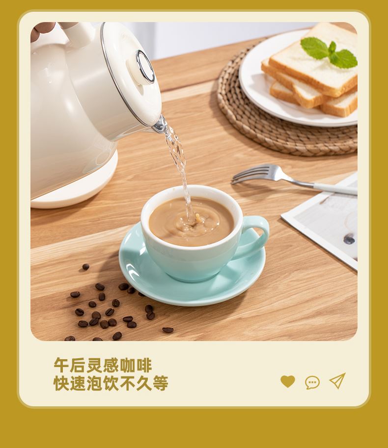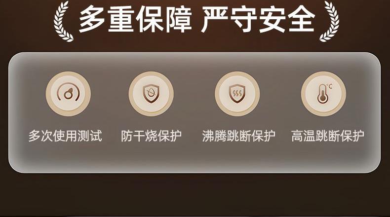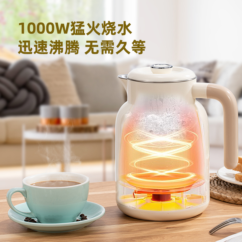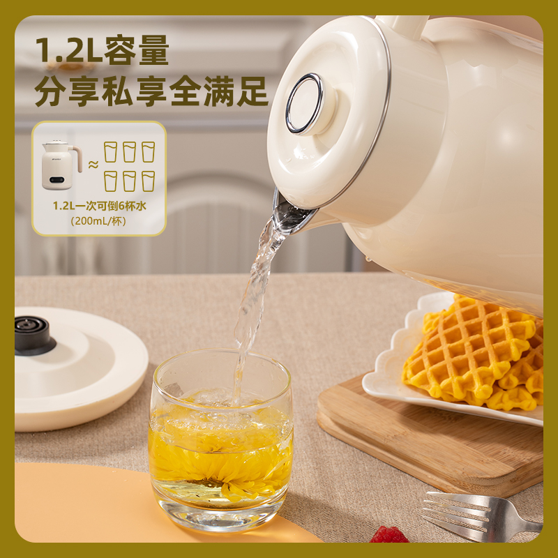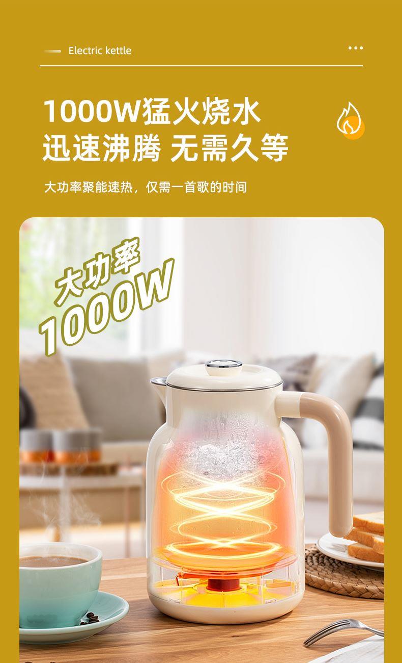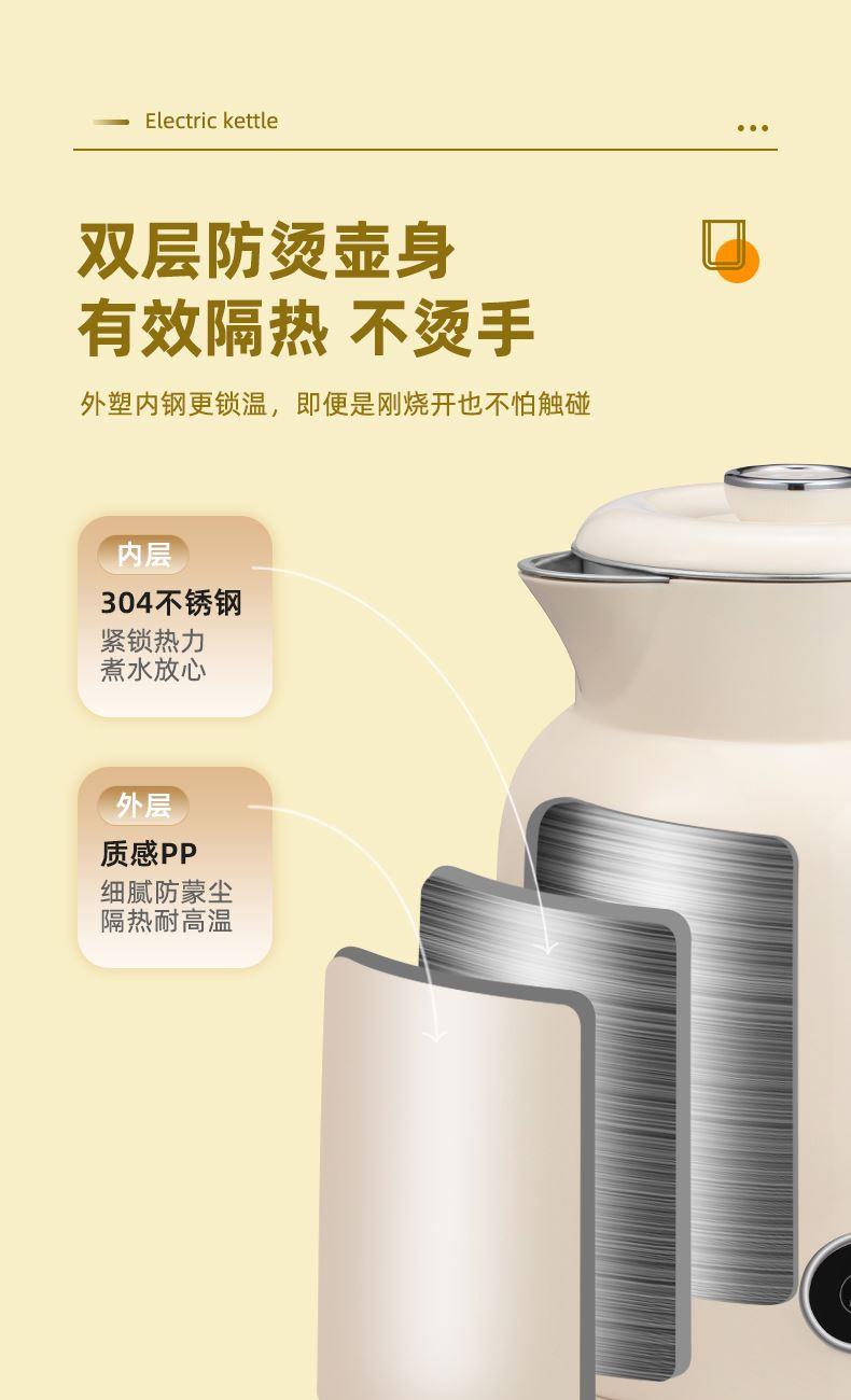 功率:1000W 容量:1.2L 双层防烫304不锈钢电热水壶,45℃/55℃/65℃/75℃/85℃/100℃/六段智能调温 24小时长效恒温保温,触控式操作数码显示屏 包装方式:彩包+网购包装