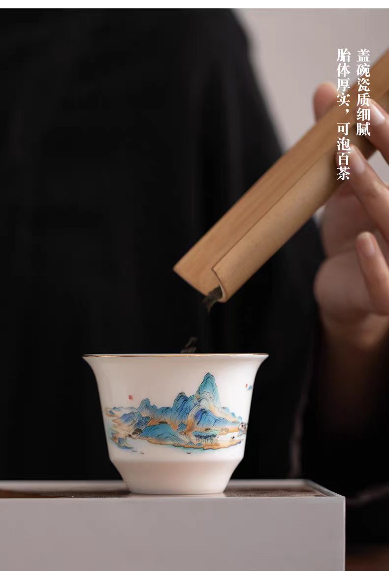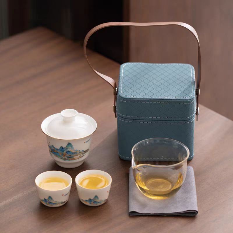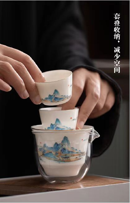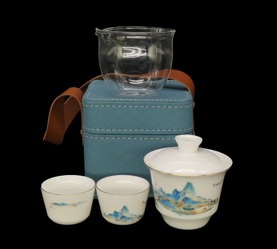 鹏翼千里江山描金羊脂玉瓷快客套装户外踏青