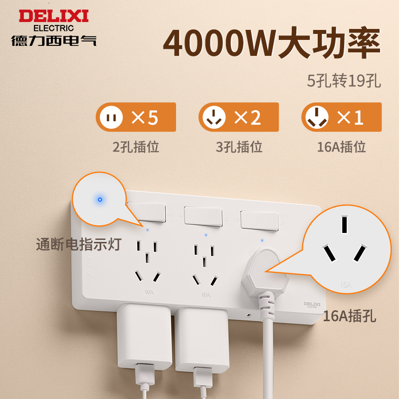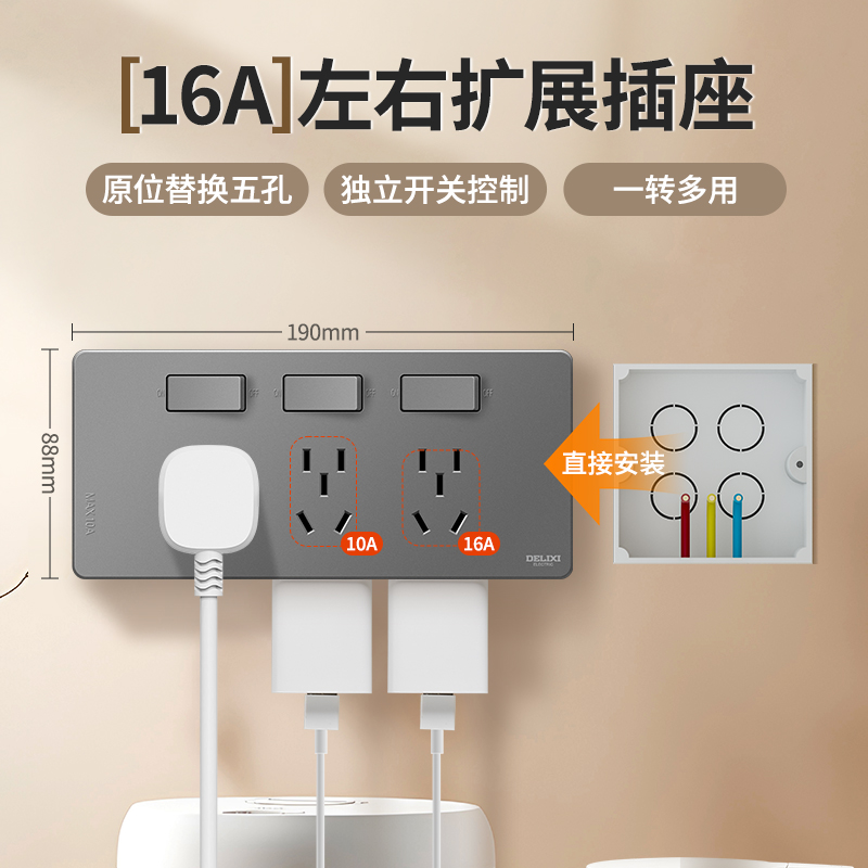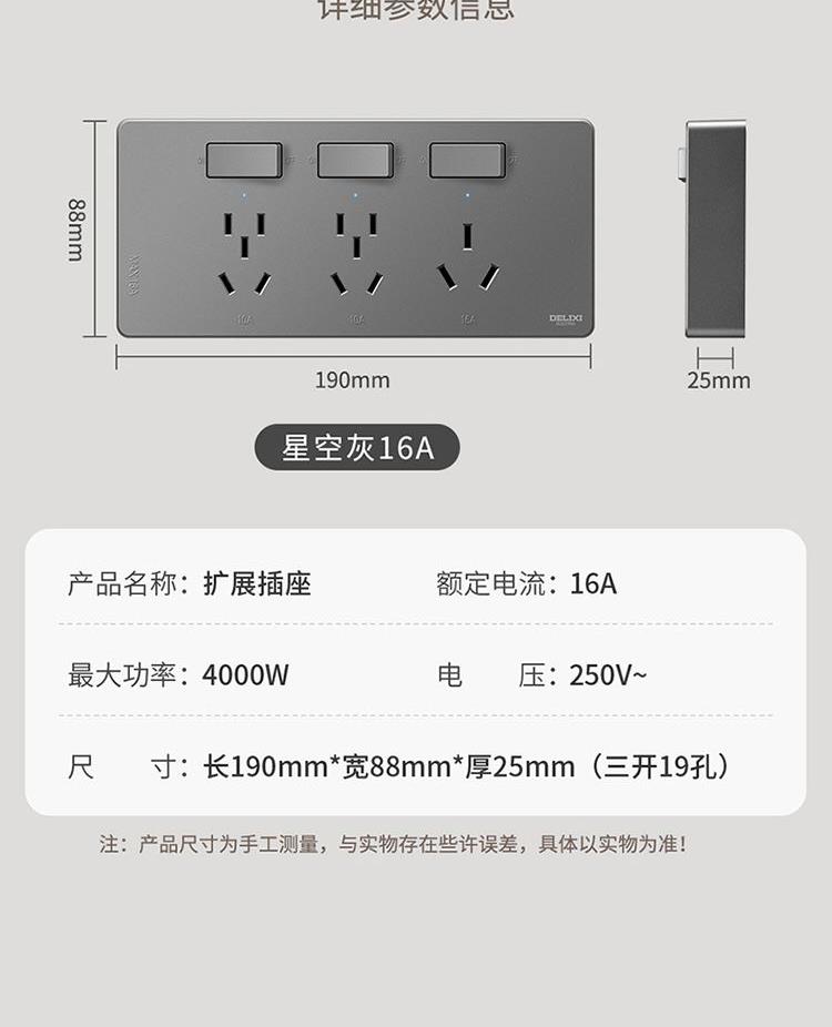 产品:德力西电气 DETC系列十六孔插座10A+三孔插座16A (星空灰) 品 牌:德力西电气 产品型号:DETC-X16S1(H) 额定电流:16A 额定电压:250V 插座尺寸:190*88*25mm 产品位数:一位三孔(16A)、两位五孔、三位两孔、无线(需要自行接线)