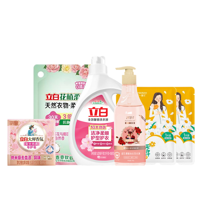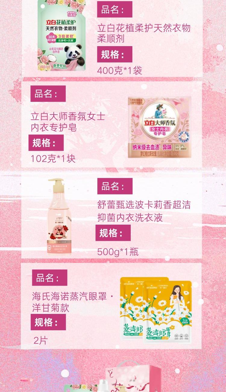 配置: 立白全效馨香洗衣液1.018kg*1瓶 立白花植柔护天然衣物柔顺剂400克*1袋 立白大师香氛女士内衣专护皂102克*1块 舒蕾甄选波卡莉香超洁抑 菌内衣洗衣液-500g*1瓶 海氏海诺蒸汽眼罩·洋甘菊款*2片 核心卖点: 可选产品丰富多样,礼箱随心组合,多种价位因需而定,充分满足各种送礼需求,是商务送礼、单位福利的用心之选。