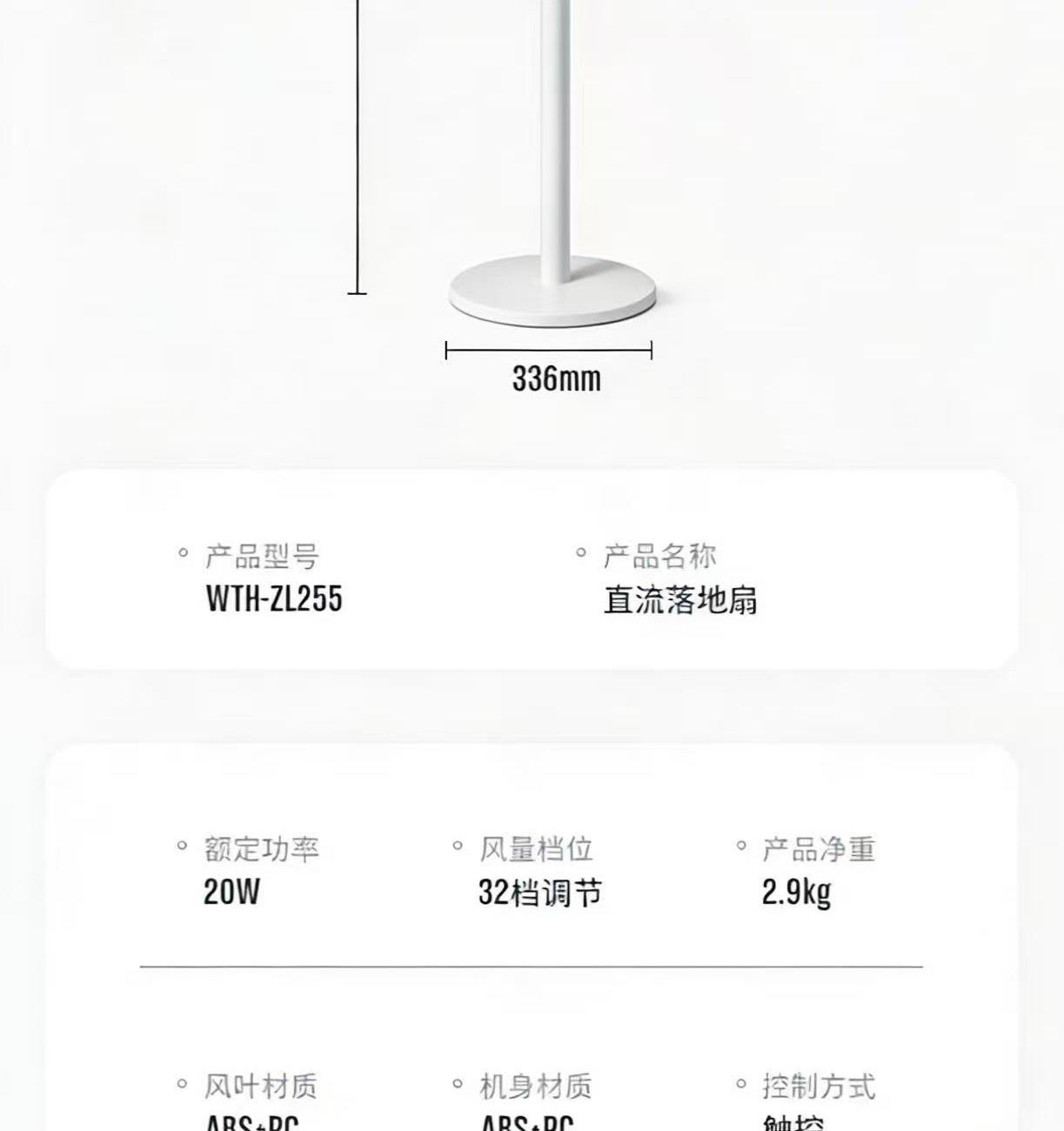 型号:WTH-ZL255 功率:20W 控制方式:智慧语音/触屏/遥控/手机小程序 风速档位:32档 产品尺寸:336*300*1100mm 一级能效 32档风速调节 直流无刷电机 智慧语音/触屏/遥控/小程序 超声波驱蚊 自然、睡眠、婴儿、正常风