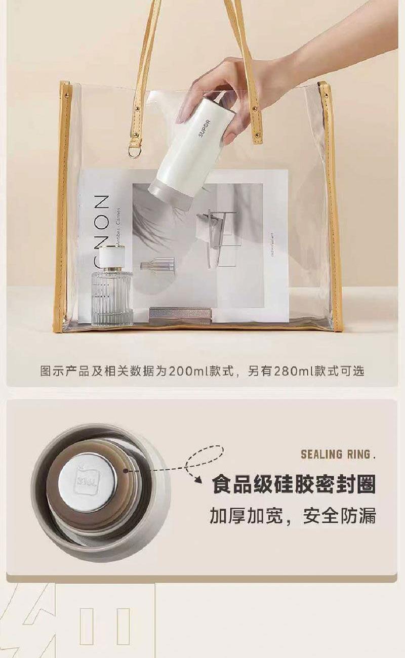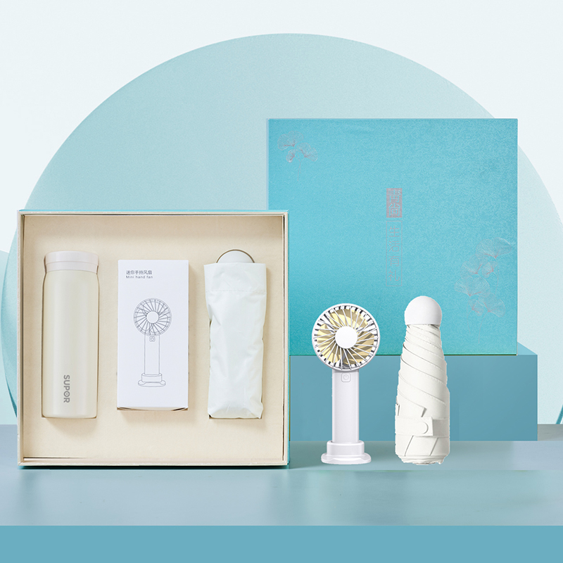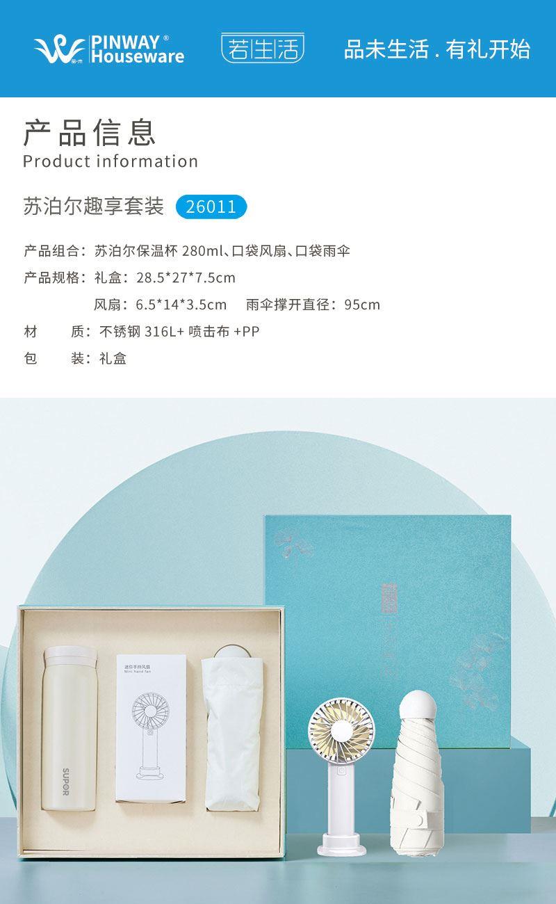 产品组合:苏泊尔保温杯280ml+口袋风扇+口袋雨伞 产品规格:礼盒28.5*27*7.5cm 风扇:6.5*14*3.5cm 雨伞撑开直径:95cm 材质:不锈钢316L+黑胶布+PP 包装:精装礼盒