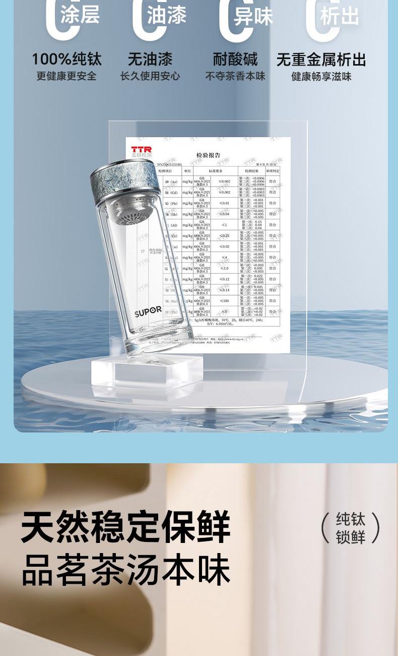 容量:180ml 518*249*406mm 11.60kgs 材质:纯钛+高硼硅 卖点: 1.加厚防爆杯体外层加厚底 2.耐冷热杯体4小时退火工艺