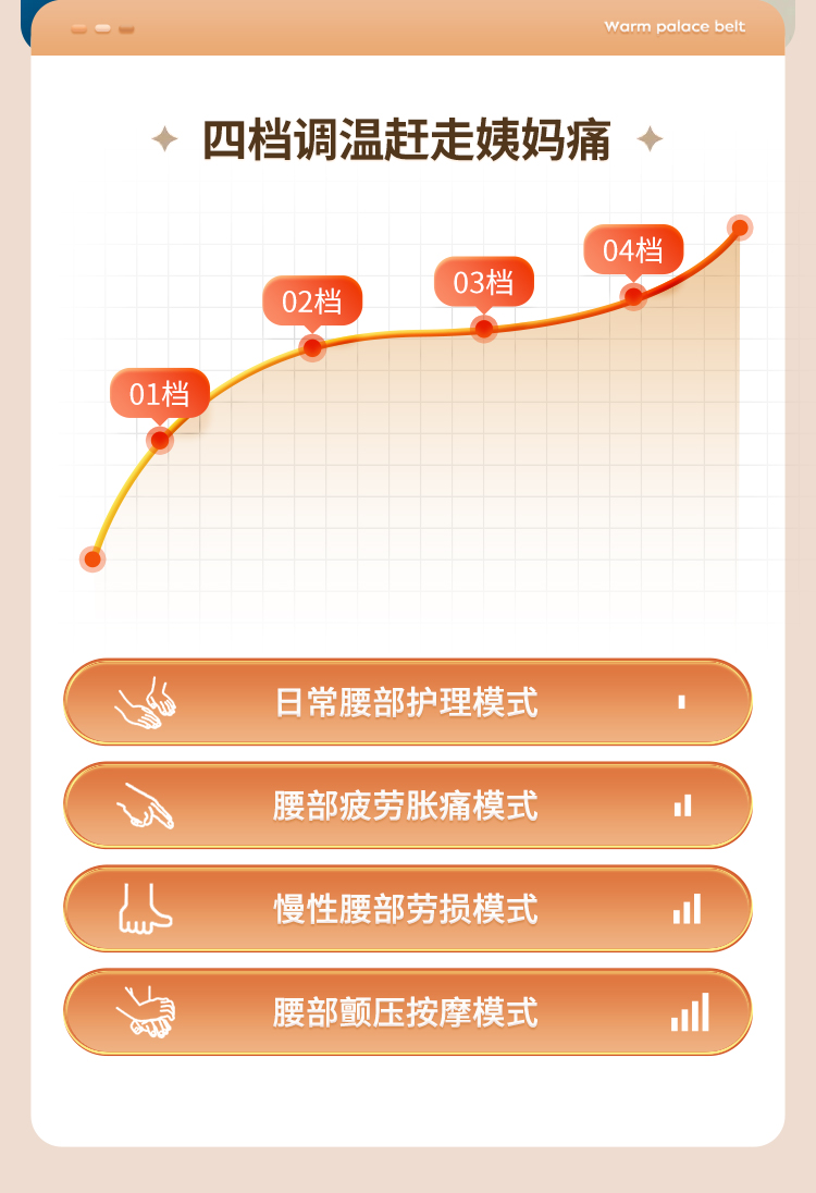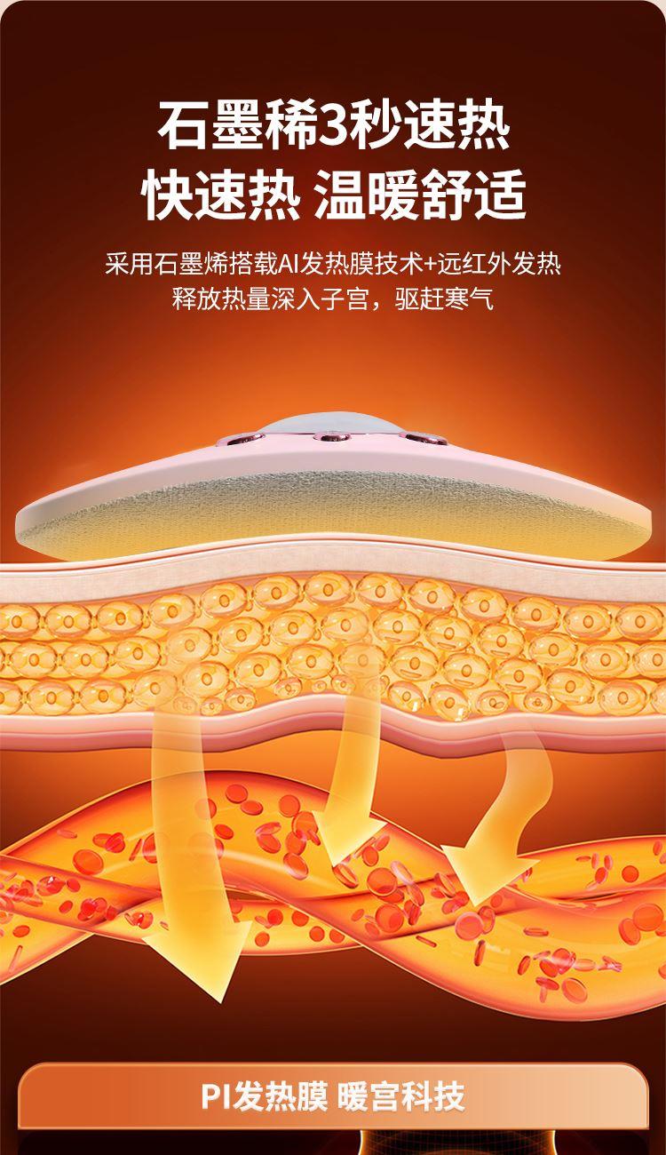 电池容量:1800mAh 产品尺寸:188*93*42mm 包装尺寸:225.5*108.5*63mm 产品重量:218g 额定功率:10W 输入:TYPE-C,5V2A 充电时间:4H 工作时间: 单次工作30分钟自动停止,可用3次左右 1档:2小时,2档:1.8小时,3档:1.5小时 4档1.2小时 颜色:粉色 材质:ABS+PC 石墨烯速热,加大发热面积 大容量电池,亲肤法丝布 高回弹腰带,环保ABS外壳 一键启动,4档震动4个模