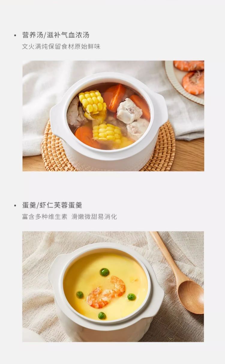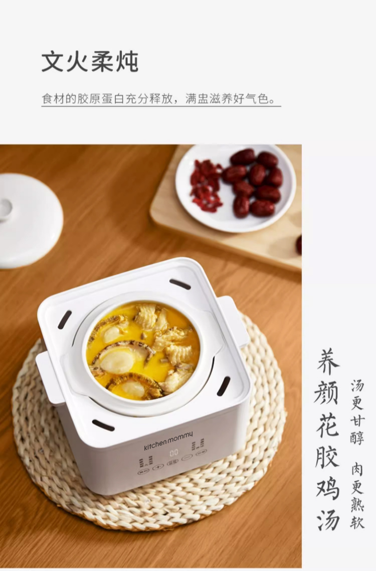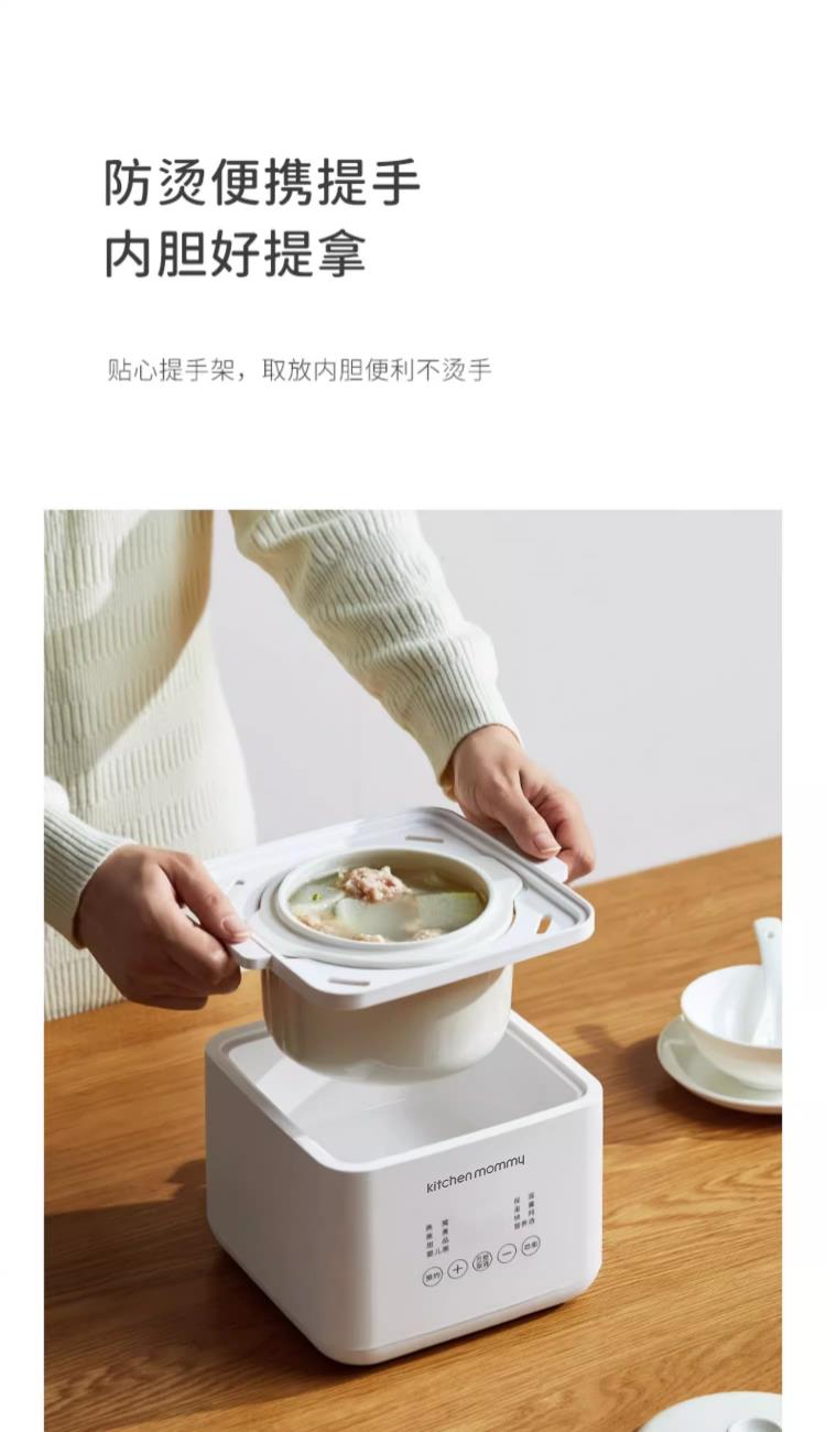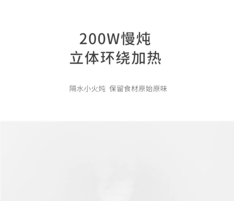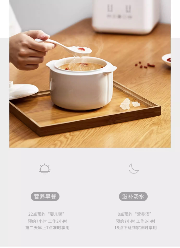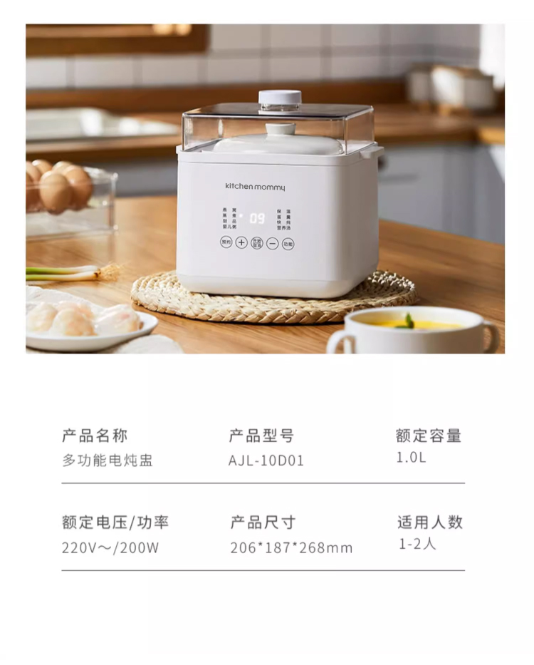 功率:200W 电压:220V 容量:1L 毛重:3Kg 材质:外壳PP+陶瓷内胆 彩盒包装尺寸:230*215*235mm 外箱包装尺寸:475*450*490 mm 推荐理由: 1、200W慢炖,环绕加热 2、24小时长效定时预约 3、智能保温 4、小巧立体,不占空间 5、防烫提手,内胆方便端拿