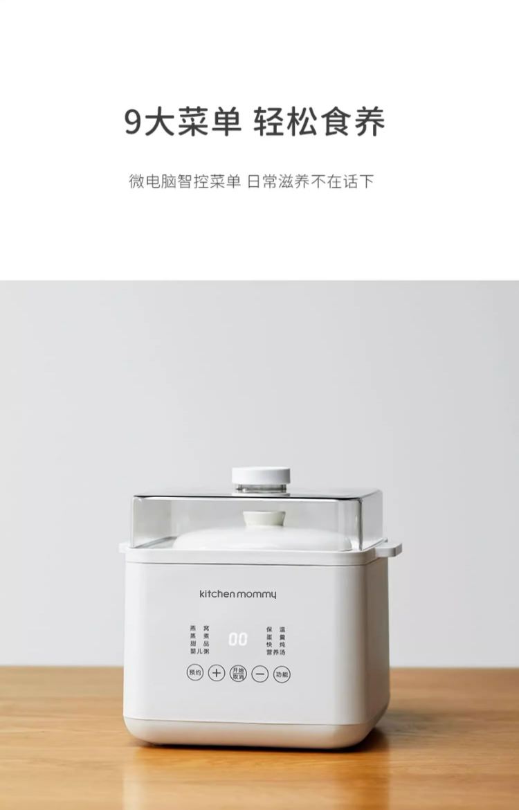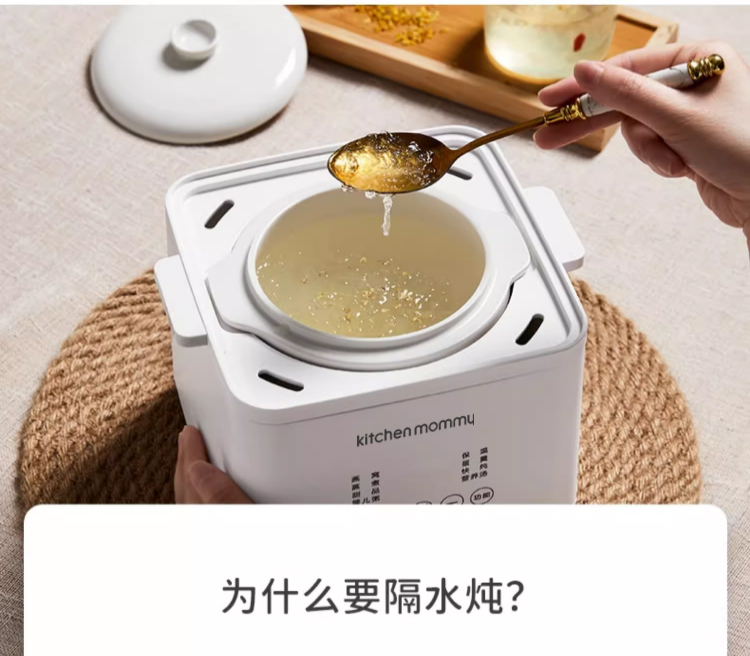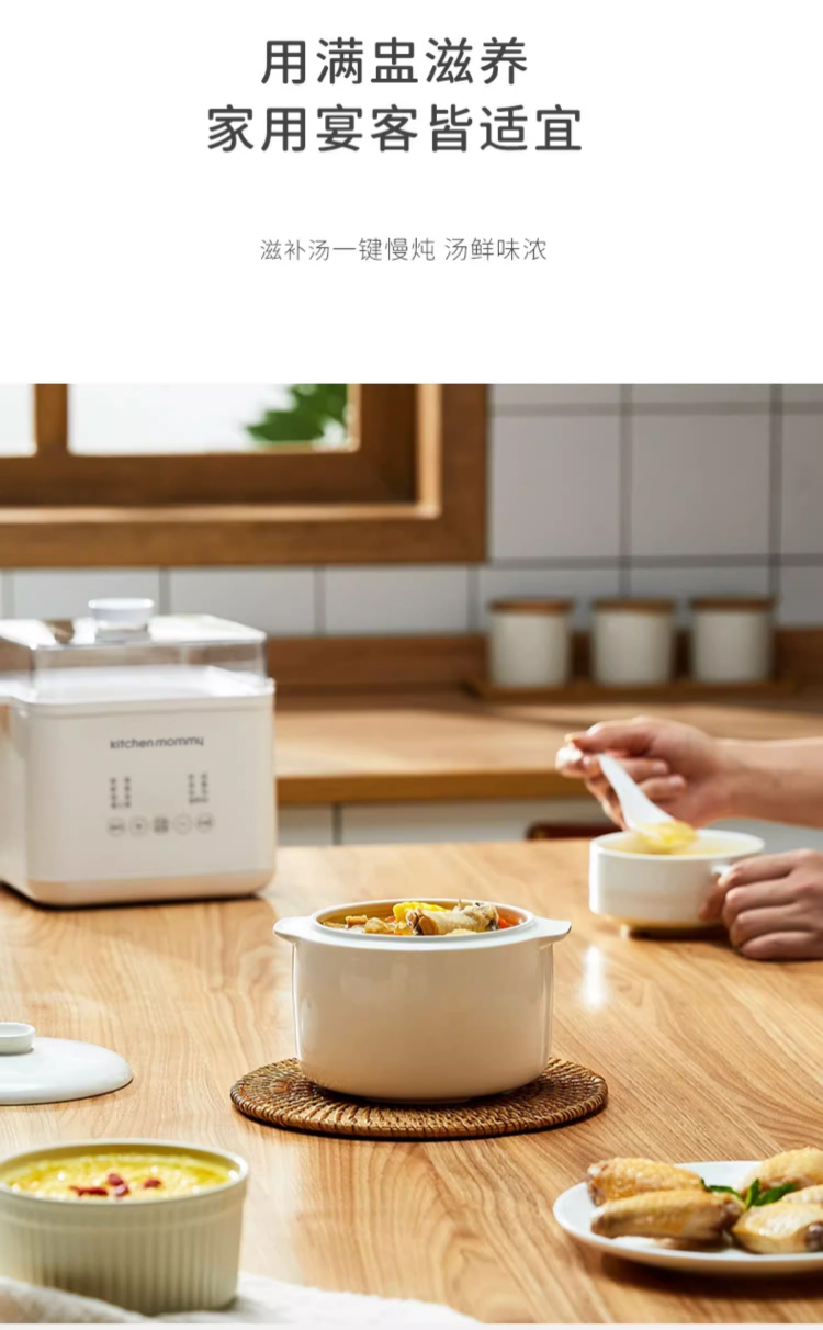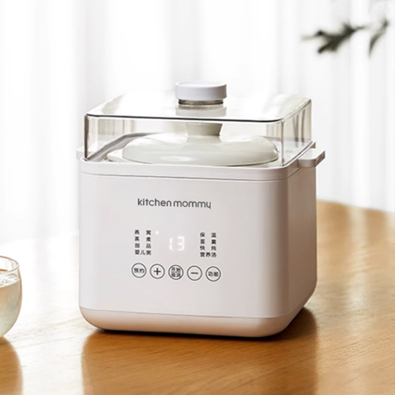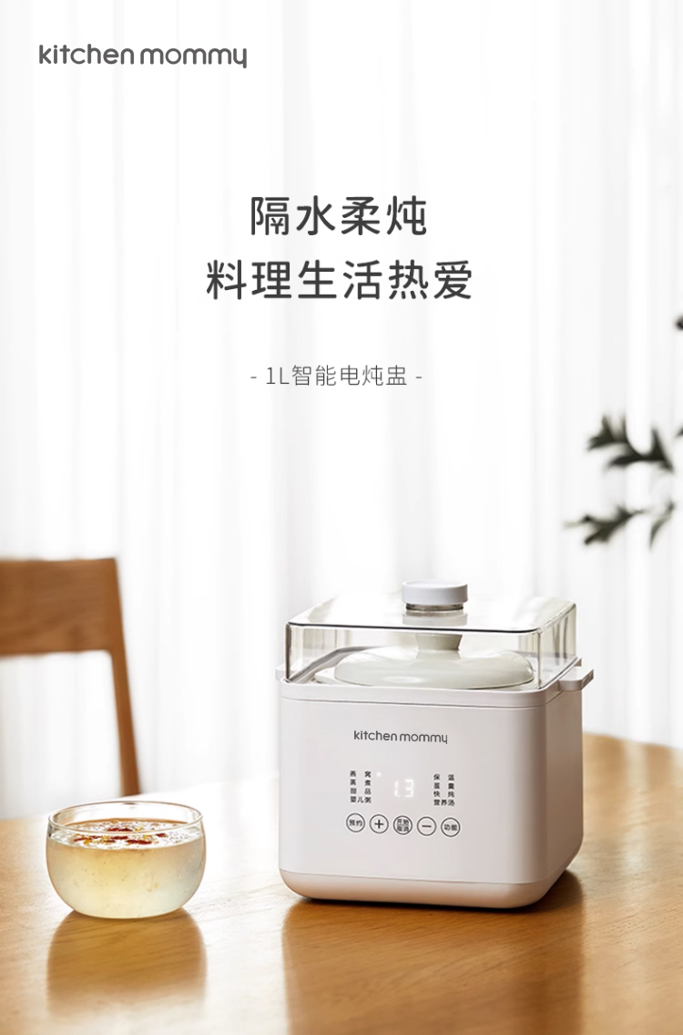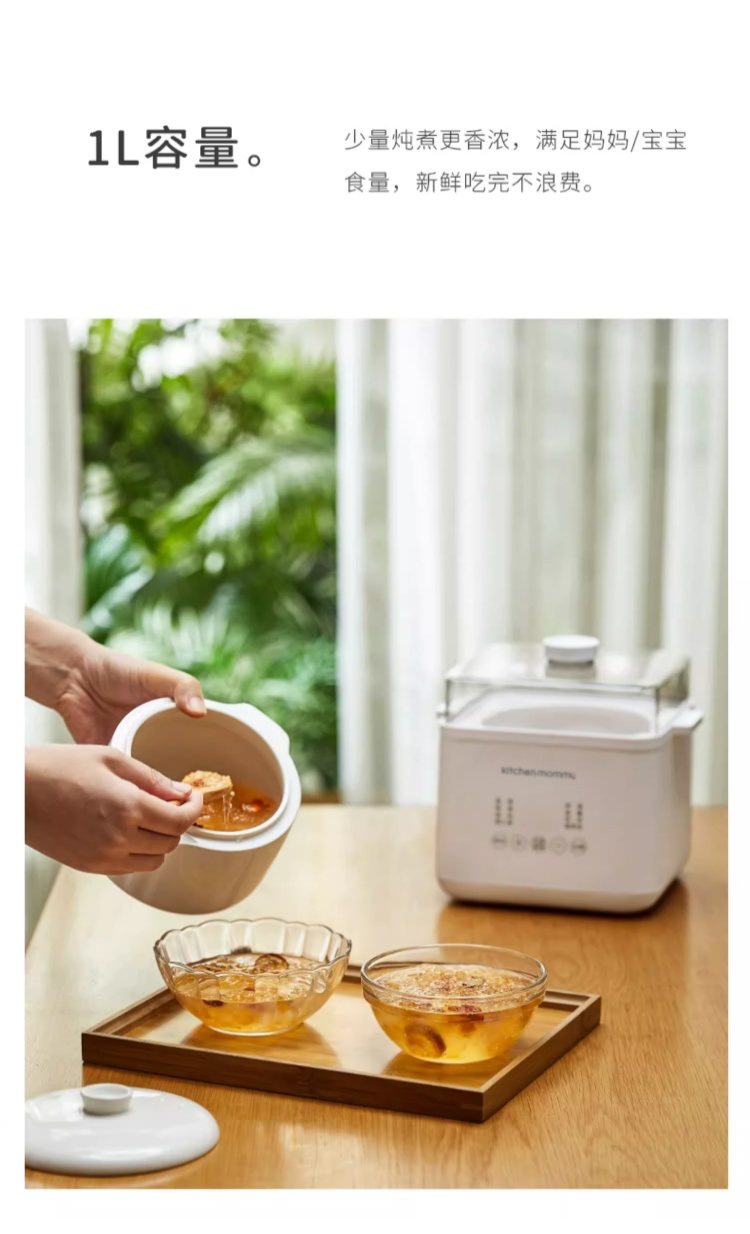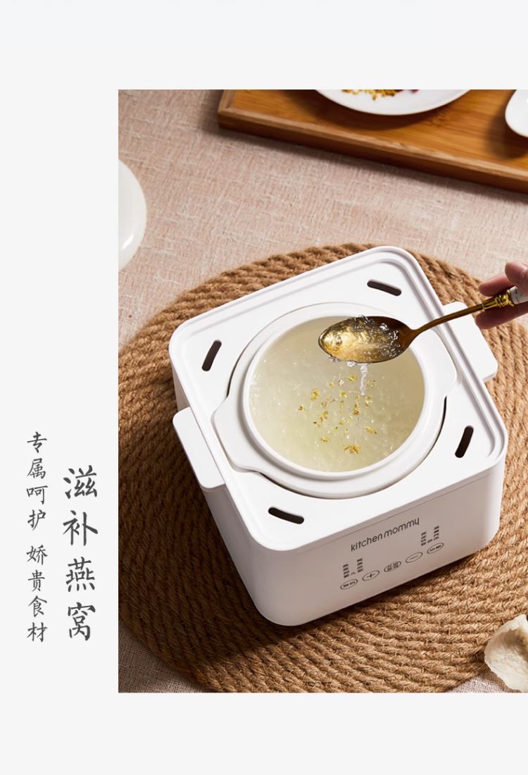 功率:200W 电压:220V 容量:1L 毛重:3Kg 材质:外壳PP+陶瓷内胆 彩盒包装尺寸:230*215*235mm 外箱包装尺寸:475*450*490 mm 推荐理由: 1、200W慢炖,环绕加热 2、24小时长效定时预约 3、智能保温 4、小巧立体,不占空间 5、防烫提手,内胆方便端拿