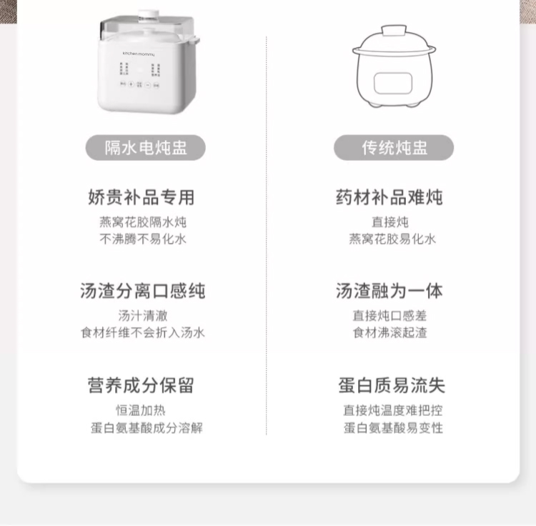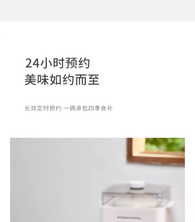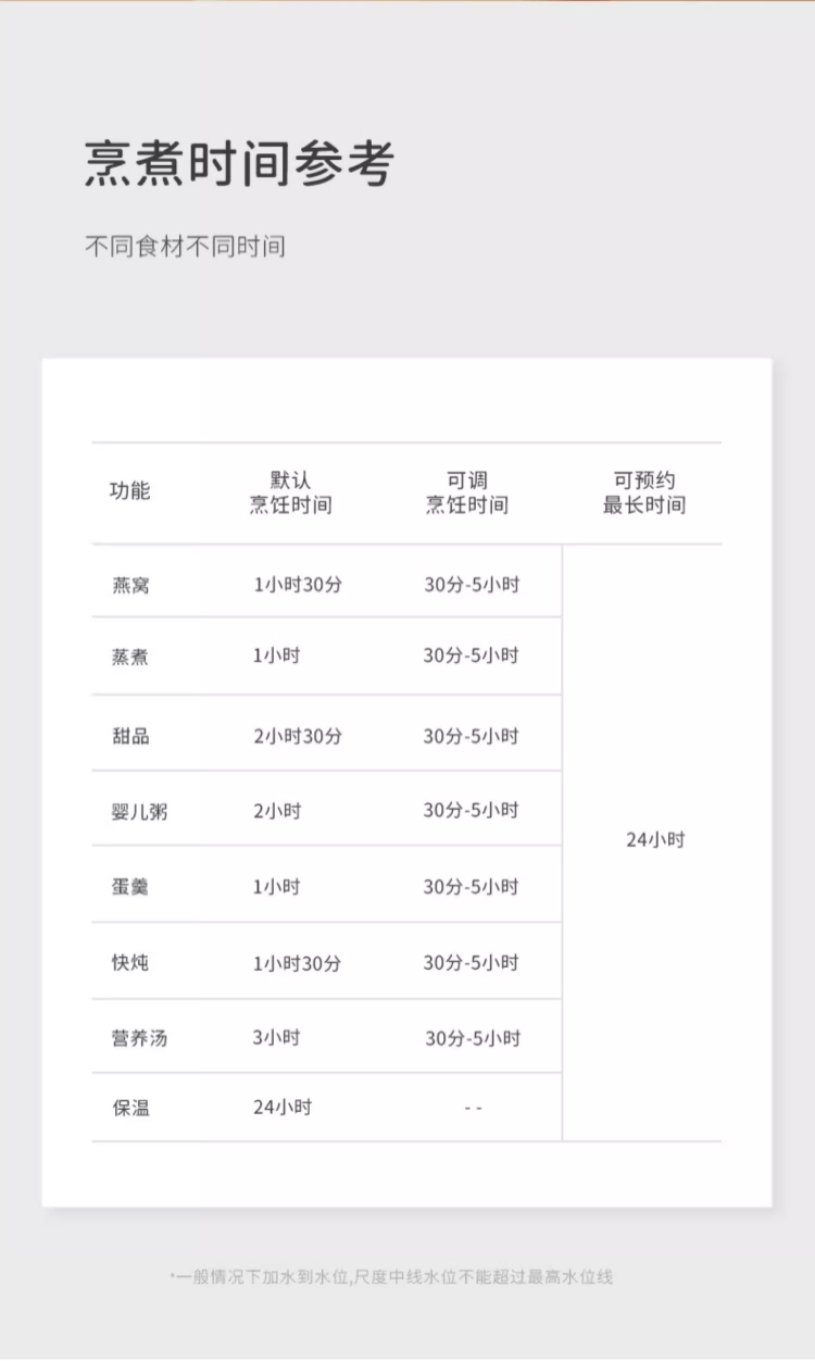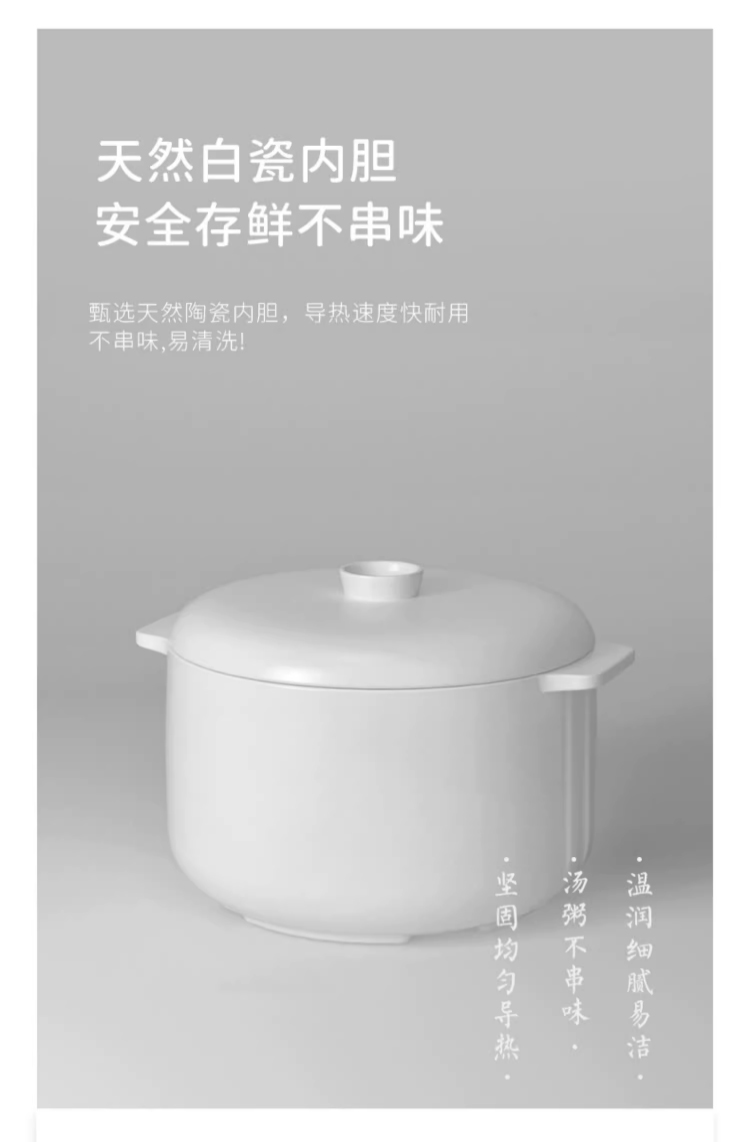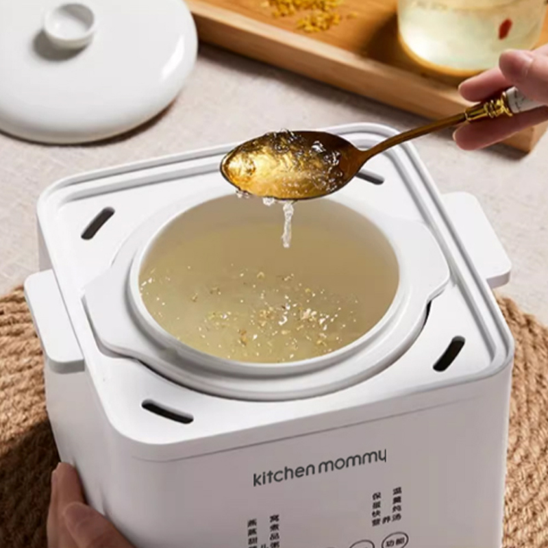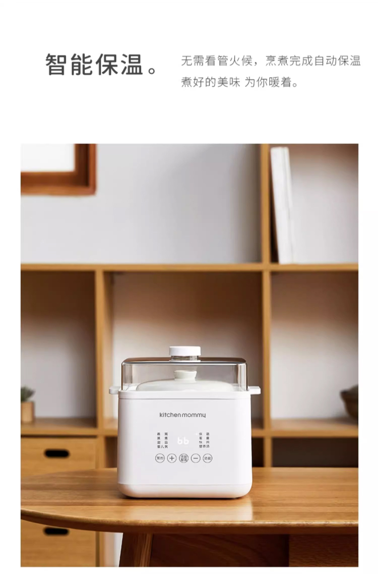 功率:200W 电压:220V 容量:1L 毛重:3Kg 材质:外壳PP+陶瓷内胆 彩盒包装尺寸:230*215*235mm 外箱包装尺寸:475*450*490 mm 推荐理由: 1、200W慢炖,环绕加热 2、24小时长效定时预约 3、智能保温 4、小巧立体,不占空间 5、防烫提手,内胆方便端拿