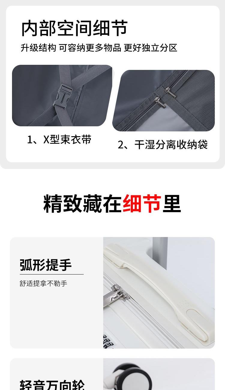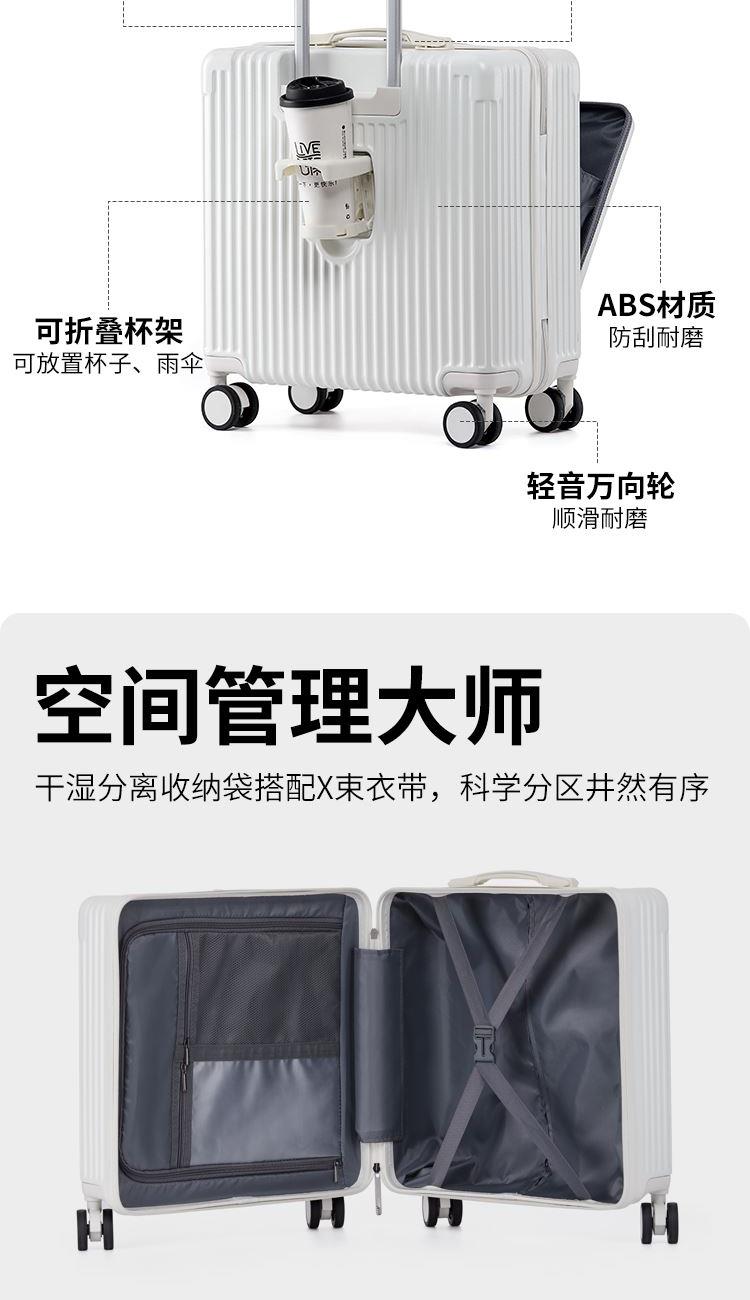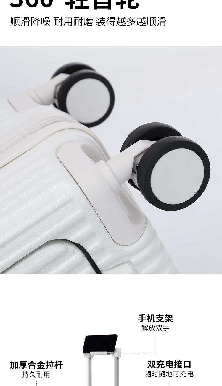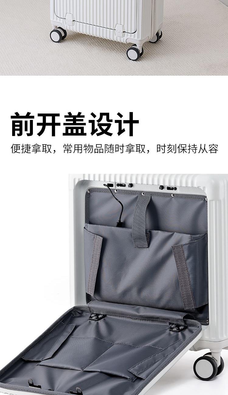 1.合金顺滑拉杆,管壁厚实,经久耐用。 2.灵活飞机八轮,360°旋转,稳定顺滑,让旅途更省心。 3.内里左右分区,携带物品分装合理。 4.前开盖设计,拿取更方便,出行更便捷。