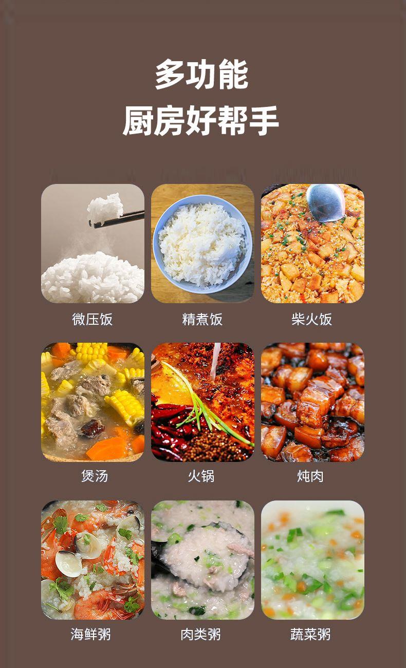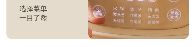 2、九大功能智能菜单:火锅,煲汤,炖肉,微压饭,精煮饭,柴火饭,海鲜粥,肉类粥,蔬菜粥,多功能,开启花样美食