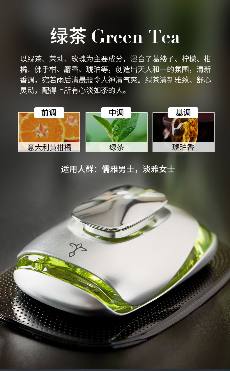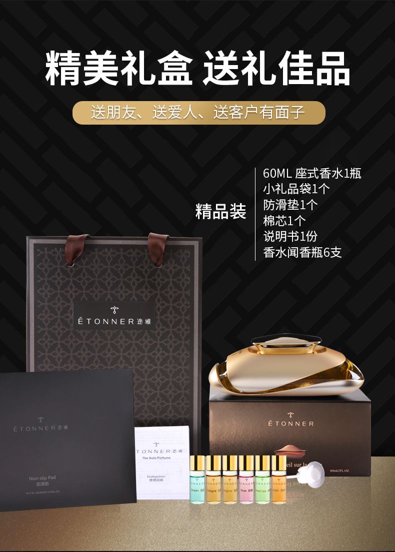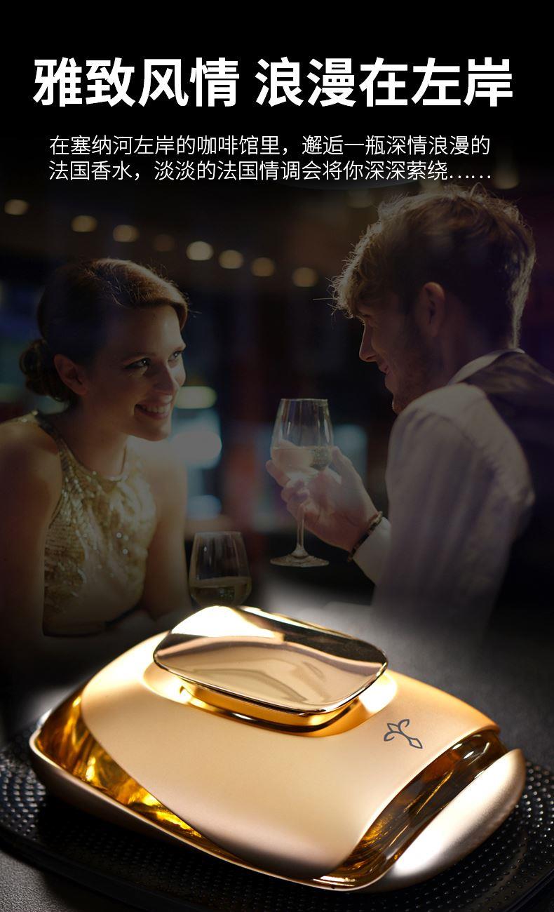 产品标配: 金属香水座装60ML香水,纳米防滑垫、闻香瓶1套(6支)、礼品盒+礼品袋 卖点: 1、香料由深耕行业30余年的法国格拉斯EP集团直供优质香料。 2、VI:由意大利设计师Russell Haines设计。 3、外观设计:由红点奖得主Valerie Normain设计的香水瓶外观。 4、工艺:采用珠宝级锻造工艺 5、我们注重品质与服务,库存稳定,发货快,定制快。欢迎新老客户放心推。 拿在手里沉甸甸的,放在车里很显品位。非常适合所求品质生活的客户群体。 一个起,免费加LOGO、车标 途雅秉持简洁、优雅、时尚、浪漫、自由的生活主张,助力经销商撬动车载家居香氛市场,轻松俘获追求品质生活的消费群体 产品设计灵感:法国有着世界瞩目的物质遗产,更有无形而伟大的艺术声望。在塞纳河左岸的咖啡馆里,邂逅一瓶深情浪漫的法国香水,淡淡的法国情调会将你深深萦绕……