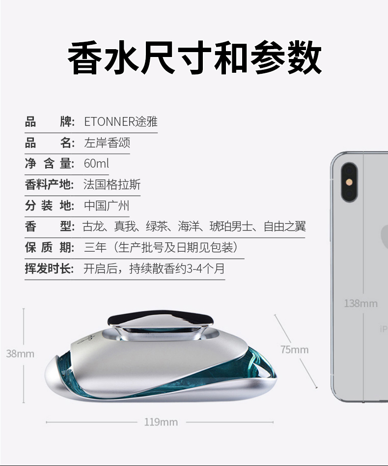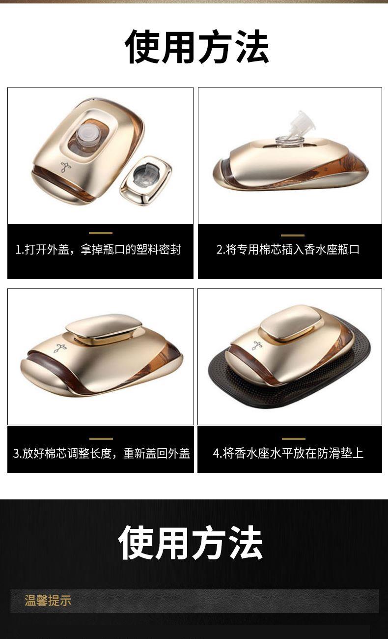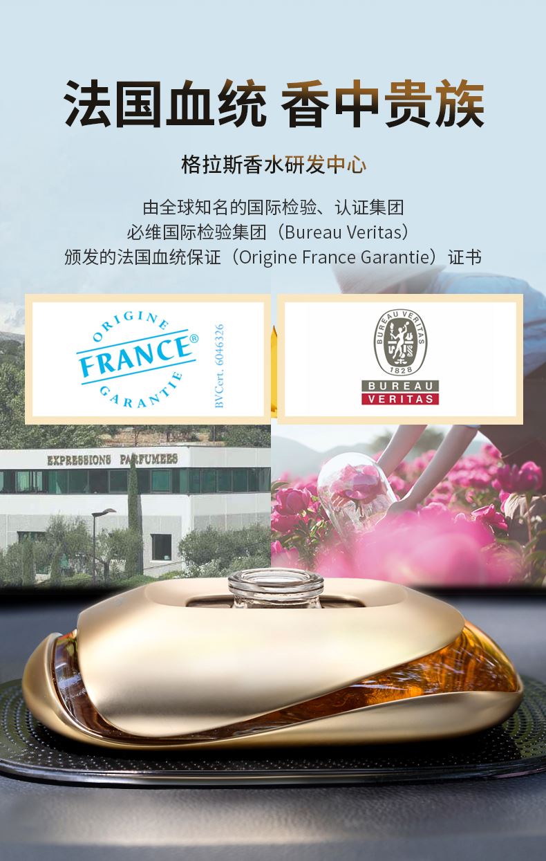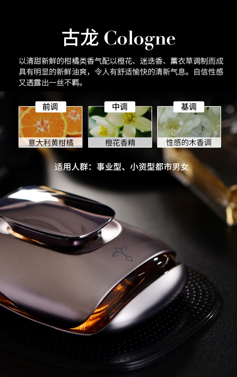 产品标配: 金属香水座装60ML香水,纳米防滑垫、闻香瓶1套(6支)、礼品盒+礼品袋 卖点: 1、香料由深耕行业30余年的法国格拉斯EP集团直供优质香料。 2、VI:由意大利设计师Russell Haines设计。 3、外观设计:由红点奖得主Valerie Normain设计的香水瓶外观。 4、工艺:采用珠宝级锻造工艺 5、我们注重品质与服务,库存稳定,发货快,定制快。欢迎新老客户放心推。 拿在手里沉甸甸的,放在车里很显品位。非常适合所求品质生活的客户群体。 一个起,免费加LOGO、车标 途雅秉持简洁、优雅、时尚、浪漫、自由的生活主张,助力经销商撬动车载家居香氛市场,轻松俘获追求品质生活的消费群体 产品设计灵感:法国有着世界瞩目的物质遗产,更有无形而伟大的艺术声望。在塞纳河左岸的咖啡馆里,邂逅一瓶深情浪漫的法国香水,淡淡的法国情调会将你深深萦绕……