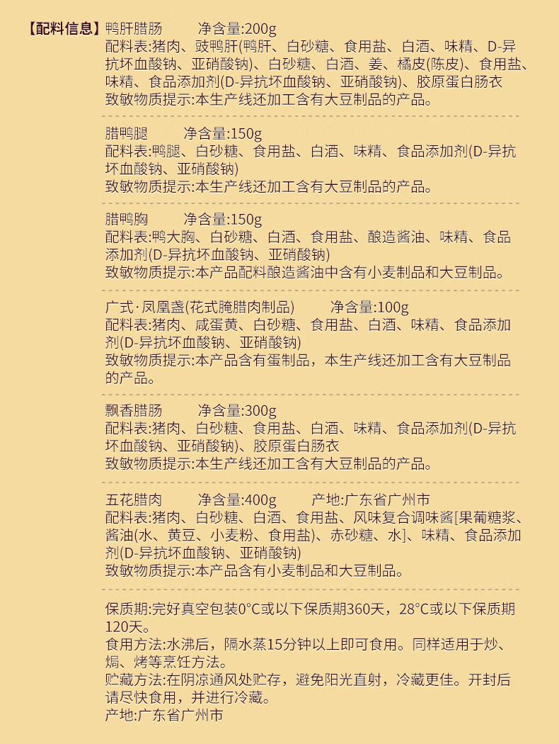 产地:广东 特产品类:广式腊肠 口味:原味 食用方法:烹饪食用 加工工艺:烘干 保质期:120天 内容物:(鸭肝腊肠200g、腊鸭腿150g、腊鸭胸150g、广式·凤凰盏100g、飘香腊肠 300g、五花腊肉 400g)