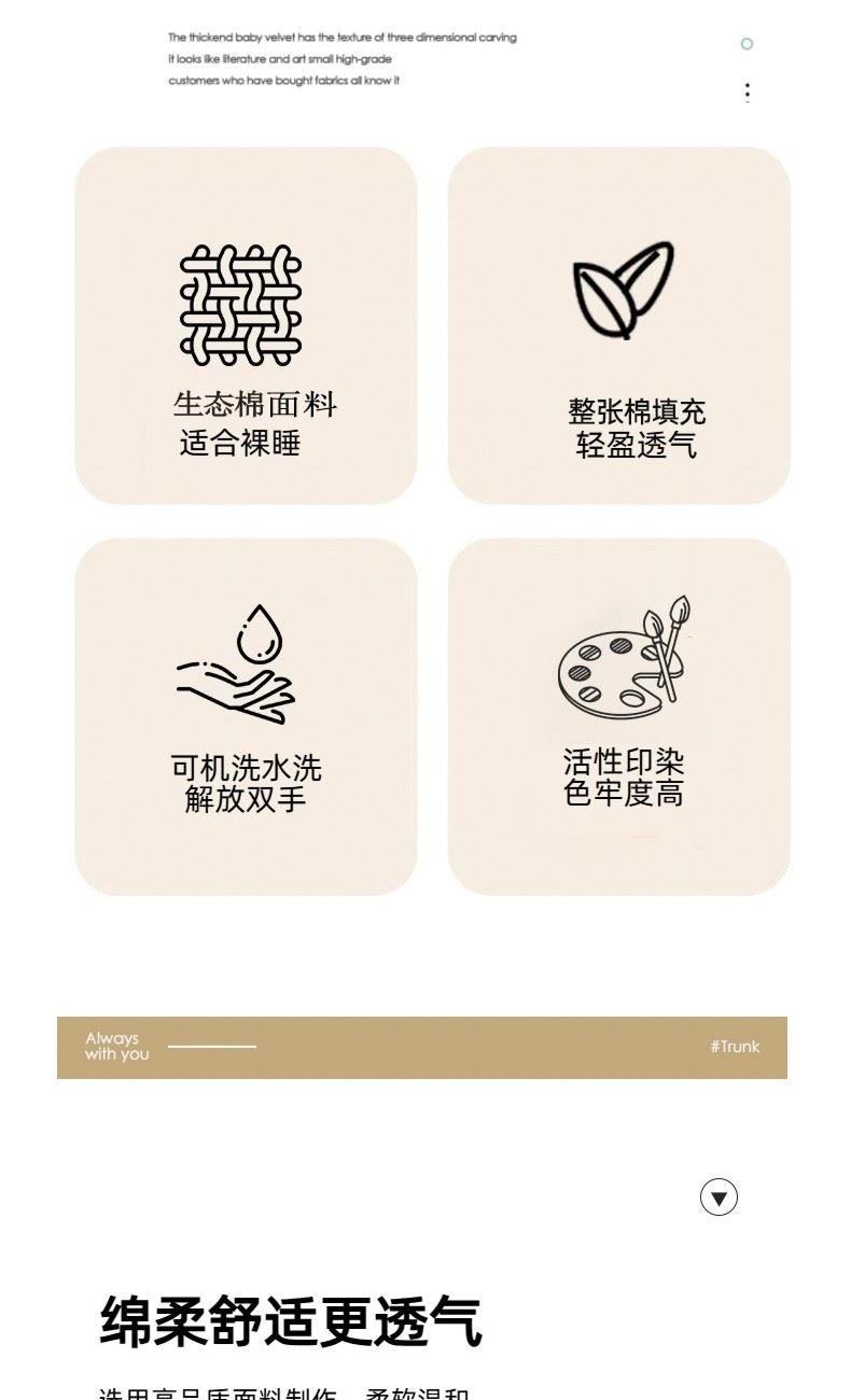 货 号:BGM-B2601 规 格:150*200cm 面料成份:生态磨棉 克 重:650g 填充物:竹炭棉 此款被子填充物采用竹炭棉,能有效抑制细菌滋生,同时吸附异味,给肌肤更洁净的睡眠环境。 亲肤透气:面料为生态磨棉,触感柔软细腻,吸湿透气,不闷汗,适合春夏季节使用。