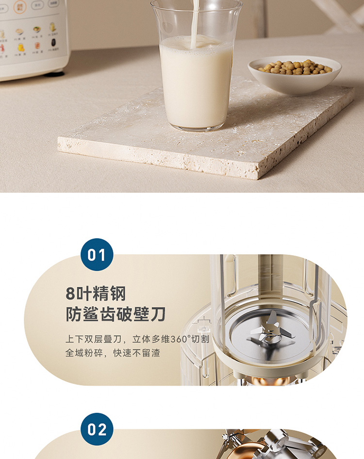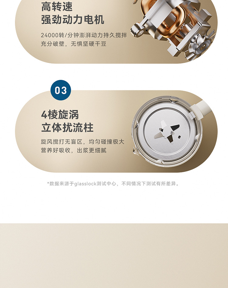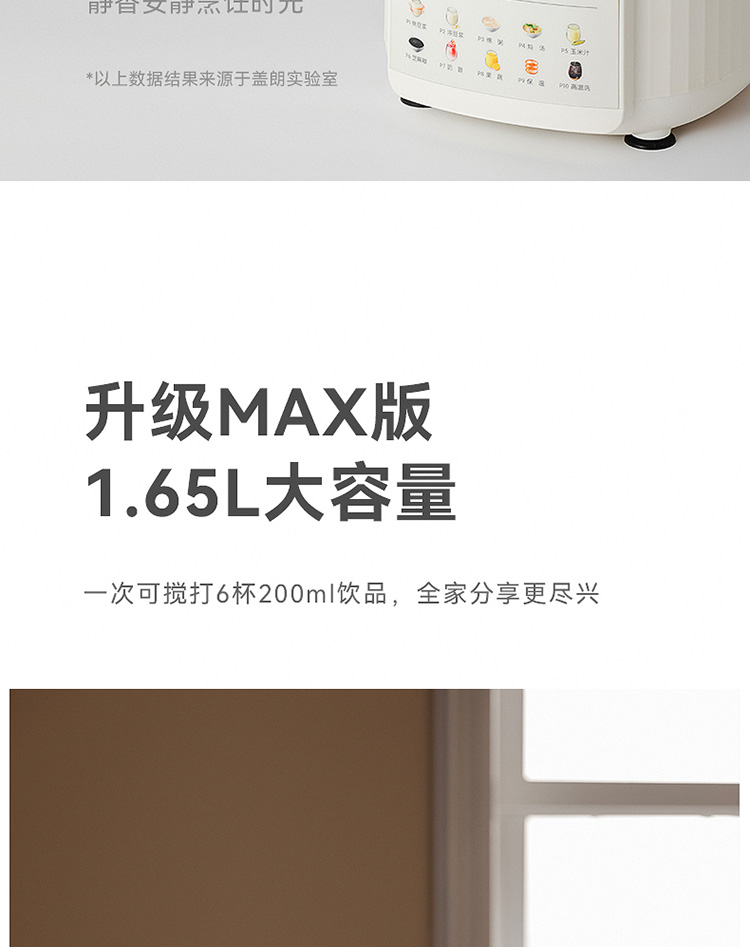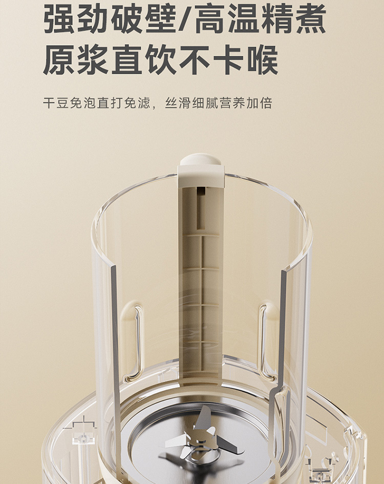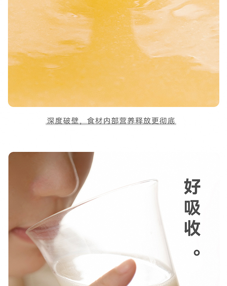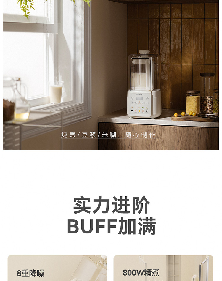 加热功率:800W 搅拌功率:400W 杯体容量:1.65L 8叶精钢切割刀头,粉碎食材免滤渣 一键高温自洁 8重降噪,低音破壁不扰人 24000转/分钟,轻松破壁不卡刀 分体式设计,安全轻盈,拿取方便 4棱漩涡立体扰流柱,出浆更细腻 10大功能菜单,一键制作美味料理 24小时智能预约,搅打免看管