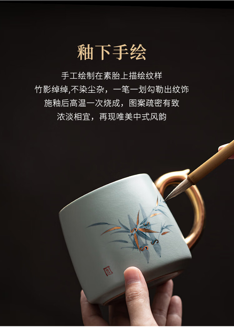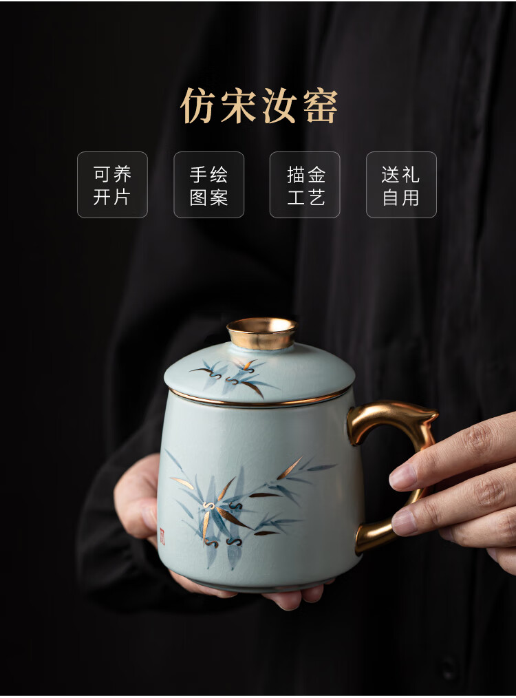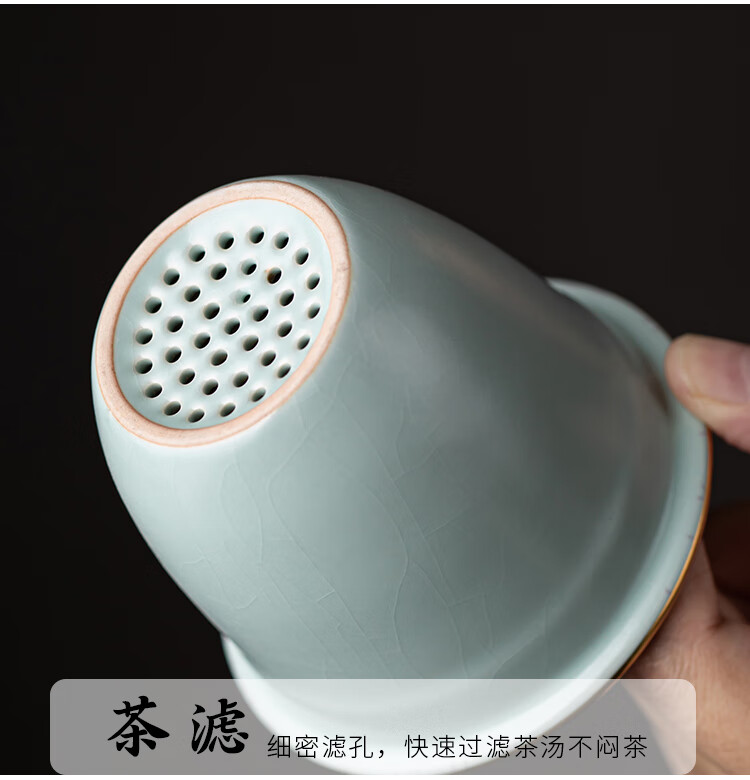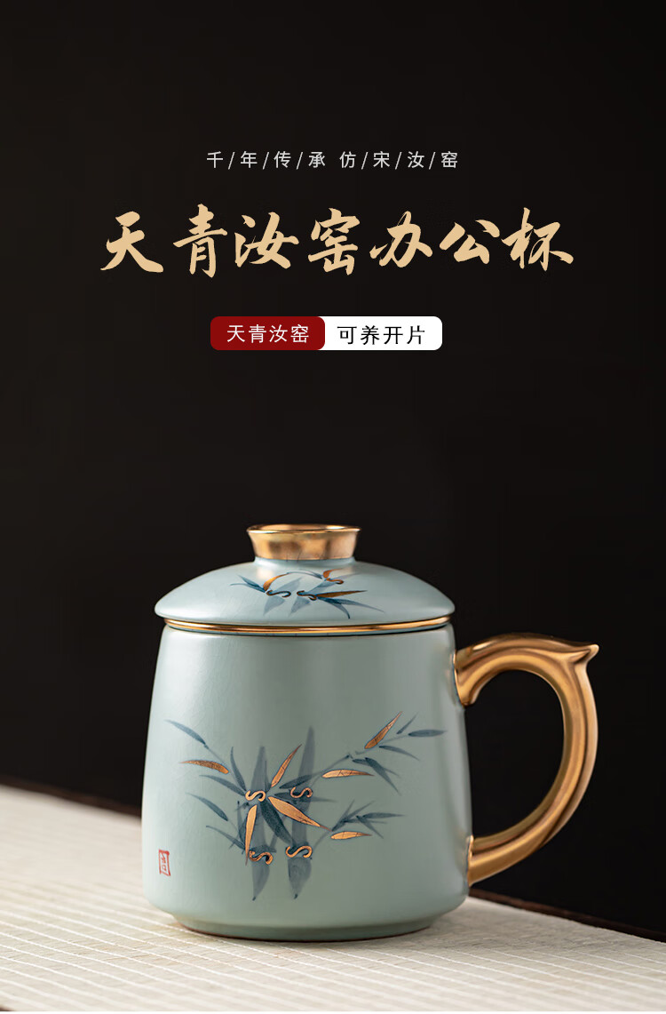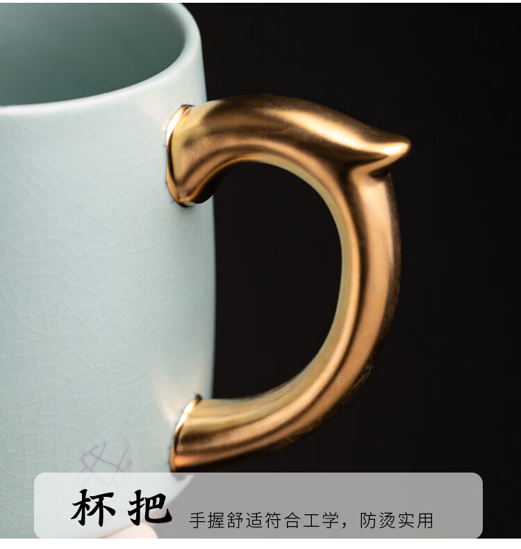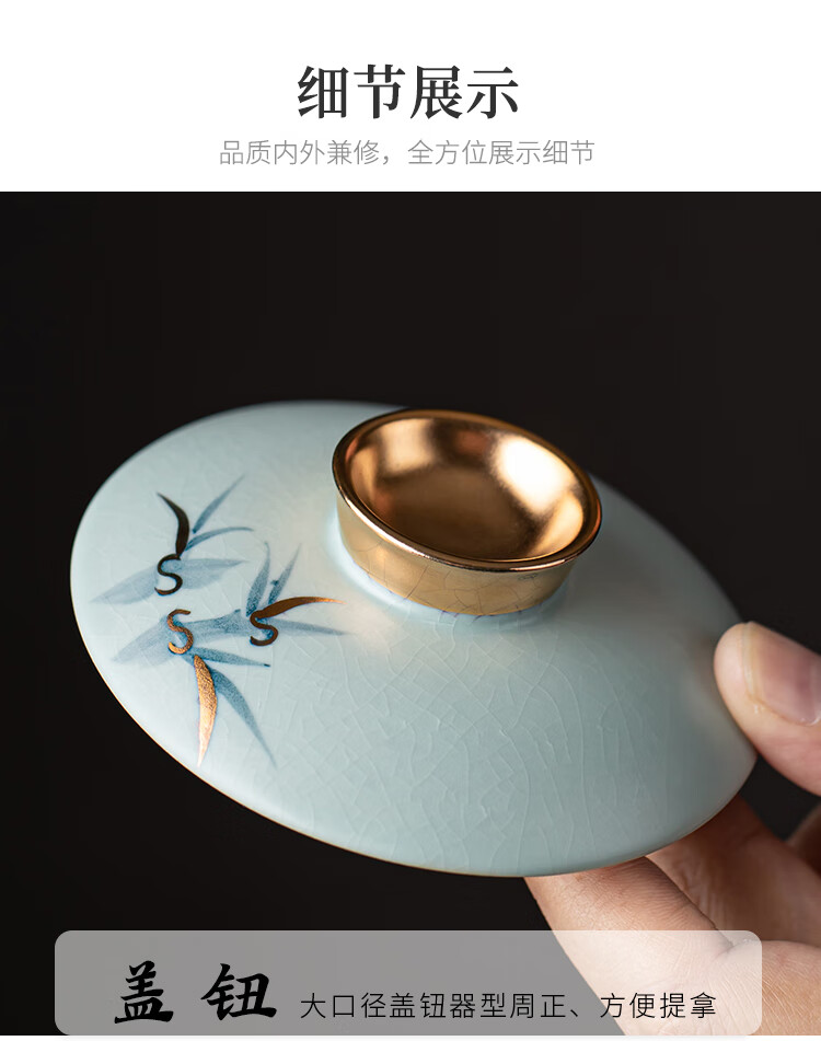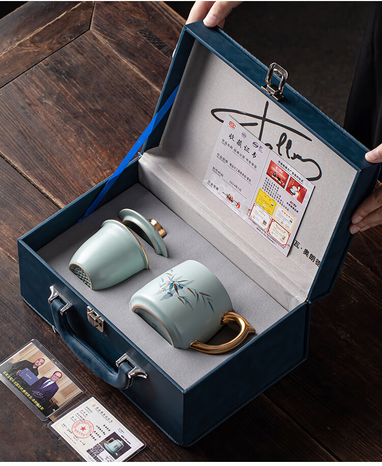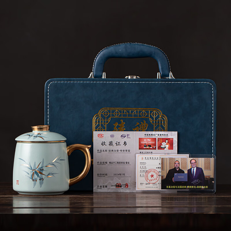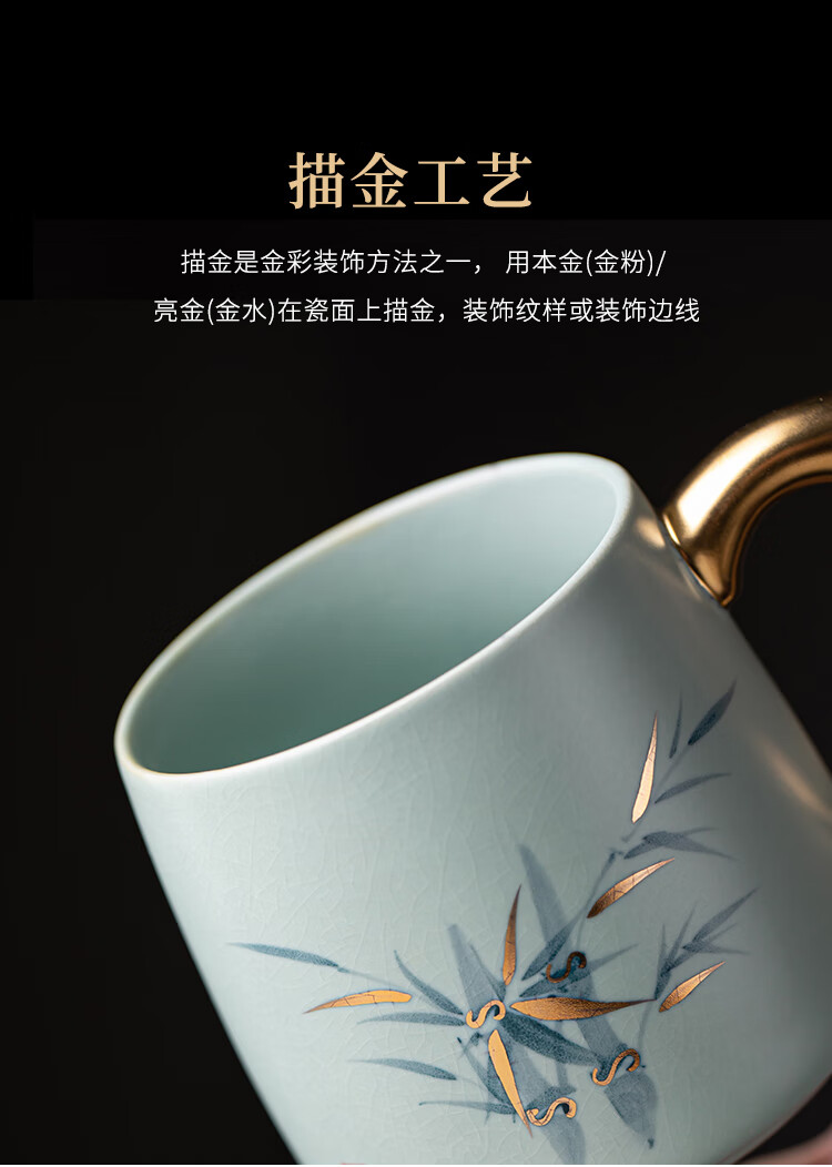 天青汝窑 可养开片 名家手绘 描金工艺 经典器型 茶水分离 图案雅致 礼赠佳品 材质:陶瓷 个数 1个 工艺 :高温烧制 配置清单 茶杯*1 证书*1 礼盒*1