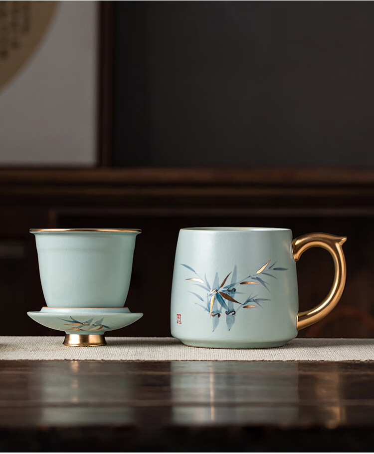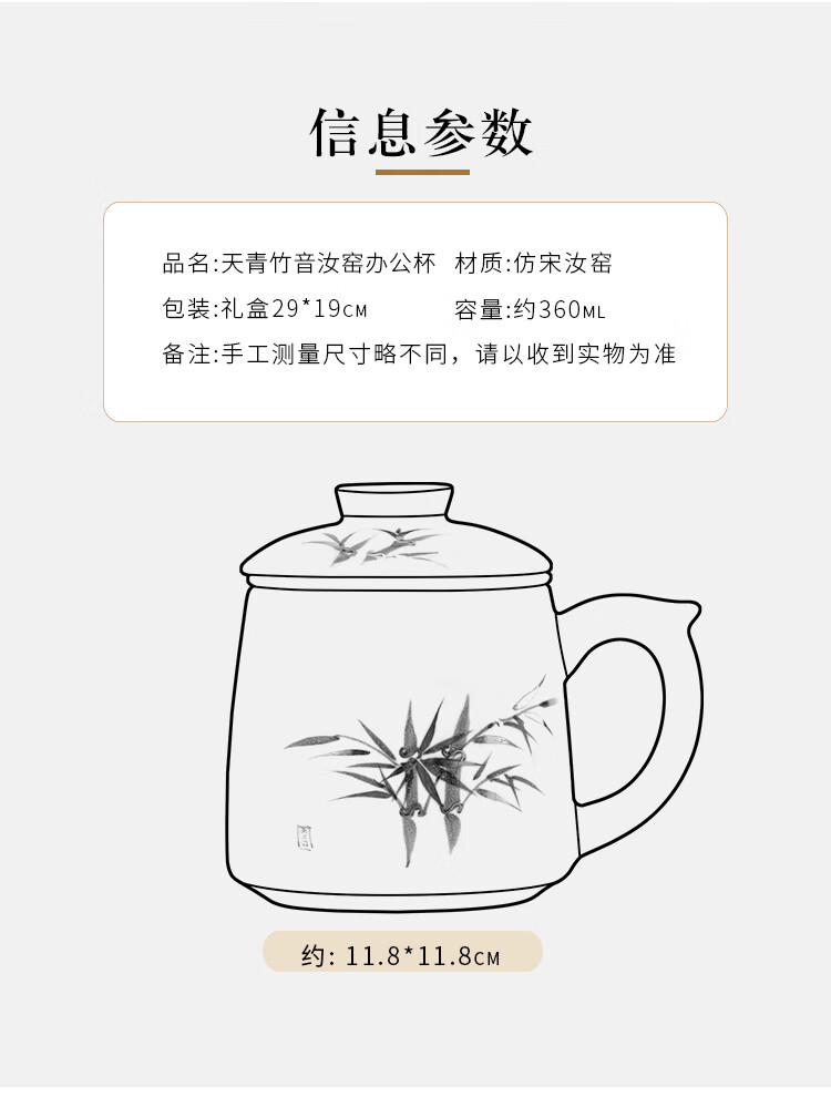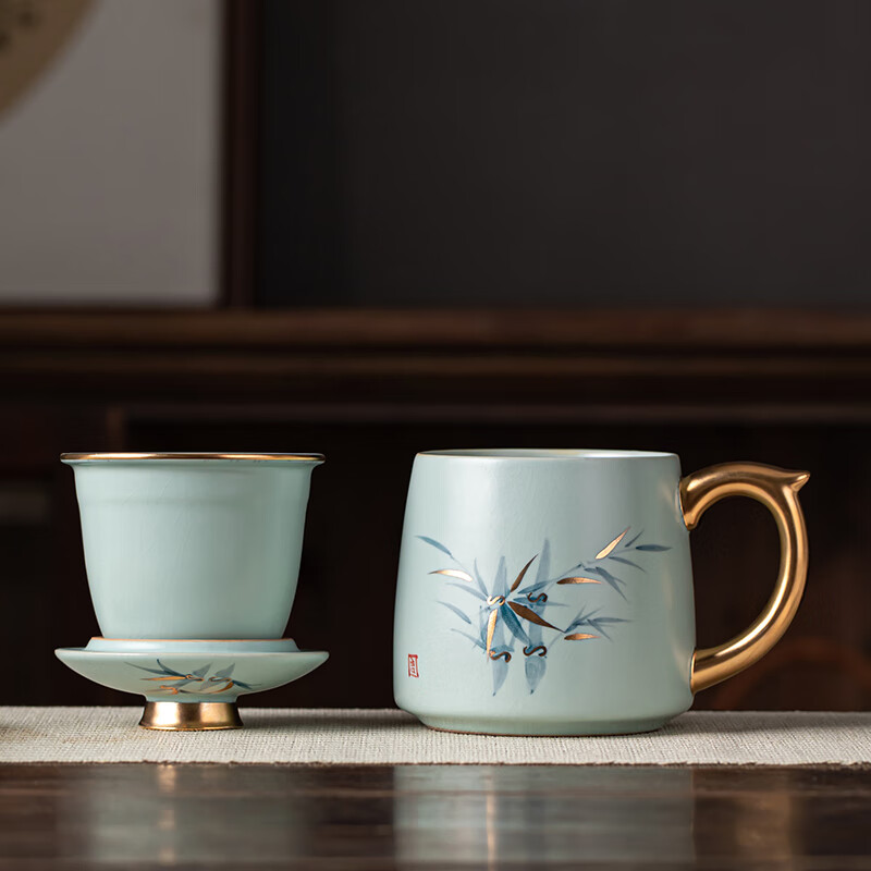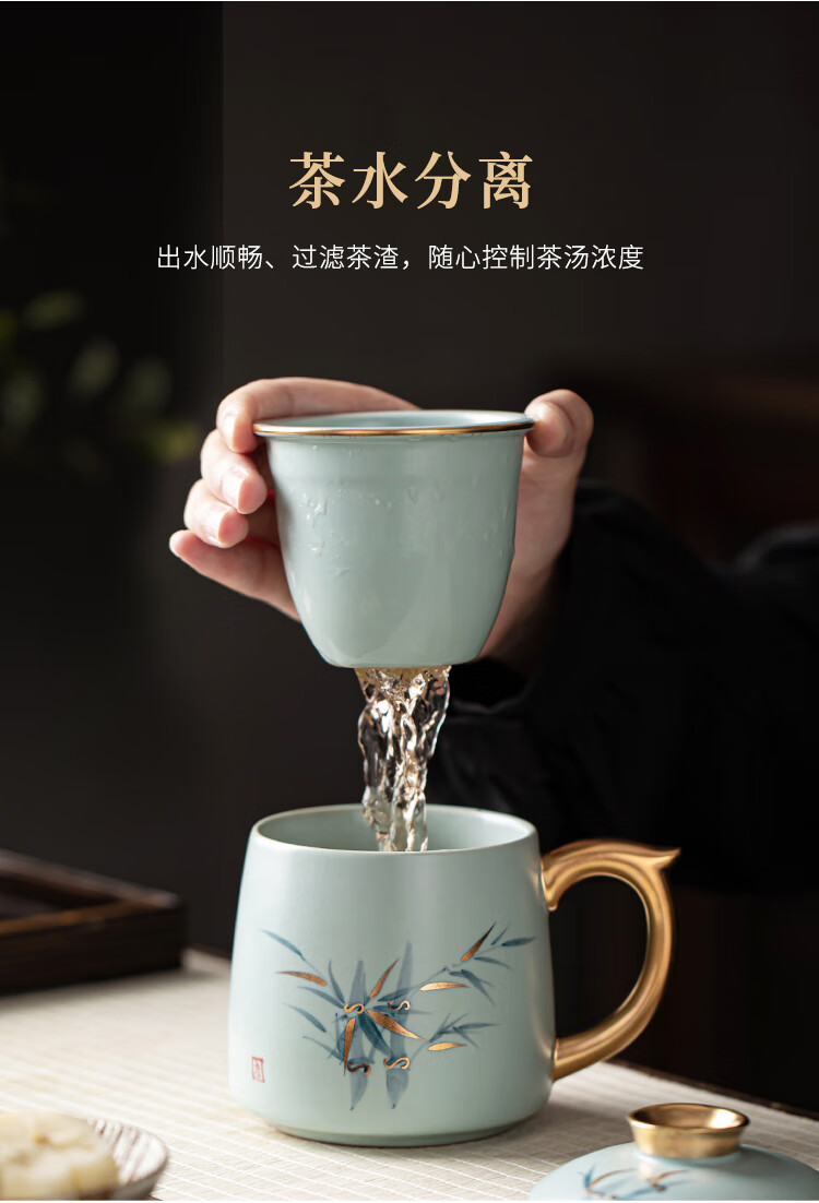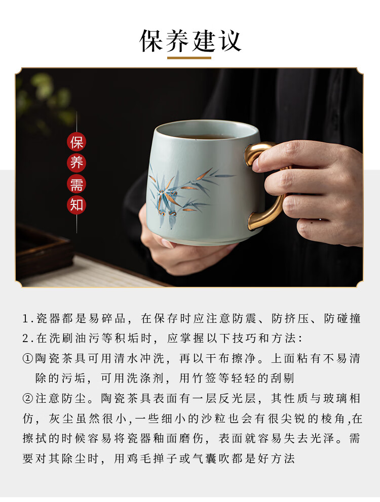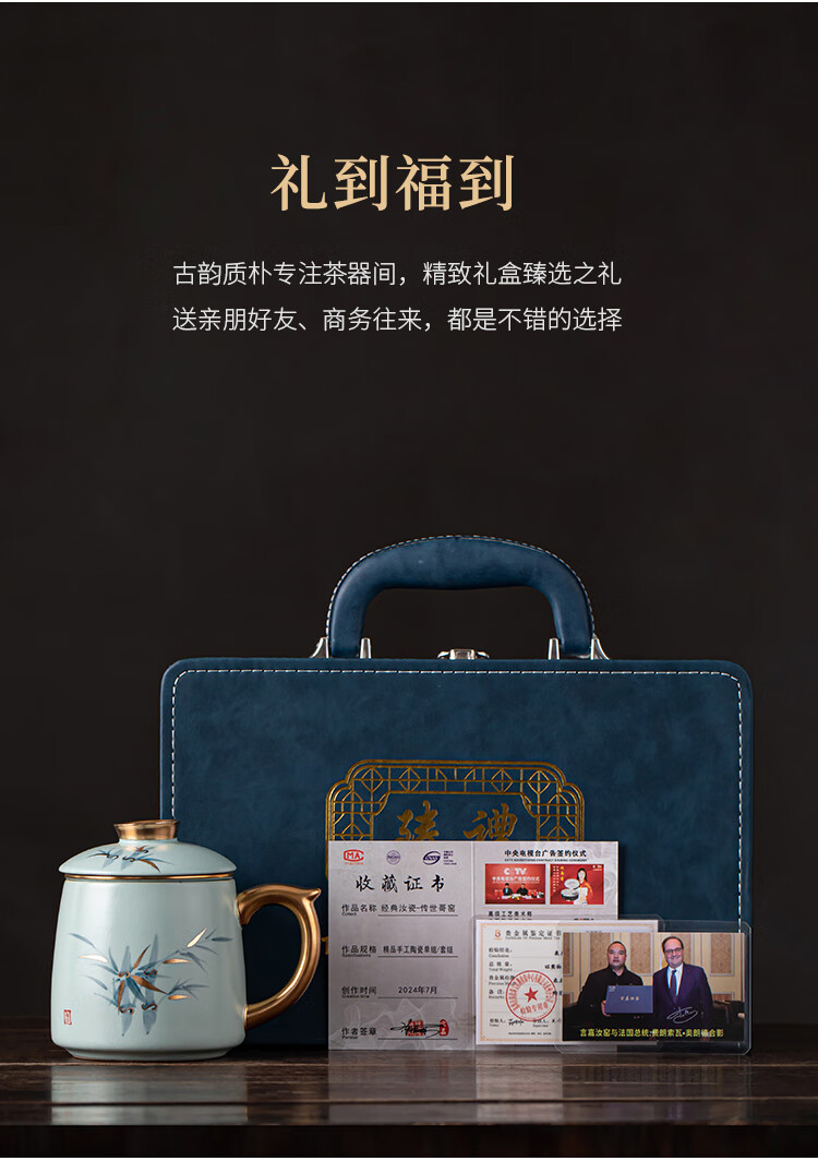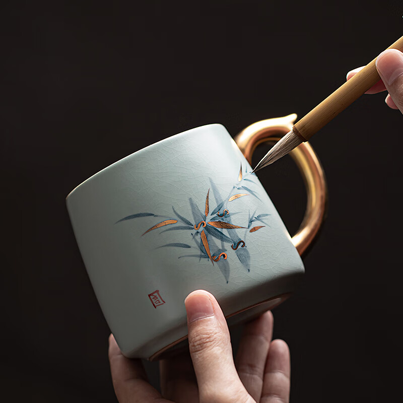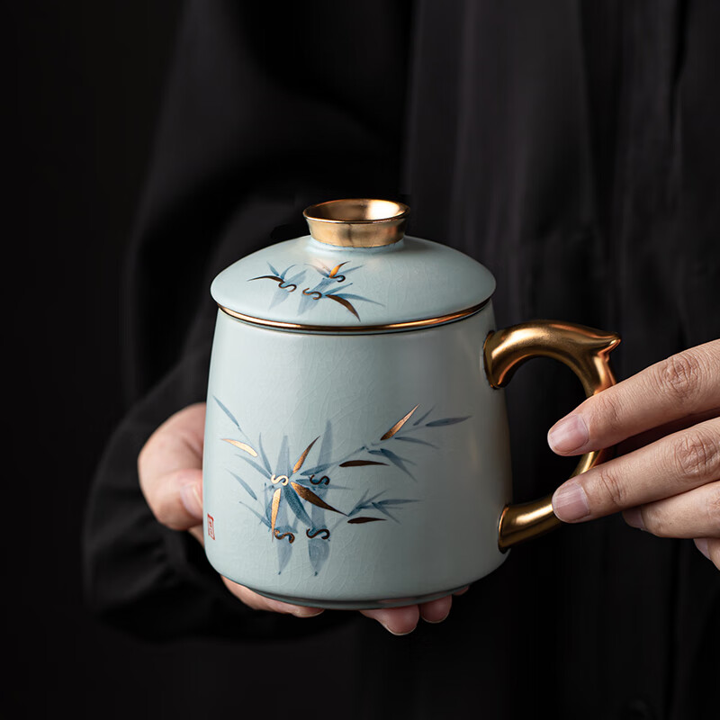 天青汝窑 可养开片 名家手绘 描金工艺 经典器型 茶水分离 图案雅致 礼赠佳品 材质:陶瓷 个数 1个 工艺 :高温烧制 配置清单 茶杯*1 证书*1 礼盒*1