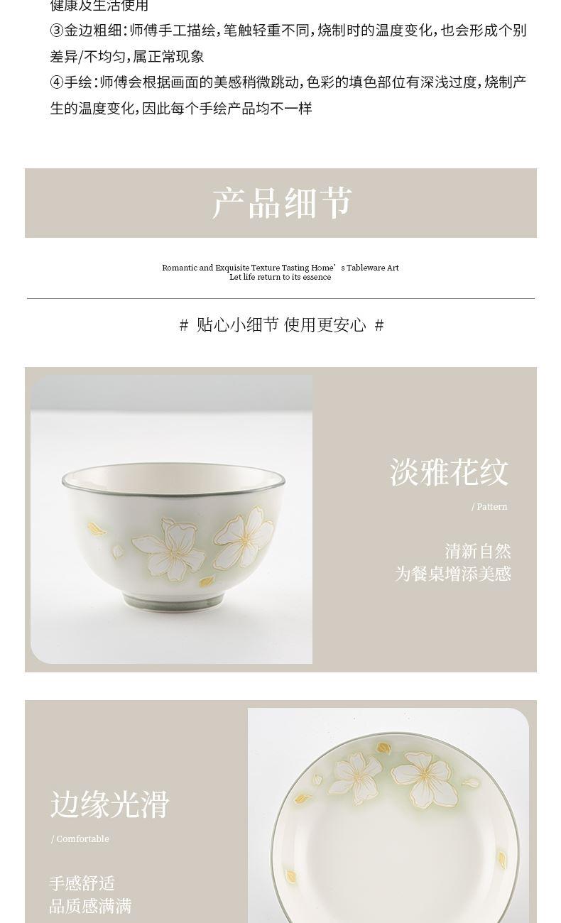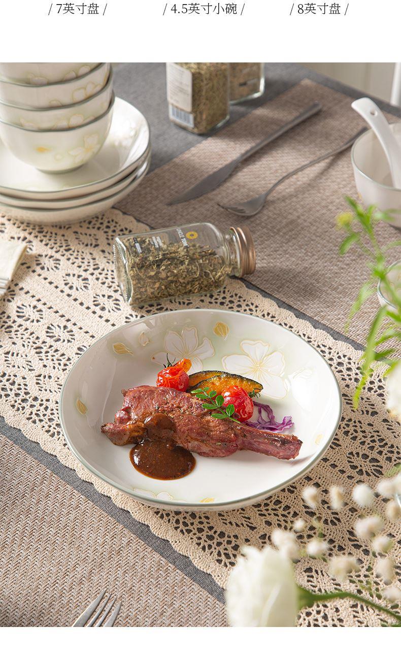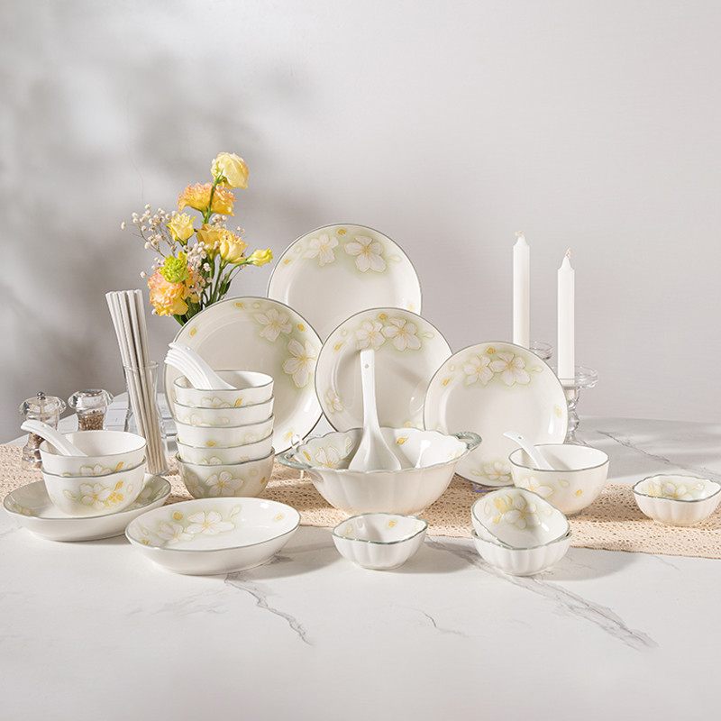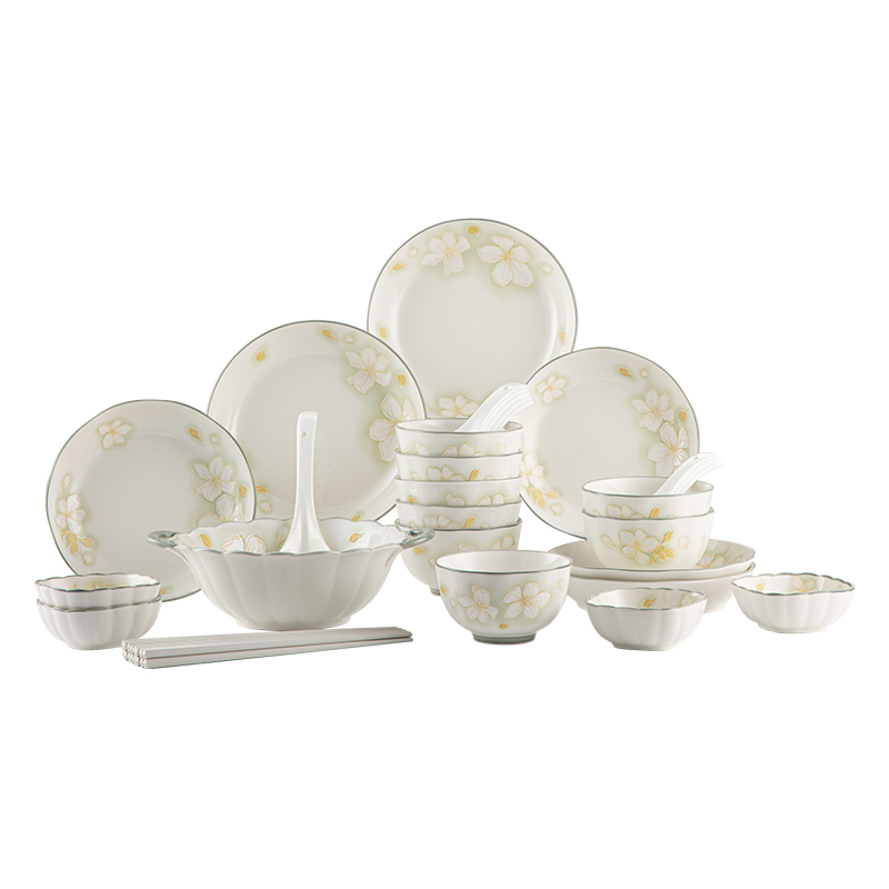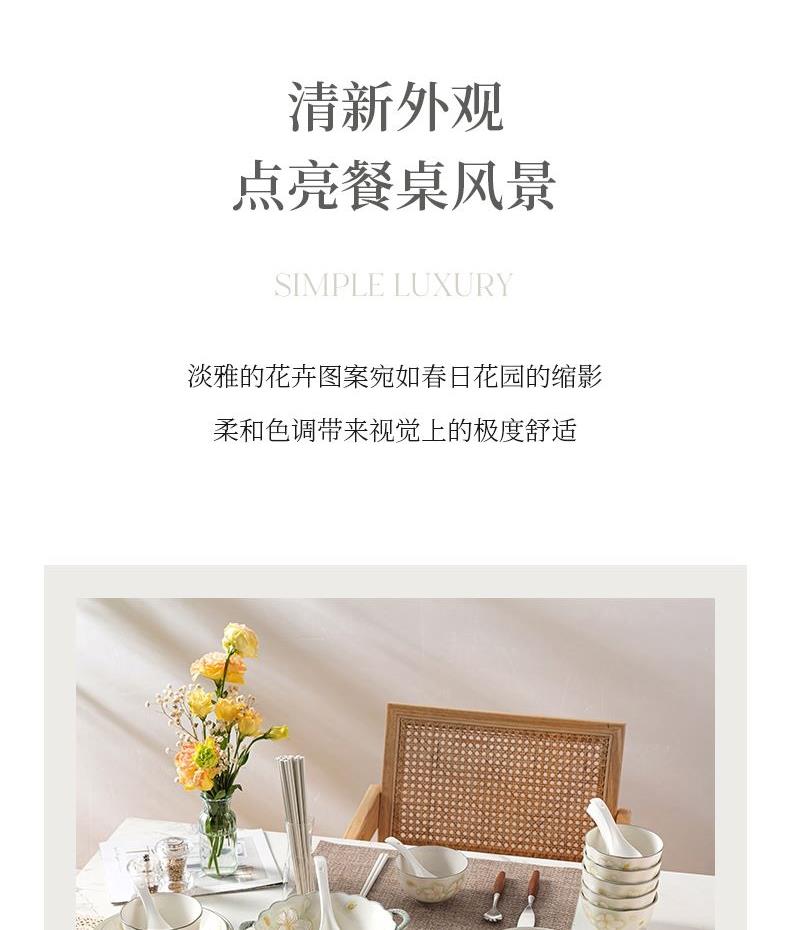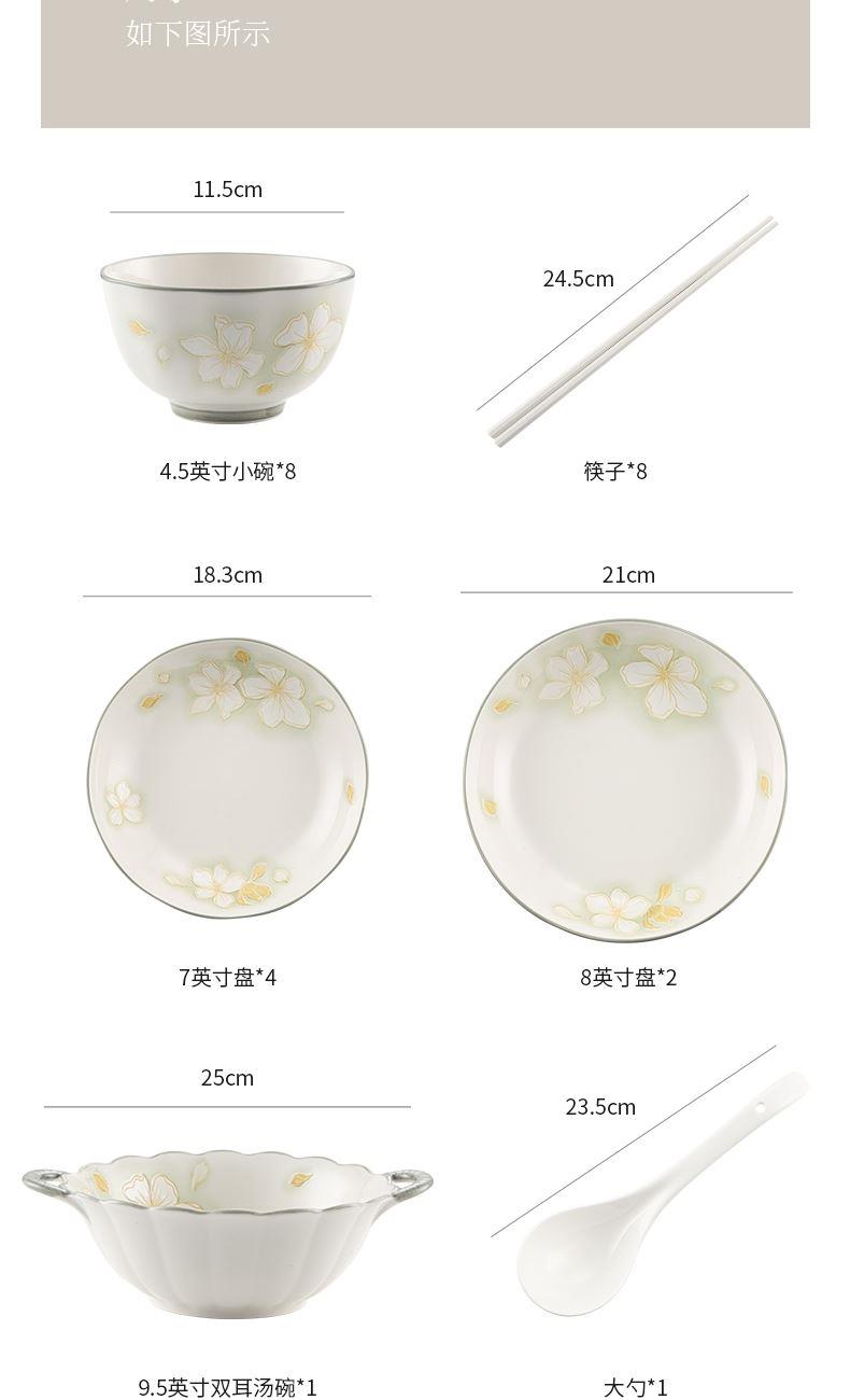 4.5英寸小碗x8 7英寸盘x4 8英寸盘x2 9.5英寸双耳汤碗x1 4英寸蘸酱碟子x4 大勺x1 小勺子x8 筷子x8 经历1300℃高温烧制,不含铅铬等有害物质,为您的饮食安全保驾护航。 独特的釉下彩工艺将花色嵌入釉层下方,经久耐磨不掉色,历久而弥新。 浮雕花纸设计在提升产品格调同时又能防烫防滑。 花面采用清新淡雅的田园风格,实用性与美学间达成平衡,让每一次用餐都成为亲近自然的体验。