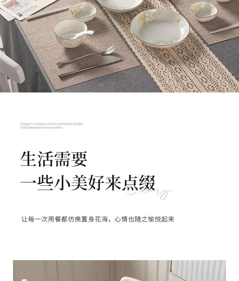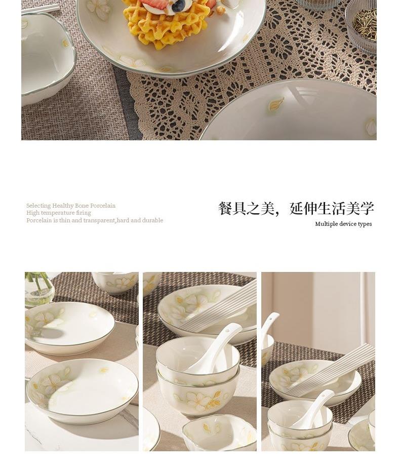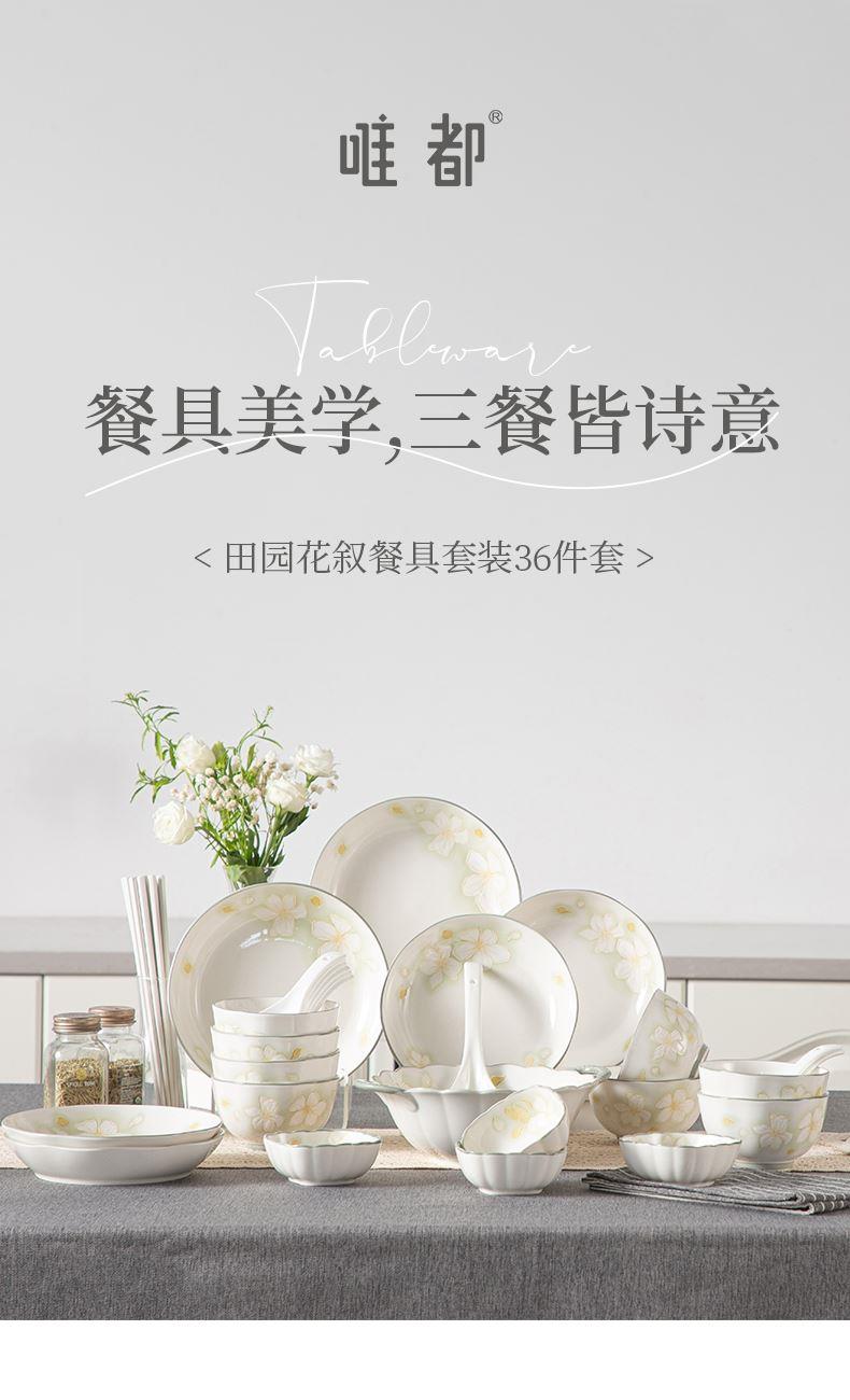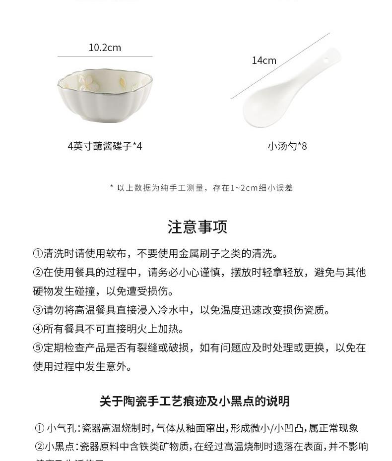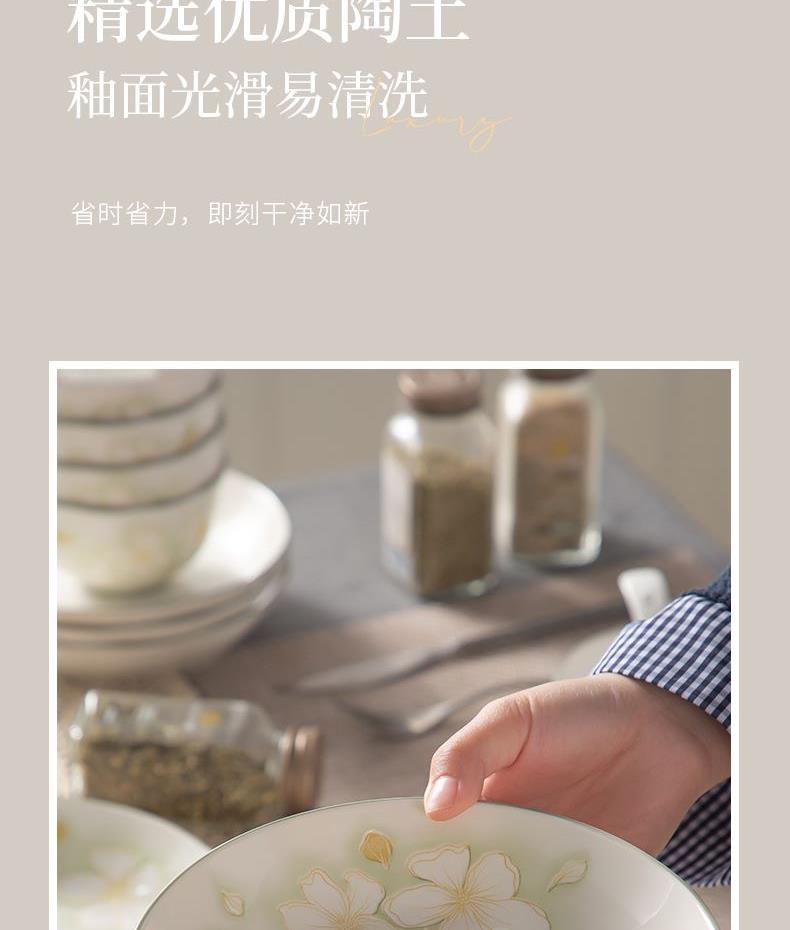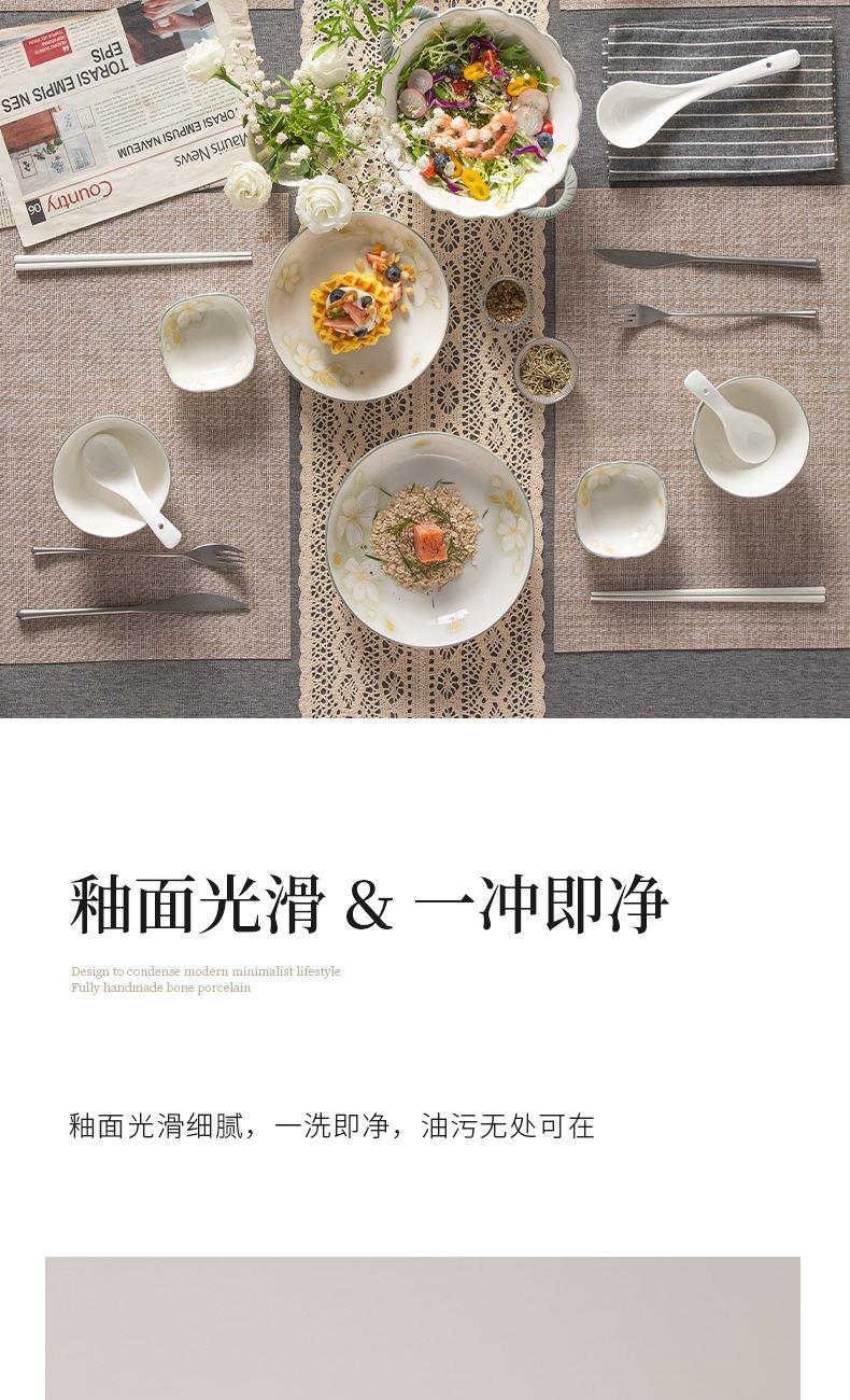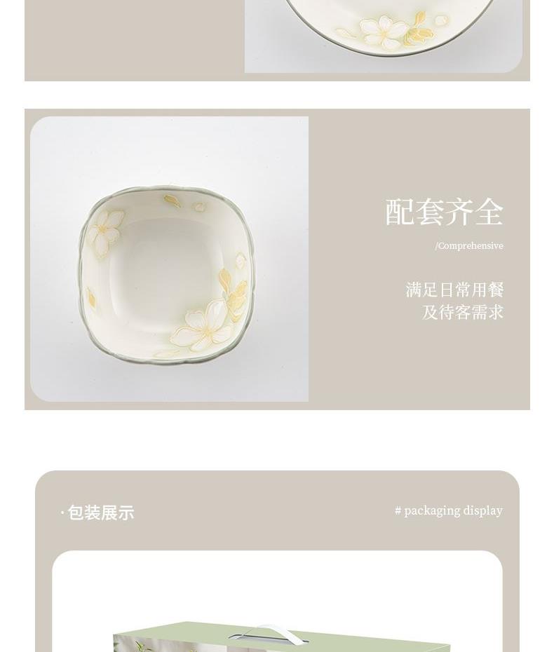 4.5英寸小碗x8 7英寸盘x4 8英寸盘x2 9.5英寸双耳汤碗x1 4英寸蘸酱碟子x4 大勺x1 小勺子x8 筷子x8 经历1300℃高温烧制,不含铅铬等有害物质,为您的饮食安全保驾护航。 独特的釉下彩工艺将花色嵌入釉层下方,经久耐磨不掉色,历久而弥新。 浮雕花纸设计在提升产品格调同时又能防烫防滑。 花面采用清新淡雅的田园风格,实用性与美学间达成平衡,让每一次用餐都成为亲近自然的体验。