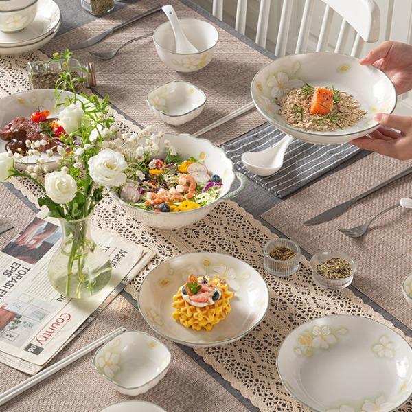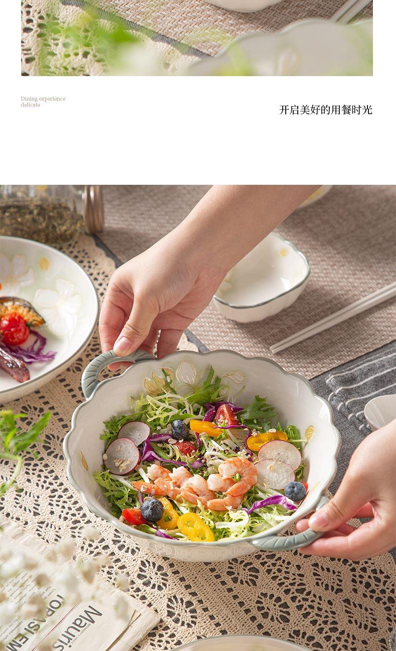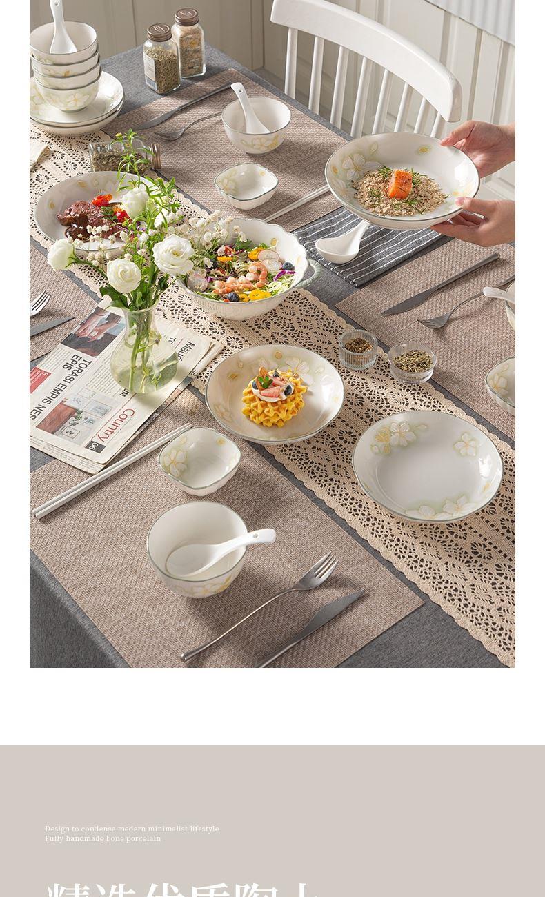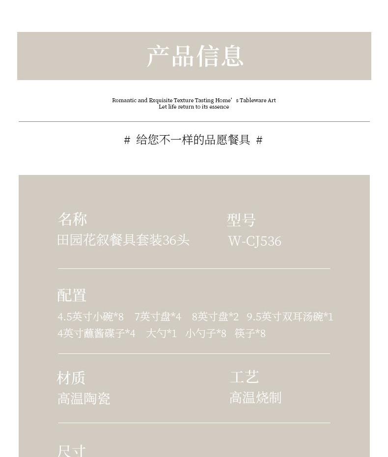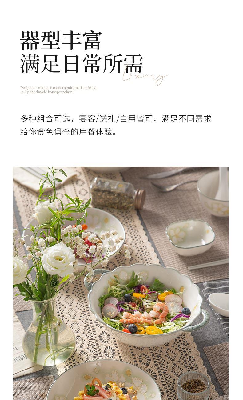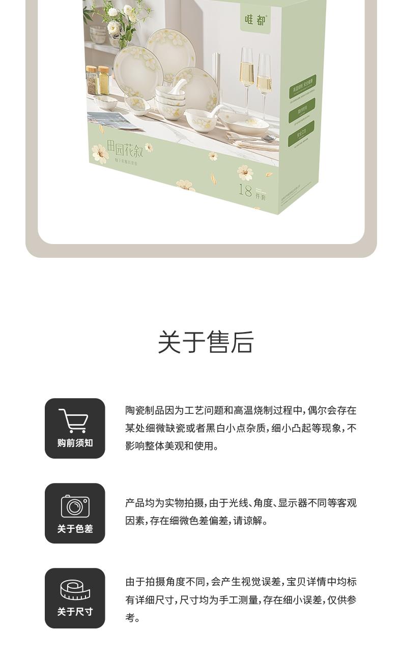 4.5英寸小碗x8 7英寸盘x4 8英寸盘x2 9.5英寸双耳汤碗x1 4英寸蘸酱碟子x4 大勺x1 小勺子x8 筷子x8 经历1300℃高温烧制,不含铅铬等有害物质,为您的饮食安全保驾护航。 独特的釉下彩工艺将花色嵌入釉层下方,经久耐磨不掉色,历久而弥新。 浮雕花纸设计在提升产品格调同时又能防烫防滑。 花面采用清新淡雅的田园风格,实用性与美学间达成平衡,让每一次用餐都成为亲近自然的体验。