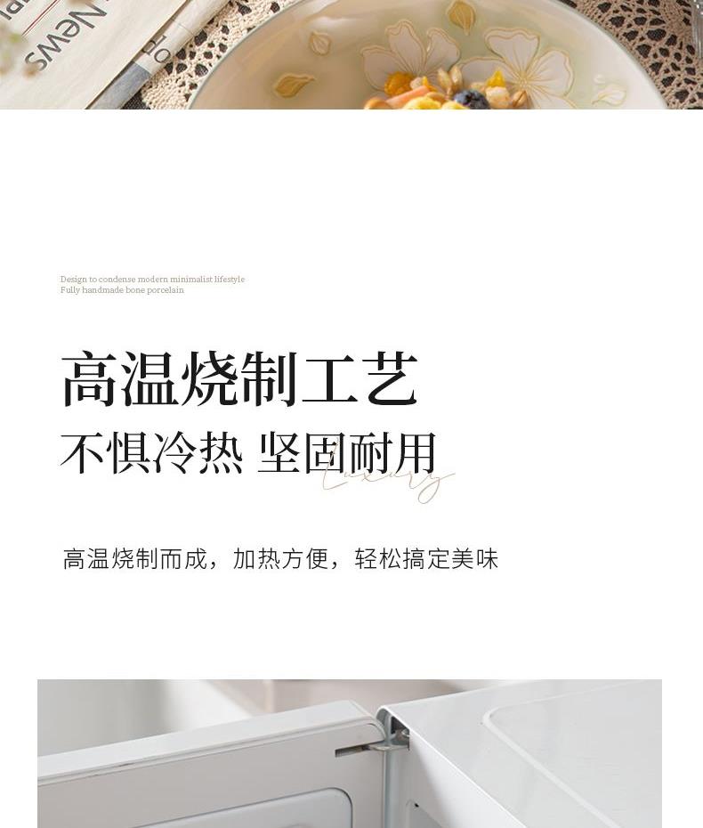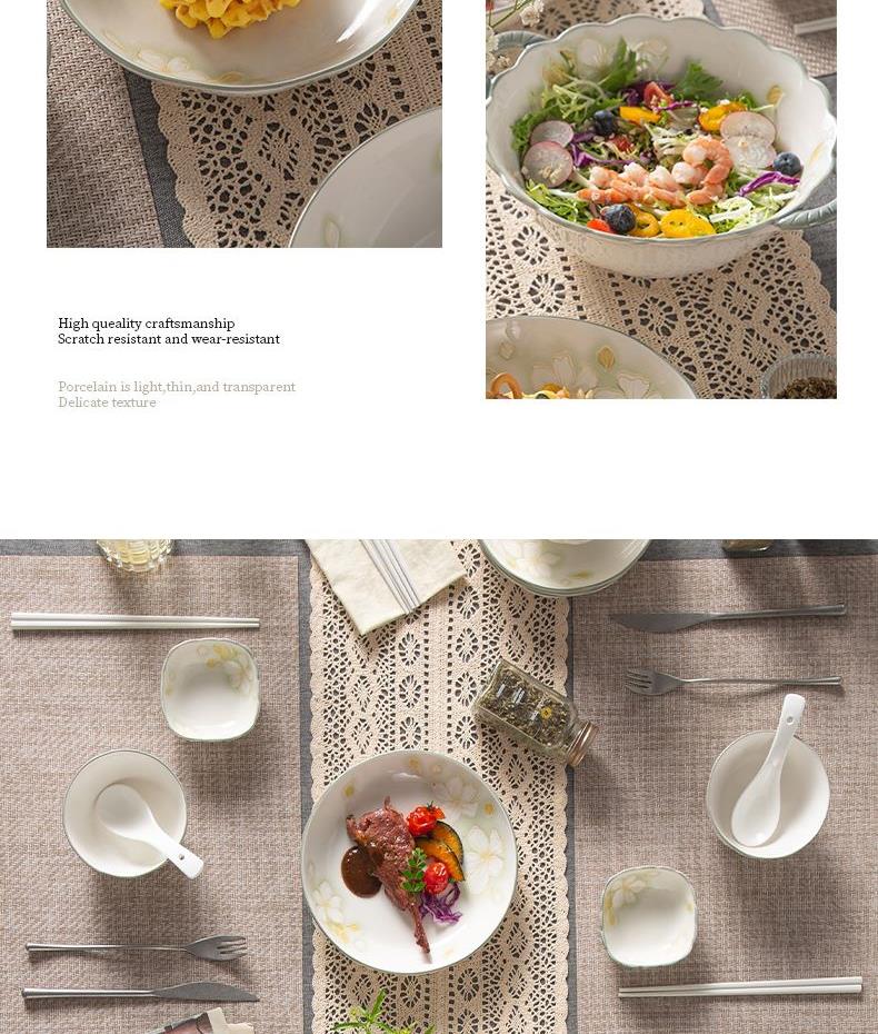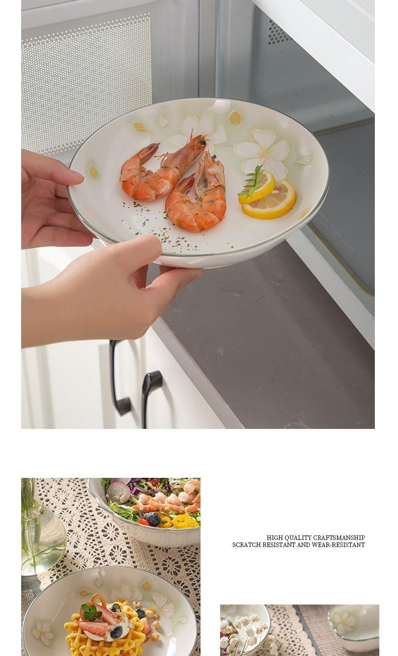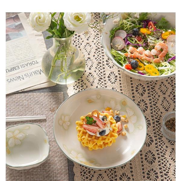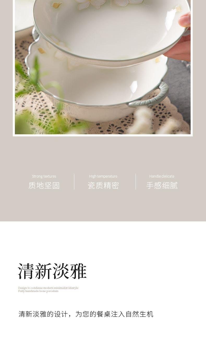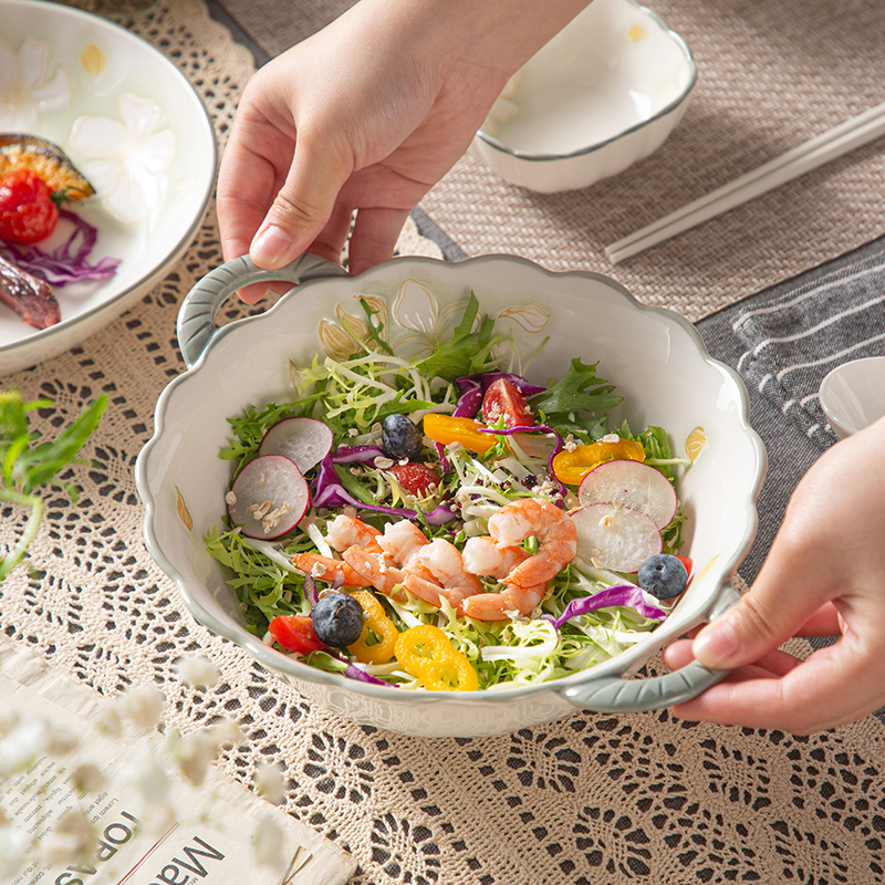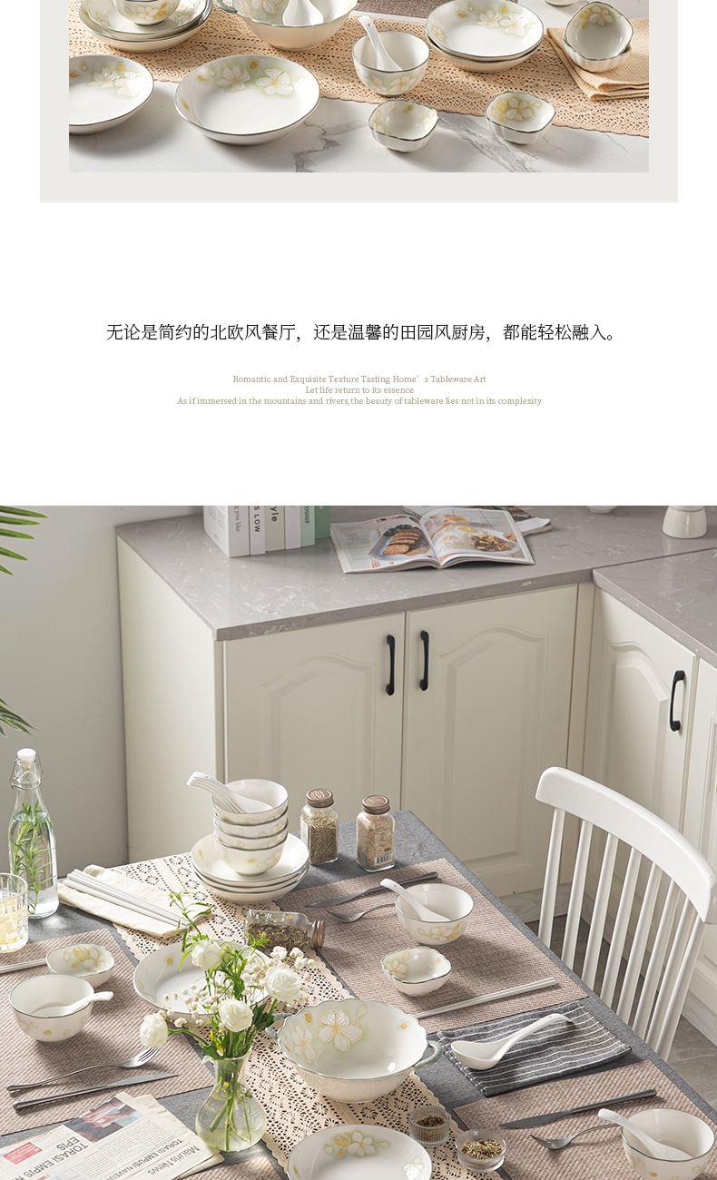 4.5英寸小碗x8 7英寸盘x4 8英寸盘x2 9.5英寸双耳汤碗x1 4英寸蘸酱碟子x4 大勺x1 小勺子x8 筷子x8 经历1300℃高温烧制,不含铅铬等有害物质,为您的饮食安全保驾护航。 独特的釉下彩工艺将花色嵌入釉层下方,经久耐磨不掉色,历久而弥新。 浮雕花纸设计在提升产品格调同时又能防烫防滑。 花面采用清新淡雅的田园风格,实用性与美学间达成平衡,让每一次用餐都成为亲近自然的体验。