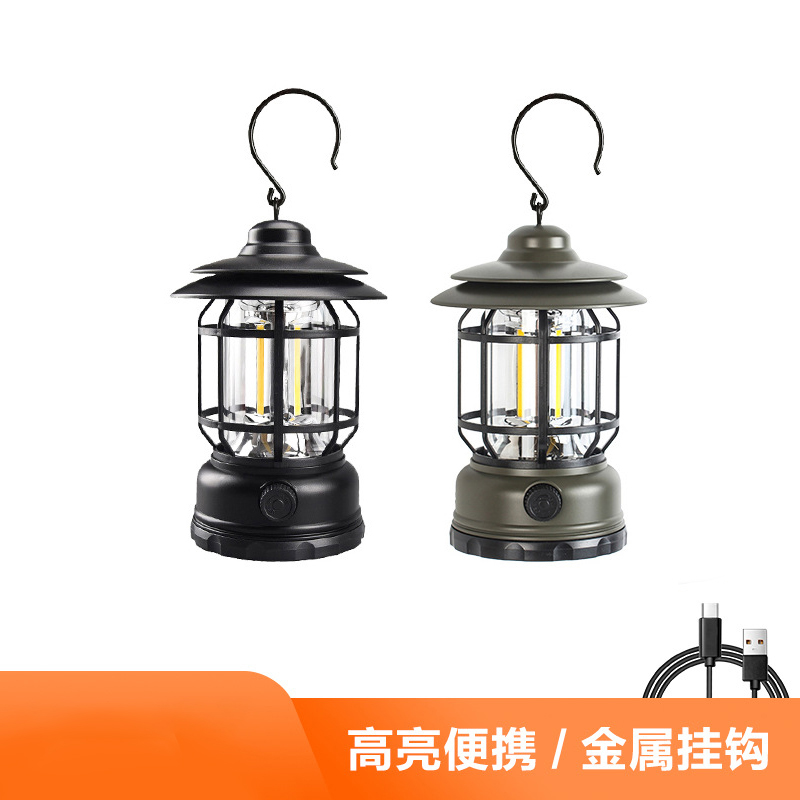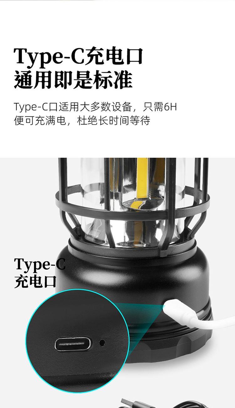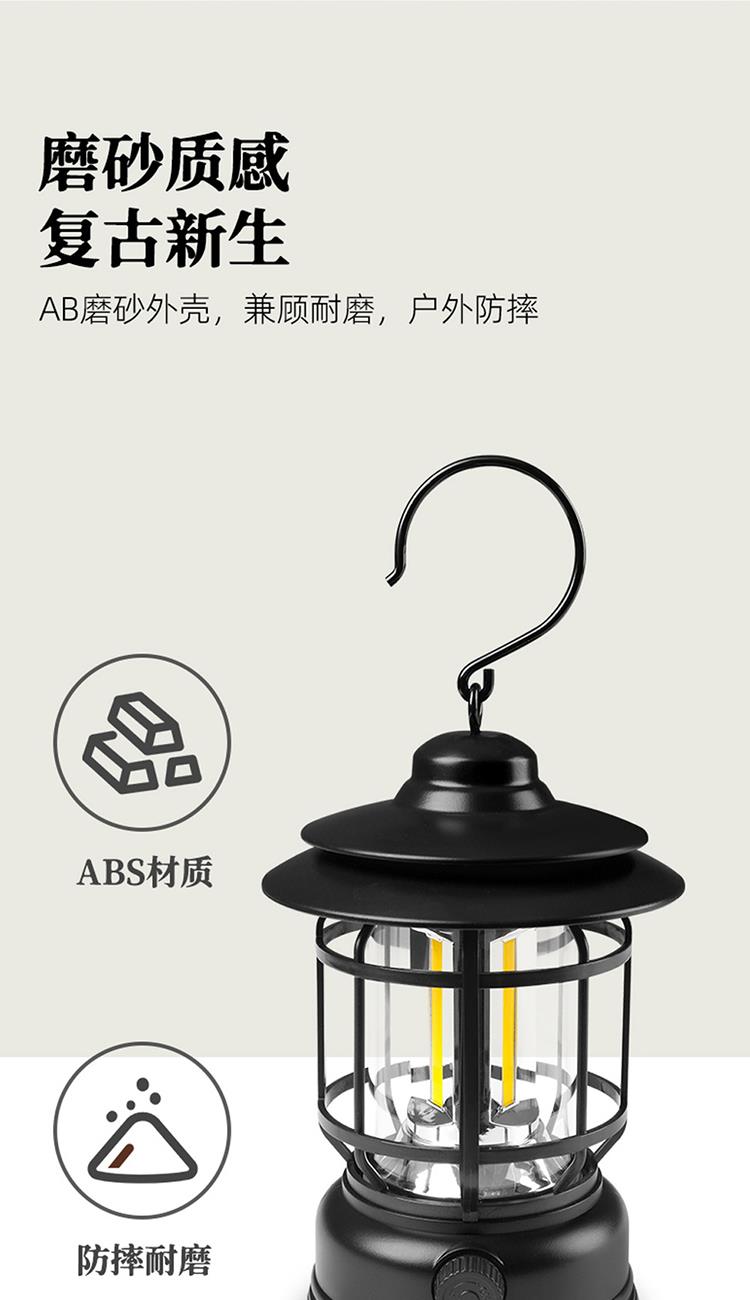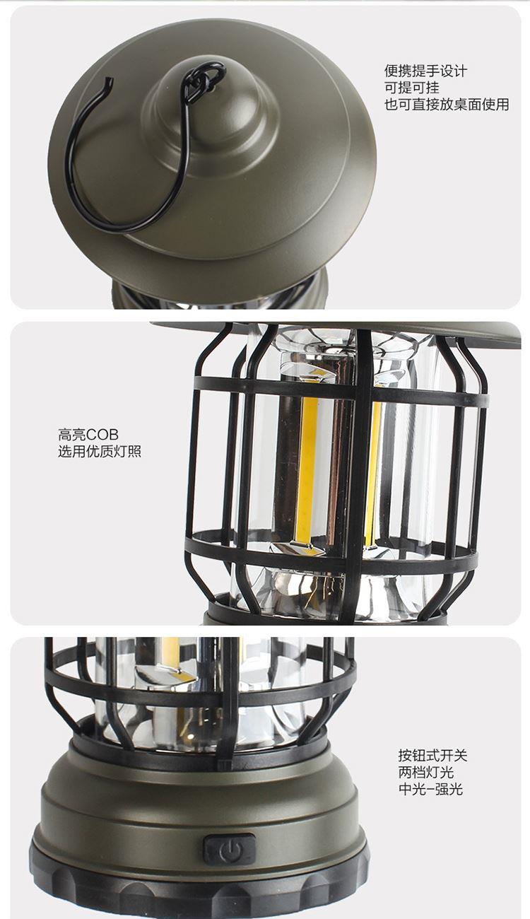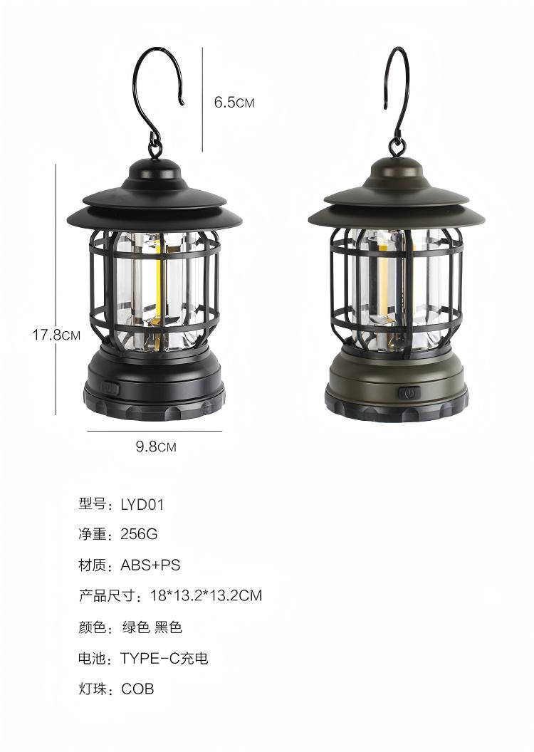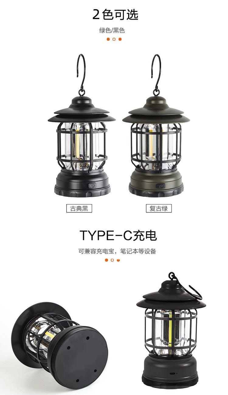 材质:ABS+PS 展开尺寸:9.5*18.5cm 电池:1200mAh锂电池 -TYPE-C充电 充电方式:USB充电 续航:3-6小时 颜色:复古绿、曜石黑 净重:0.25kg 1、便携提手设计,可提可挂; 2、1200毫安锂电池,持久续航3-6小时; 3、高亮COB灯珠,选用优质灯罩; 4、磨砂质感,复古新生; 5、防水性能好,阴雨天户外也可用;