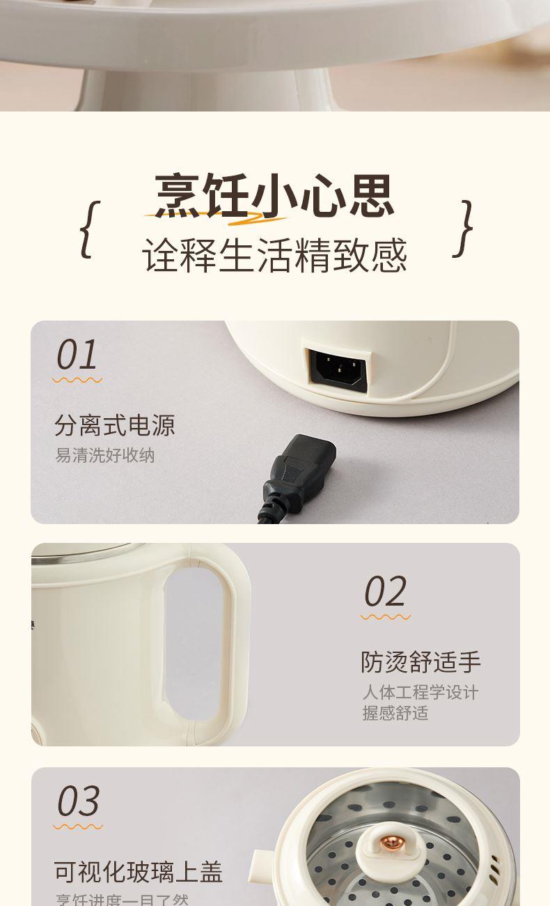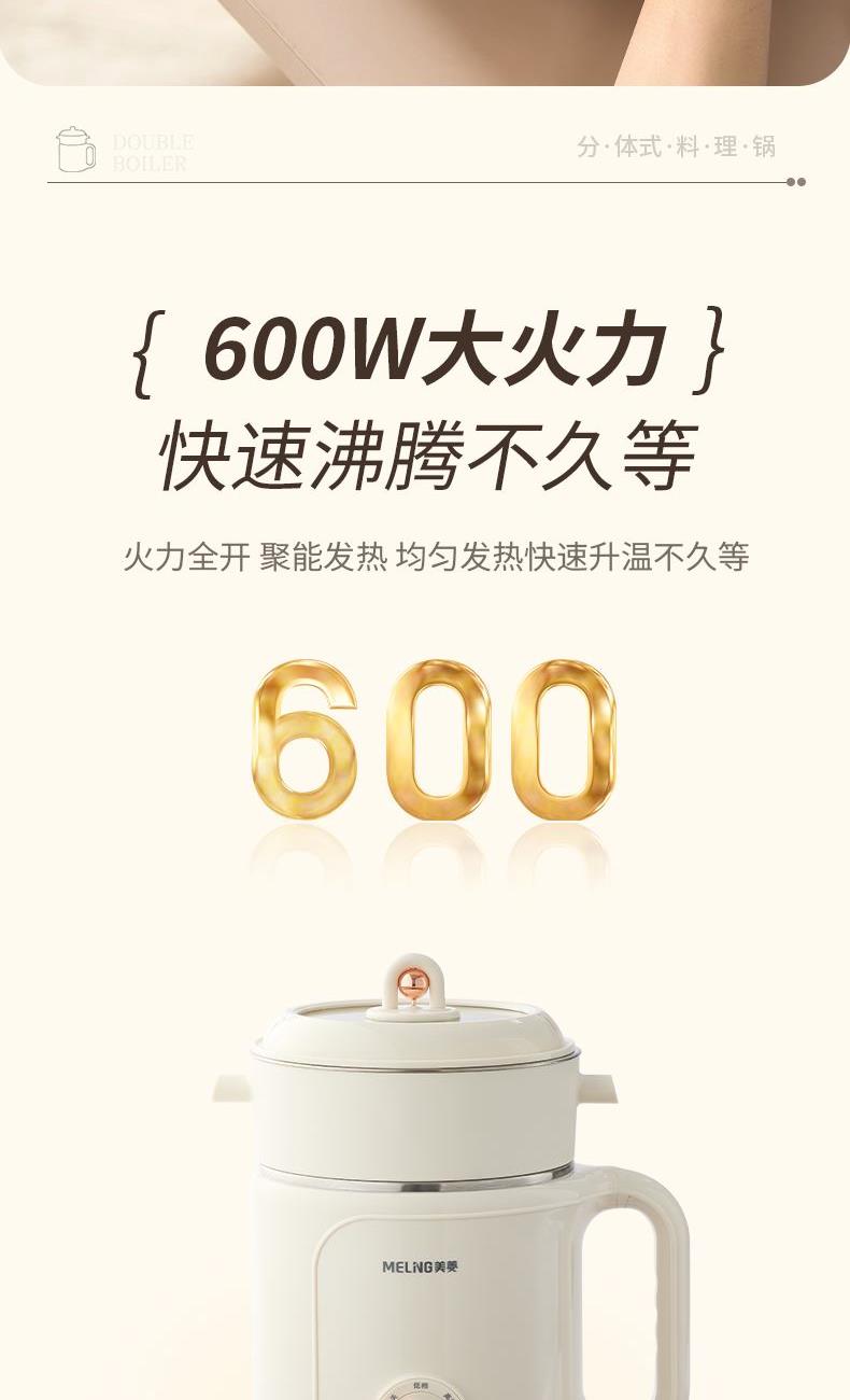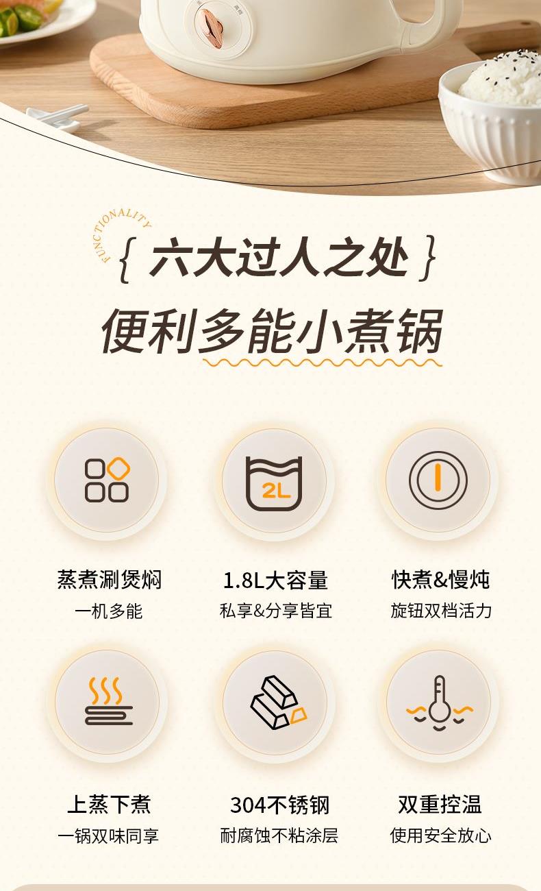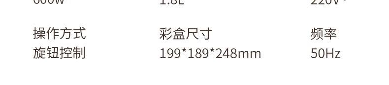 额定功率:600W 额定频率:50Hz 容量:1.8L 净重/毛重:1.06kg/1.3kg 彩盒尺寸:199*189*248mm 条形码:6936897560898 1.1.8L容量 2.花样功能 蒸、煮、涮、煲 3.钢化透明玻璃盖,蒸煮看得见 4.双重温控保护,安全放心 5.304不锈钢,耐腐蚀 食品级材质 6.防烫舒适手柄,人体工程学设计, 握感舒适 7.分体式结构 提锅即断电,使用放心