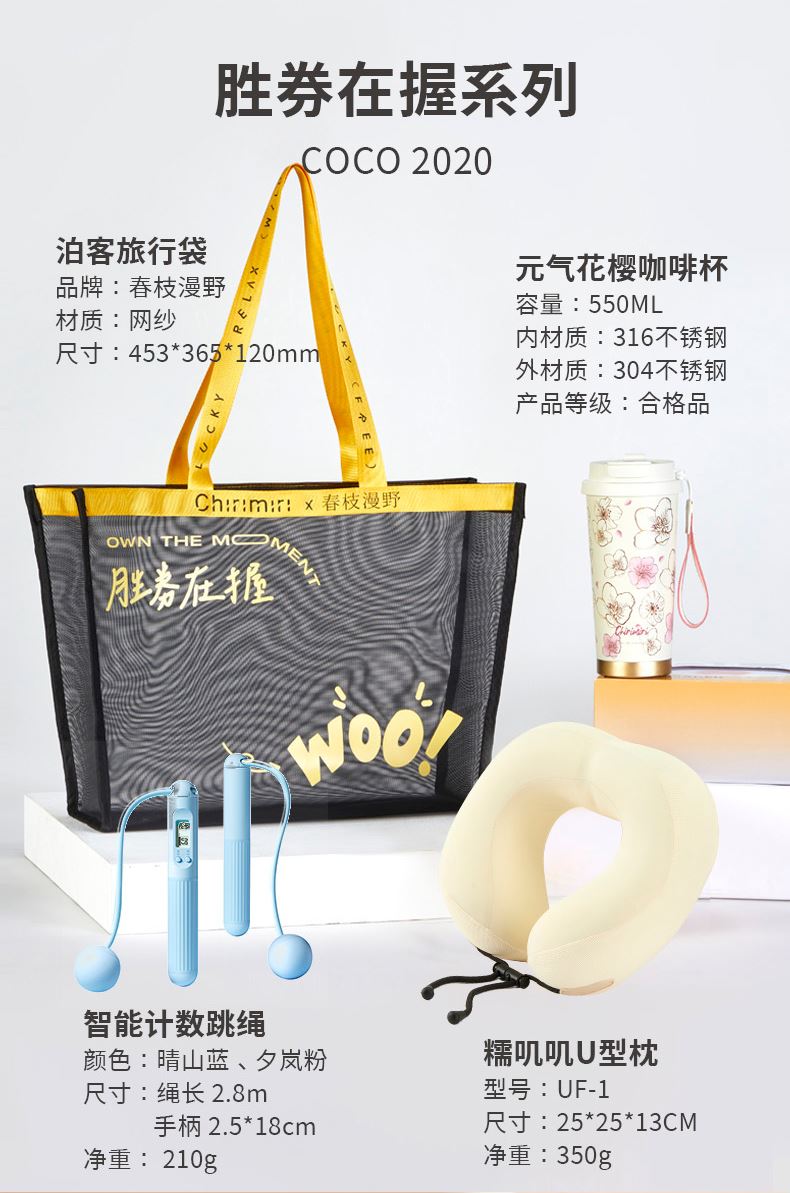 ① 糯叽叽U型枕 型号:UF-1 外圈:涤纶 枕芯:记忆棉 净重:0.35kg ② 元气花樱咖啡杯 容量:550ML 材质:内316 外304不锈钢 产品等级:合格品 ③ 智能计数跳绳 颜色:晴山蓝、夕岚粉 尺寸:绳长 2.8m 手柄 2.5*18cm 净重: 210g