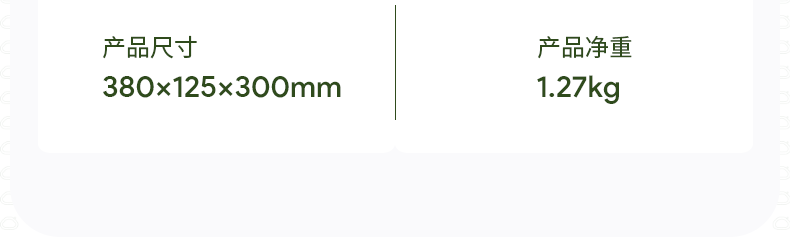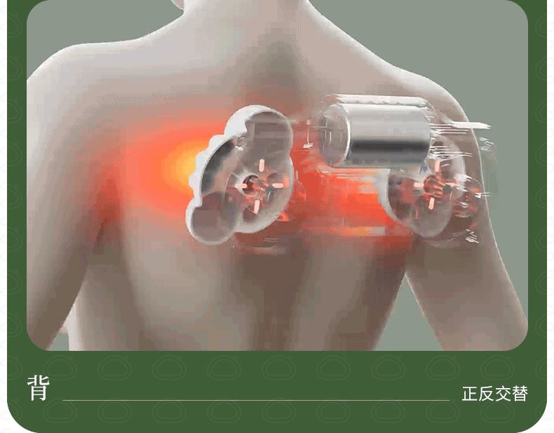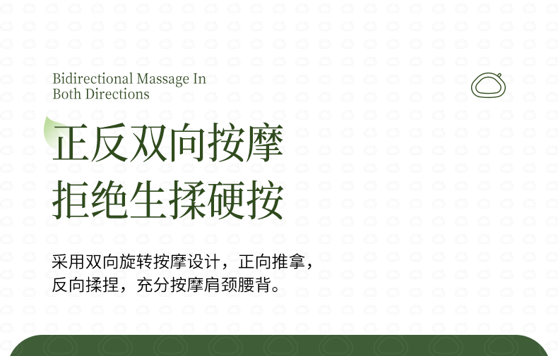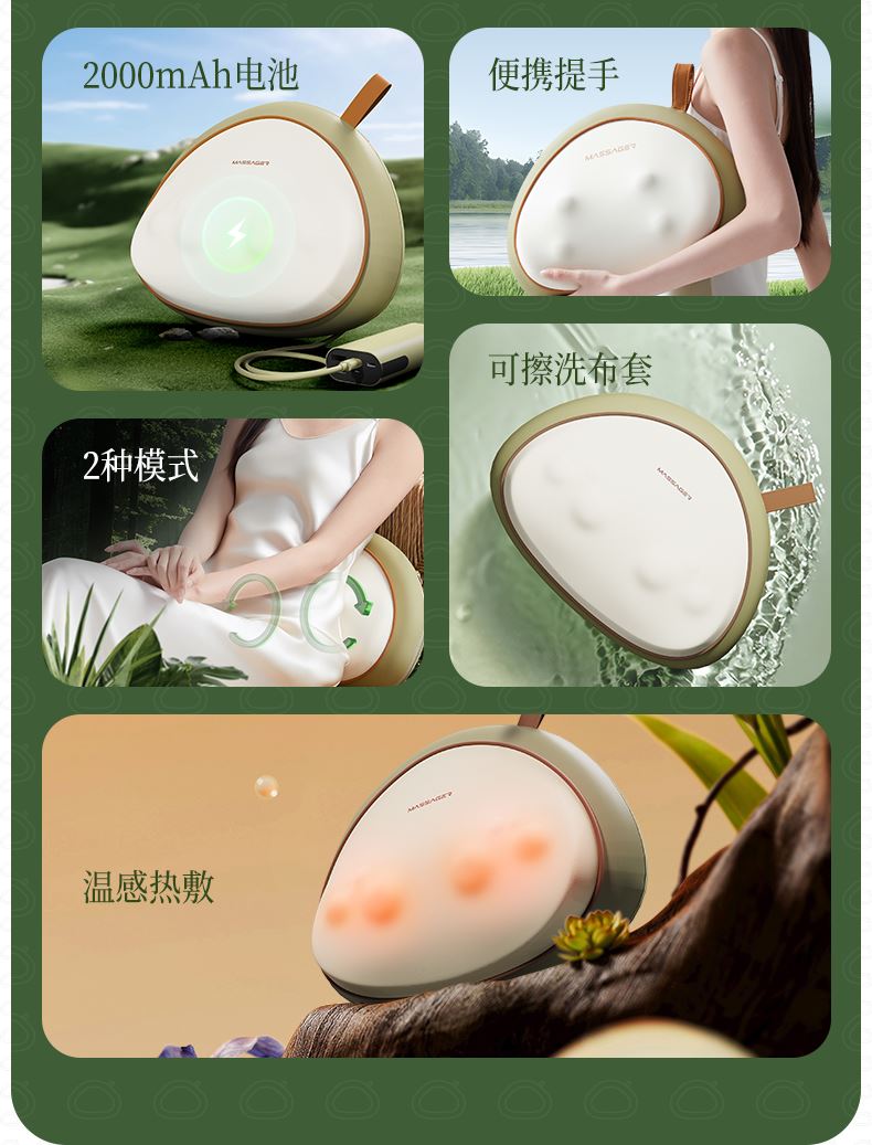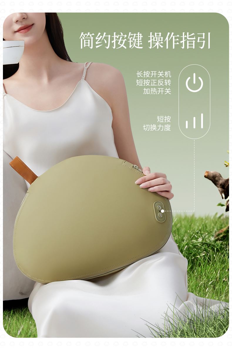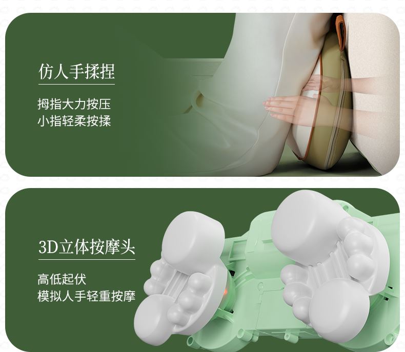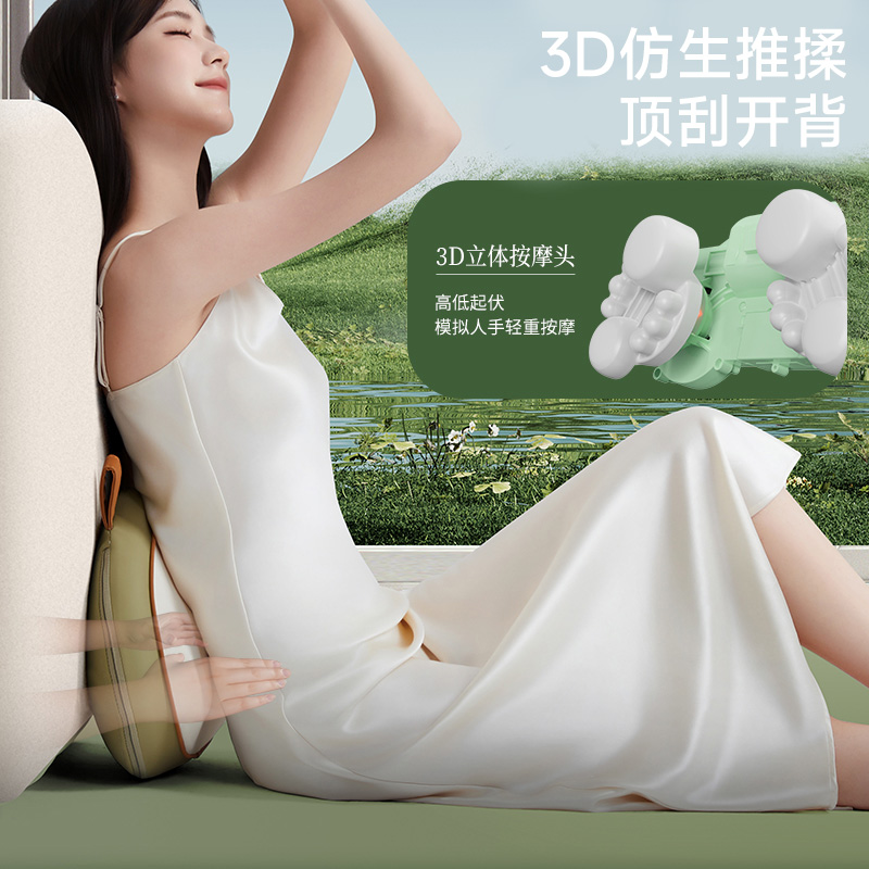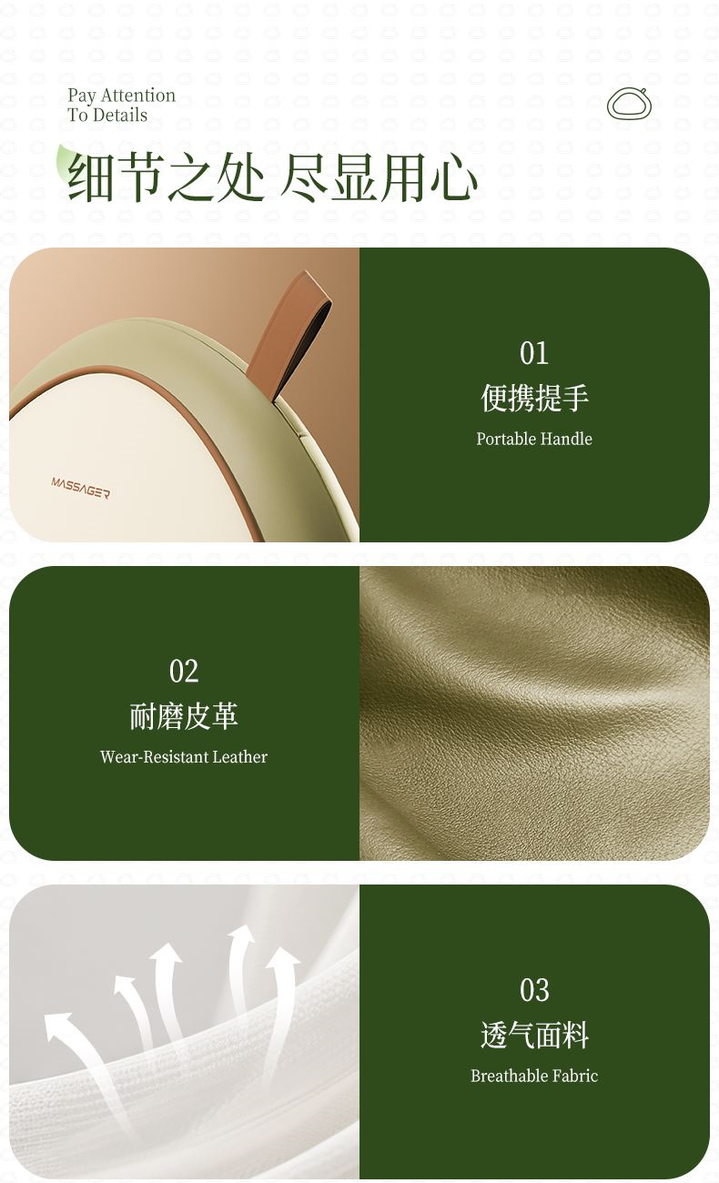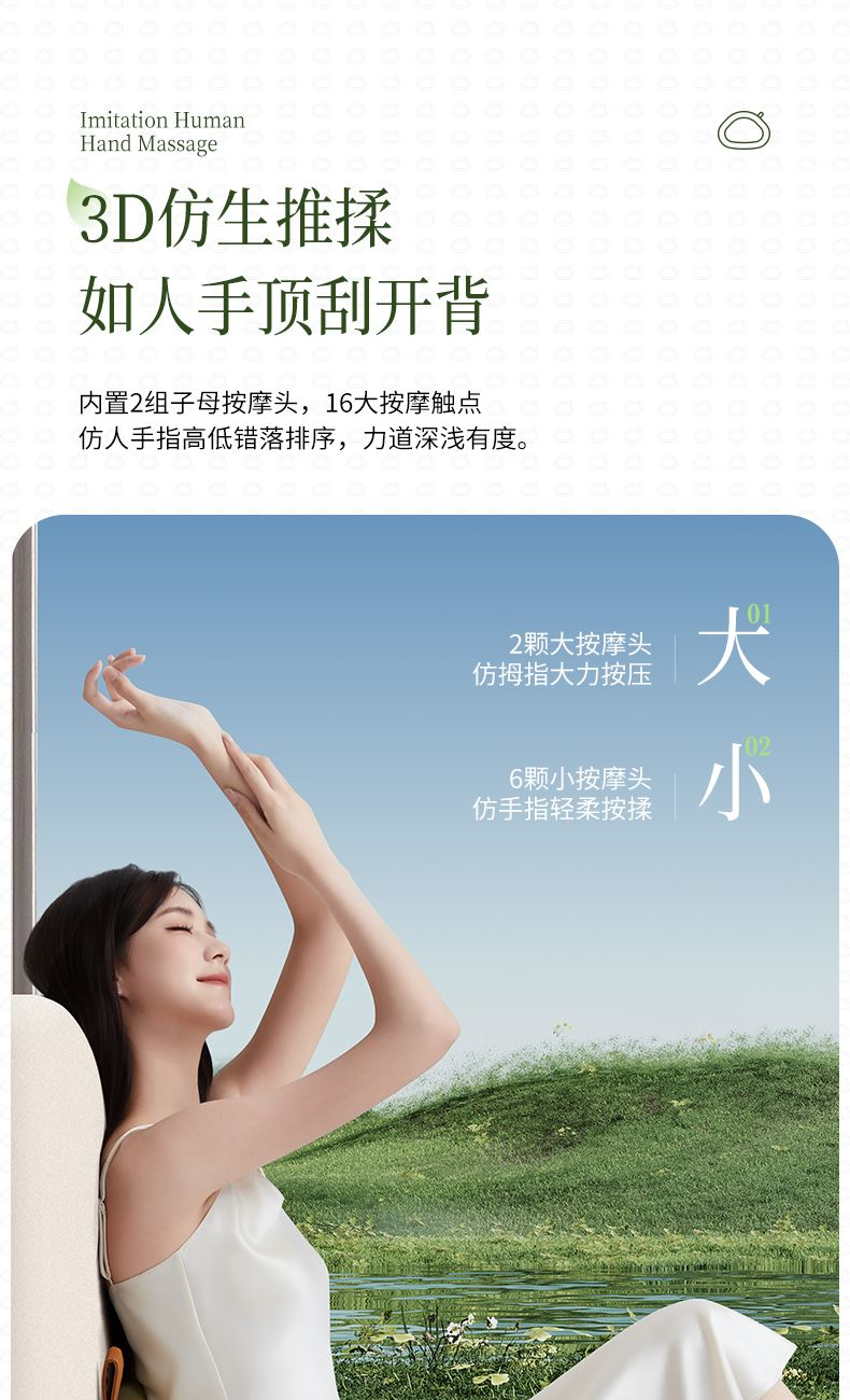 额定输入:DC 7.4V 额定功率:15W 电池容量:2000mAh 充电方式:Type-C 产品材质:猫爪 瑜伽布 产品颜色:抹茶绿 产品毛重:1.05kg 趣味颜值,集科技与美学,造就好体验 3D立体揉捏,轻享肩颈细致呵护 10分钟智能定时,浅歇一刻,能量回归 为你撑腰,仿生曲线设计,足够贴合 恒温热敷,深透舒缓,重现身体活力 不止腰背按摩,一机按遍全身