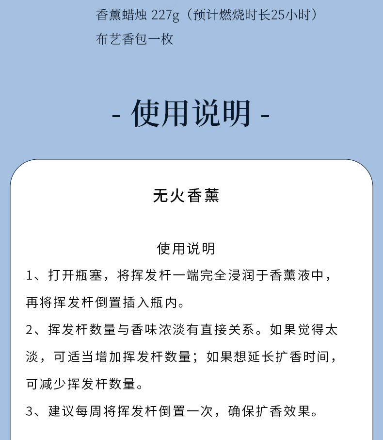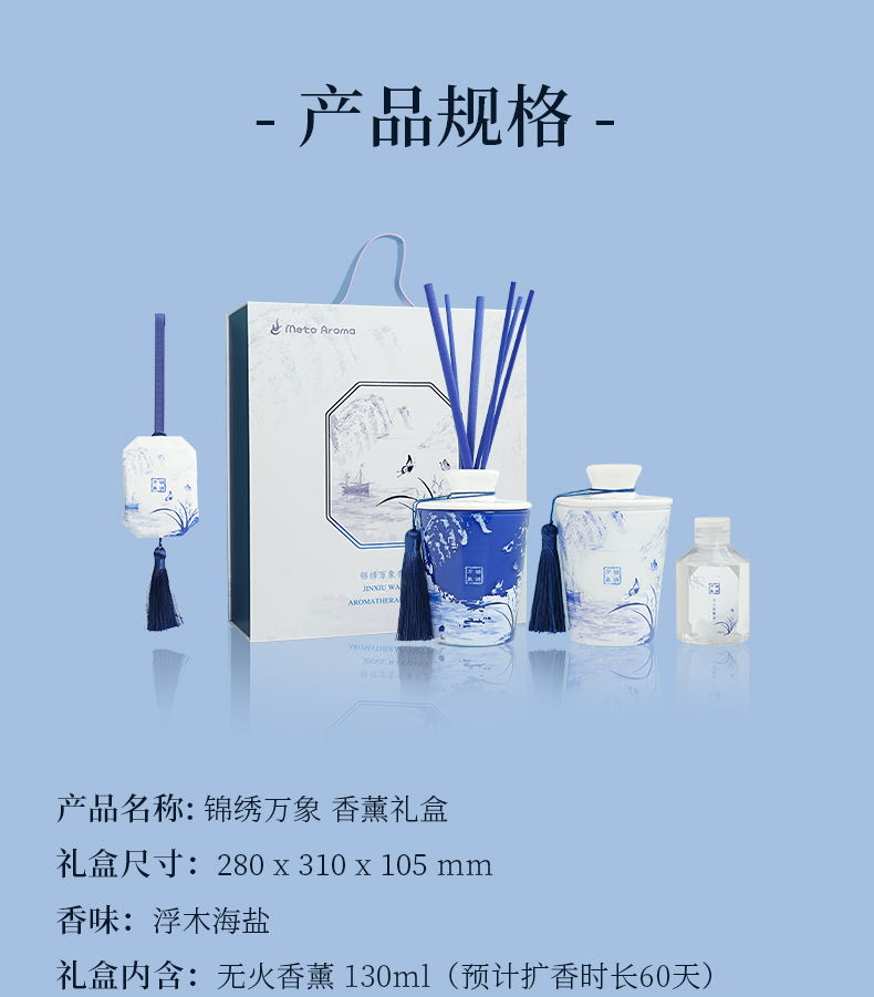 礼盒尺寸 :280 x 310 x 105 mm 香味:浮木海盐 礼盒内含: 无火香薰 130ml(预计扩香时长60天) 香薰蜡烛 227g(预计燃烧时长25小时) 布艺香包一枚
