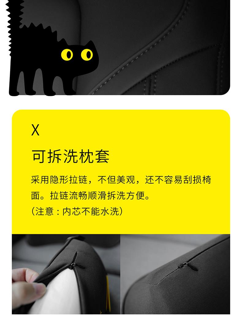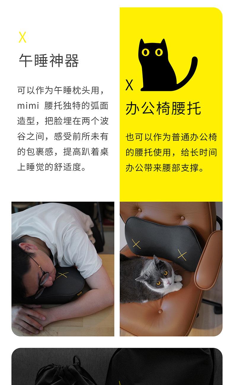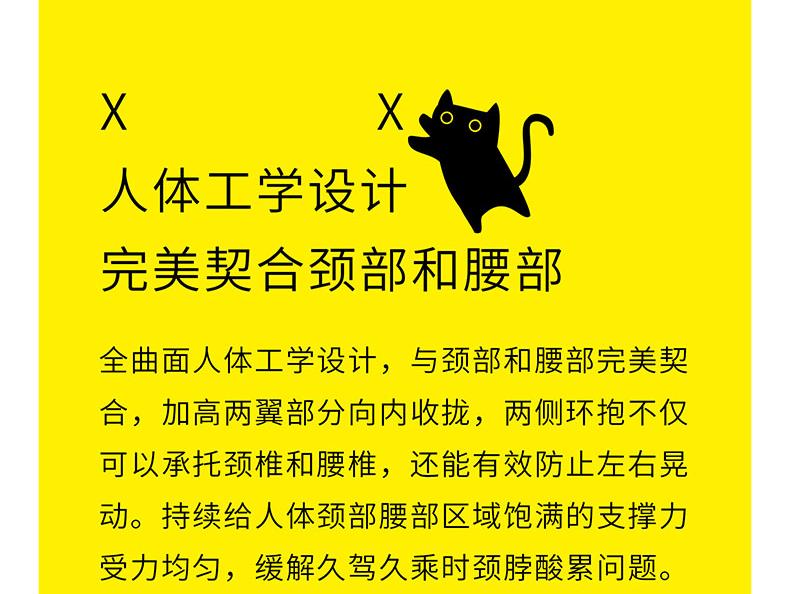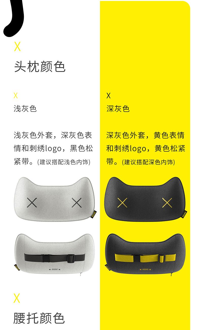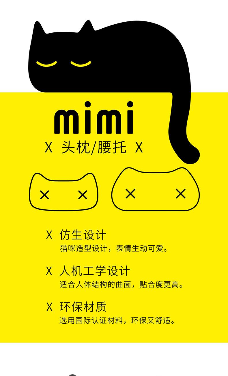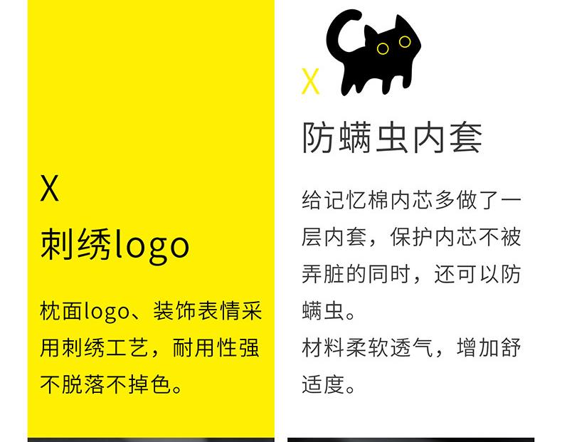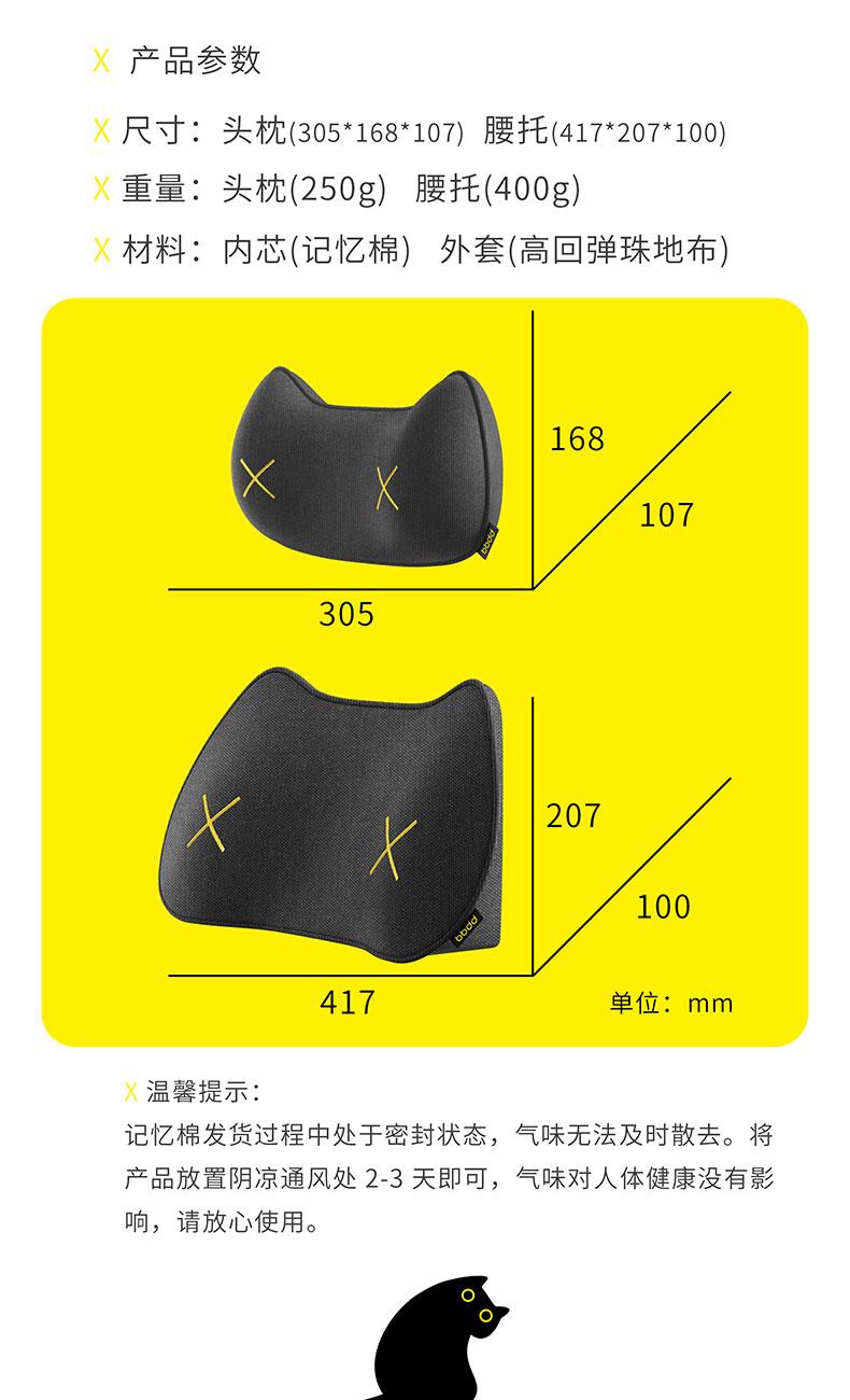 产品尺寸:409*98*200MM 产品重量:420g 产品颜色:浅灰色、深灰色 产品材质:高回弹珠地布枕芯+记忆棉内芯 内含防螨虫内套 产品卖点:通过枕面曲率与喵星人的造型结合,枕面曲率符合人体工学颈椎生理性弯曲要求。加上内部糯软式的记忆棉,可随轻压贴合腰部,得到更好的休息。记忆内芯能吸压,可支撑。四季皆宜,透气不捂。外套可拆卸,清洗。