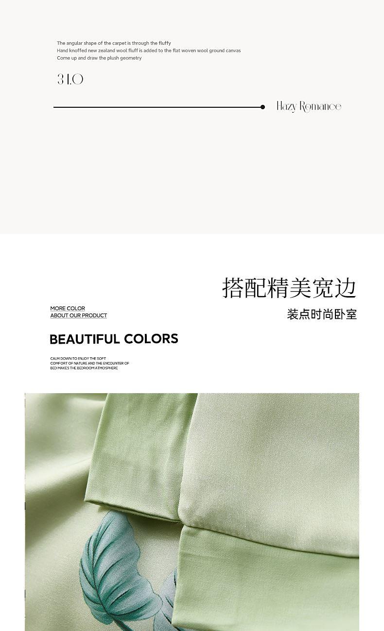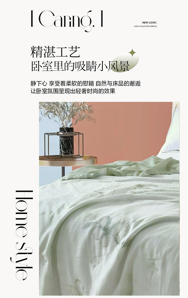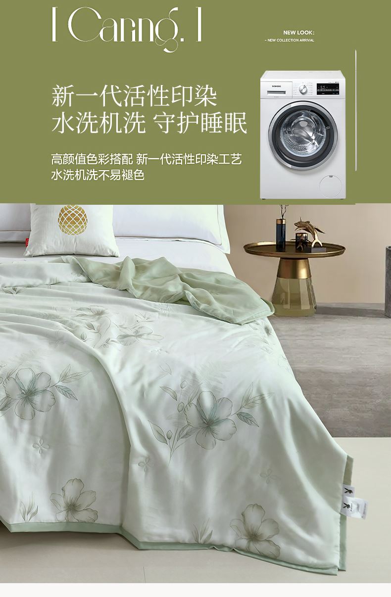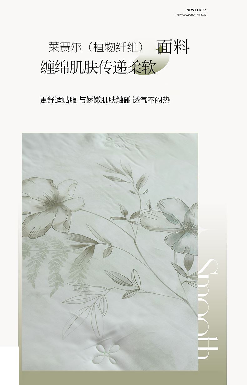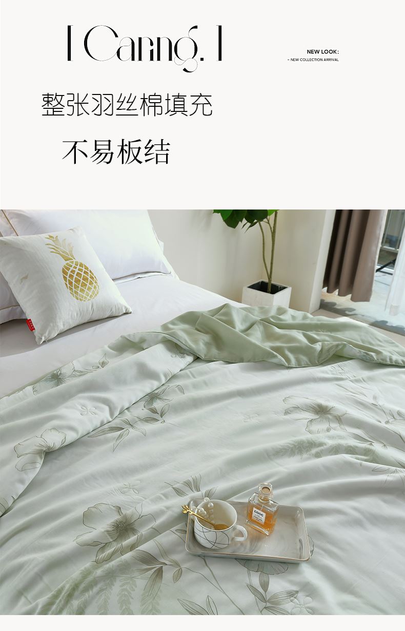规格:200*230cm 面料:莱赛尔(植物纤维) 填充:羽丝棉 重量:1700g 执行标准:GB/T22796-2021 安全类别:GB18401-2010 B类 1.以再生纤维素纤维为原料,经过精梳工艺处理,面料手感柔软如贴身内衣,睡感舒适,透气。凉而不冰,触感舒适不粘身,有着棉的柔软与丝的冰滑,灵感加持,吸湿透气不闷热。 2.面料缩水率低,色牢度高,经洗耐用。