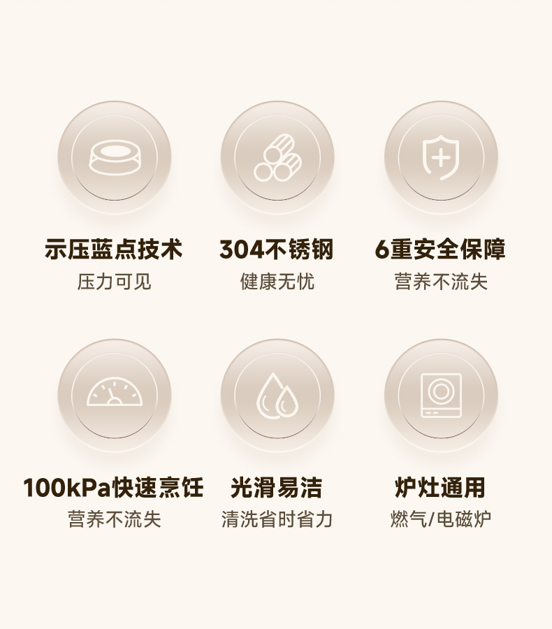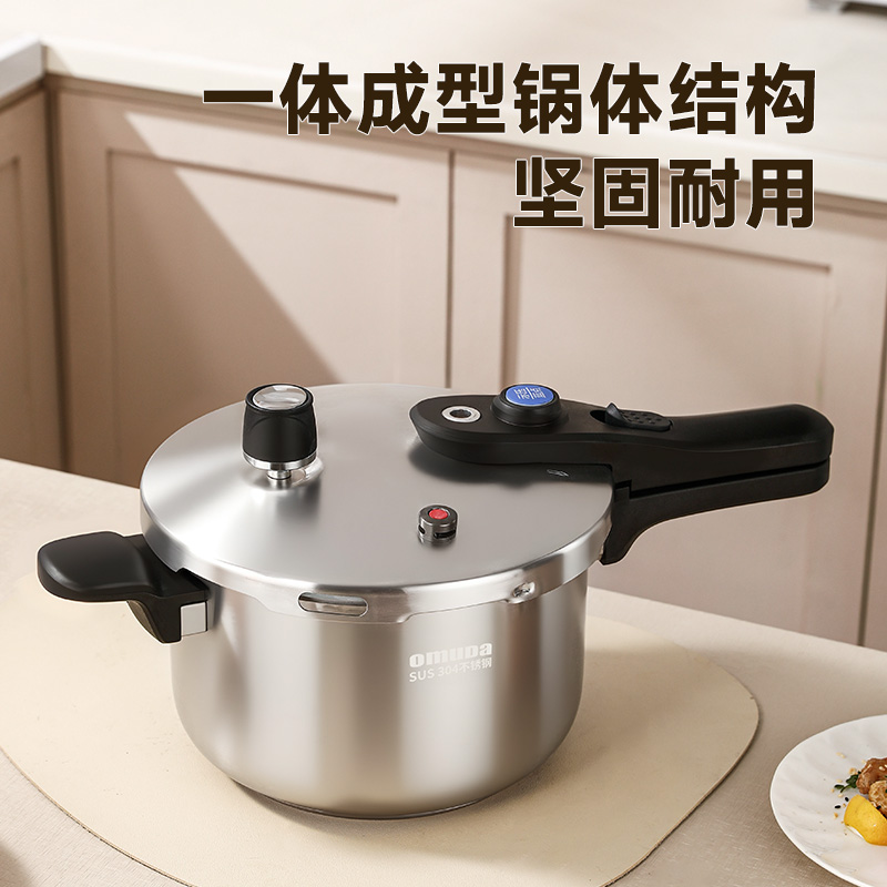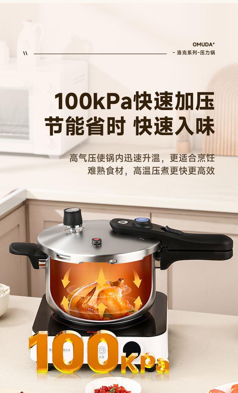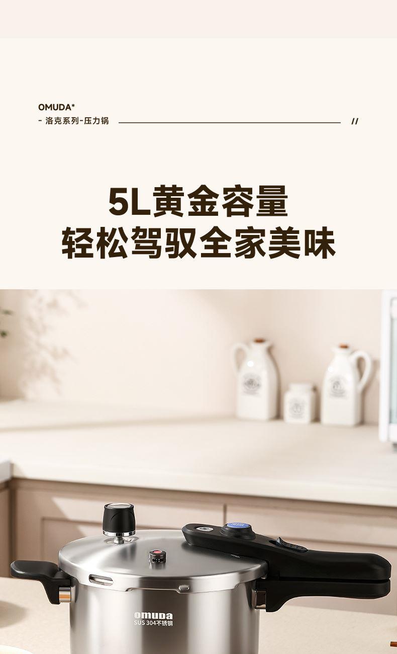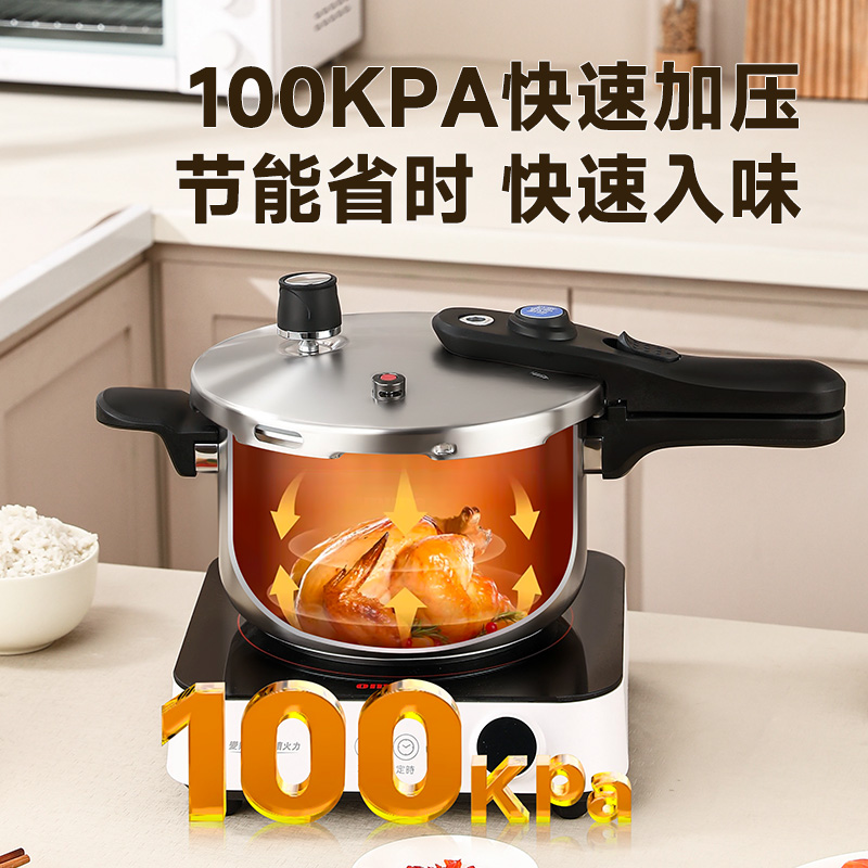 直径:22cm 容量:5L 净重:2.44kg 材质:304不锈钢 ①食品级304不锈钢,安全健康 ②100KPa快速加压,节能省时,快速入味 ③示压蓝点技术,压力轻松掌控 ④6重安全保障,使用更安心 ⑤一体成型锅体结构,坚固耐用 ⑥防烫手柄设计,握感舒适
