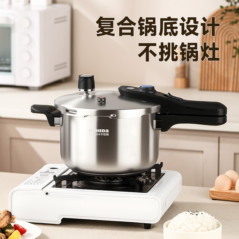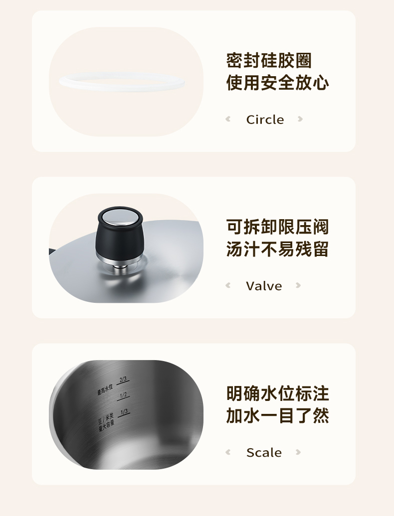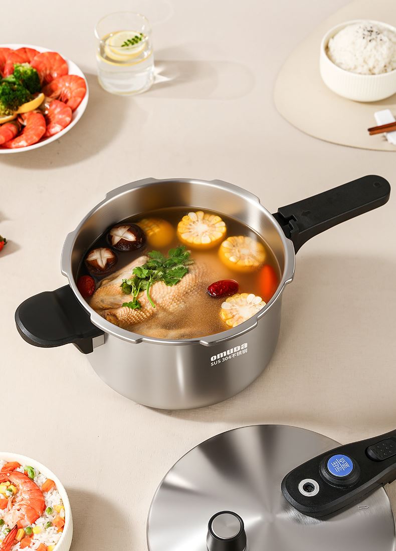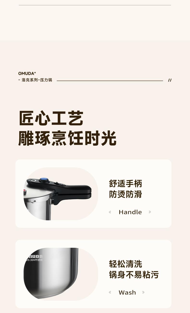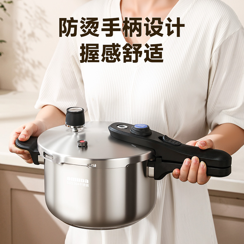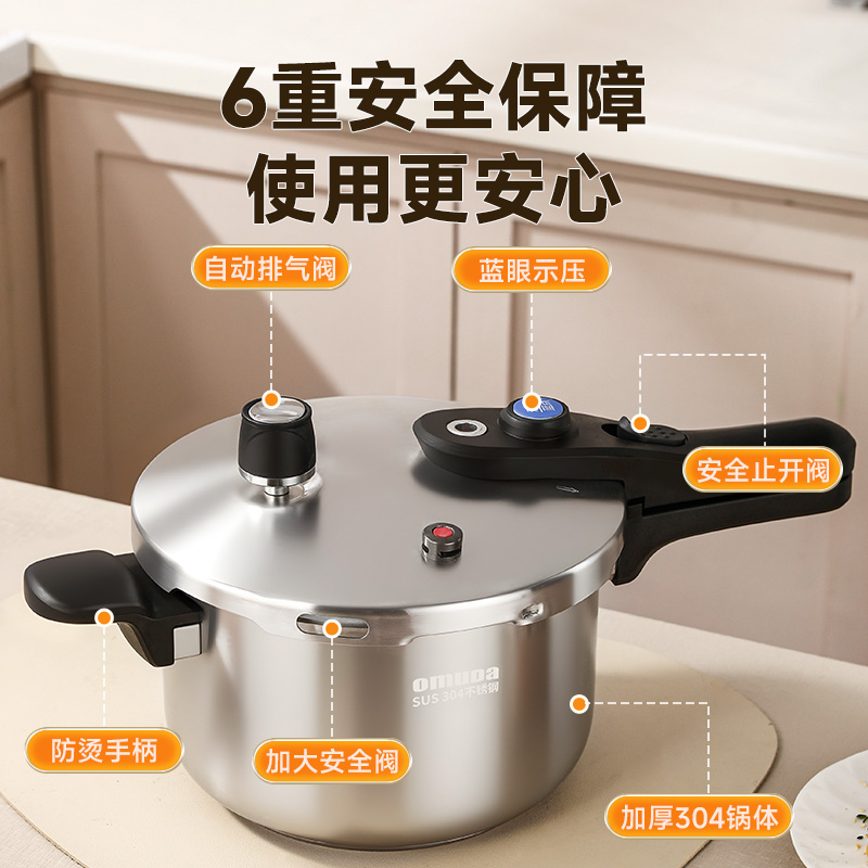 直径:22cm 容量:5L 净重:2.44kg 材质:304不锈钢 ①食品级304不锈钢,安全健康 ②100KPa快速加压,节能省时,快速入味 ③示压蓝点技术,压力轻松掌控 ④6重安全保障,使用更安心 ⑤一体成型锅体结构,坚固耐用 ⑥防烫手柄设计,握感舒适
