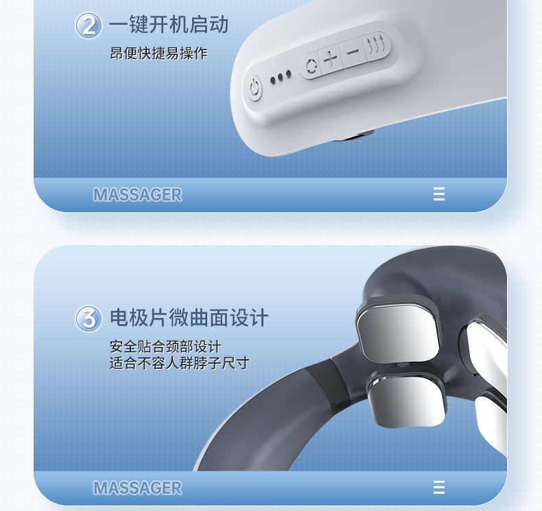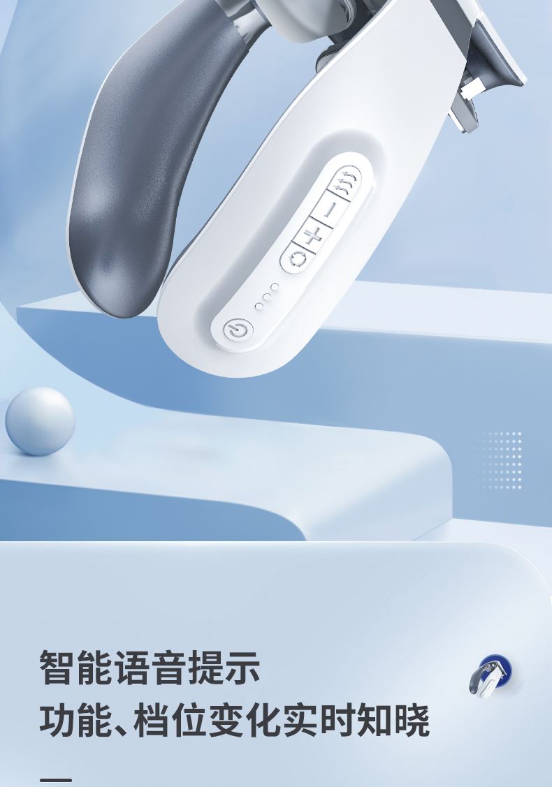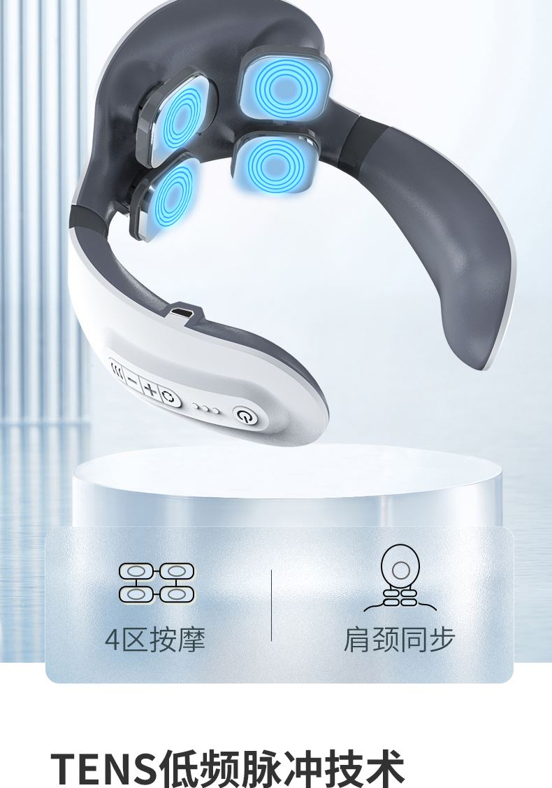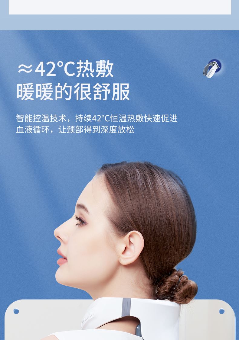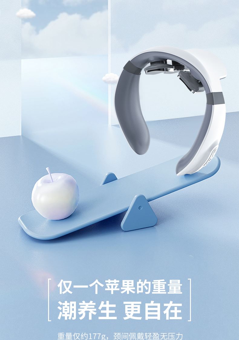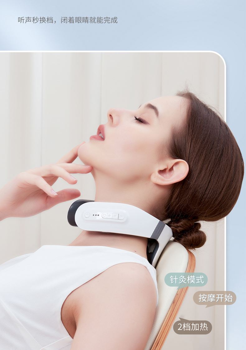 双效舒缓颈部不适,呵护你的颈椎 方便携带,戴脖子上 轻巧无重力感; 缓解僵硬肿胀(六大按摩手法:推拿、针灸、刮痧、脉冲、拔罐、叩击); 弹性臂技术回弹好韧性强,深度贴合颈部 ; 304不锈钢电极片,触感细腻不过敏 18档力度调节, 6种按摩模式,强度可调,一键启动,语音提示,持久续航 升级热敷技术,42度恒温 让血液流通更顺畅,肌肉更活力