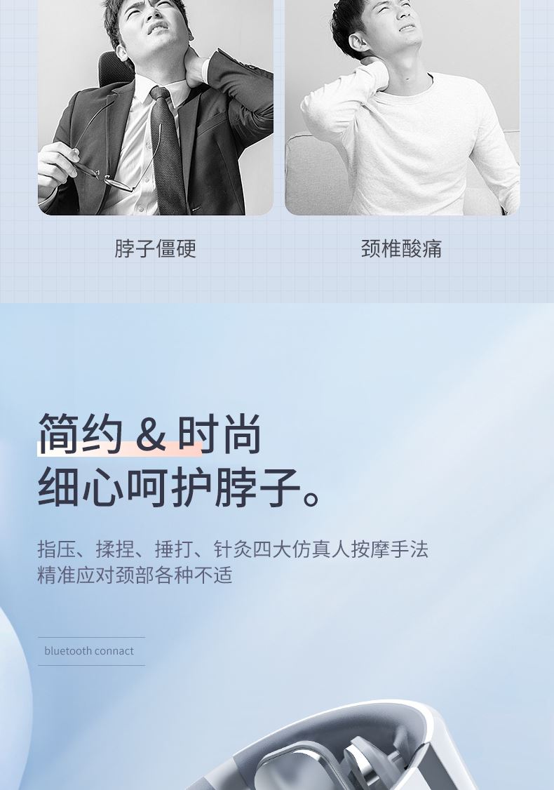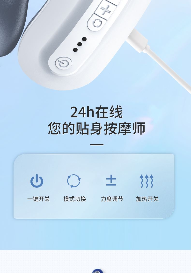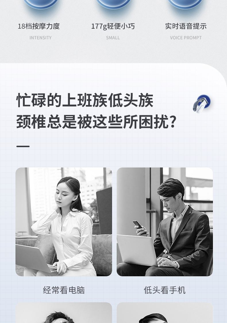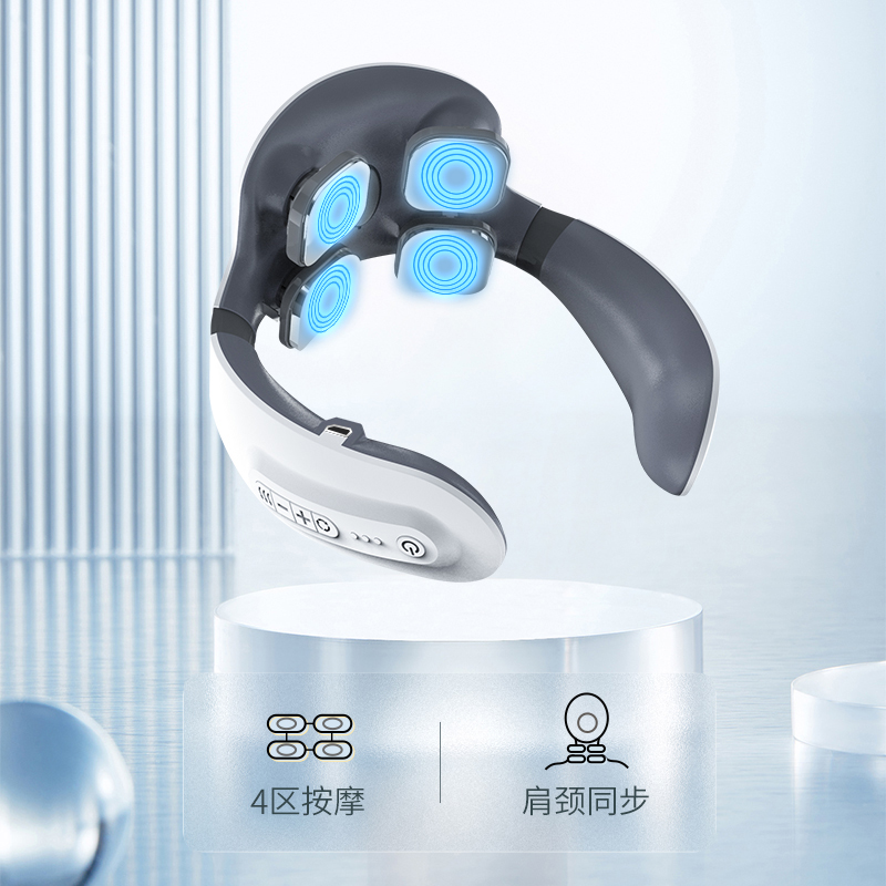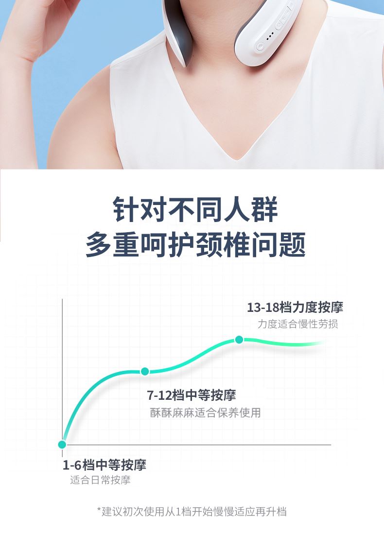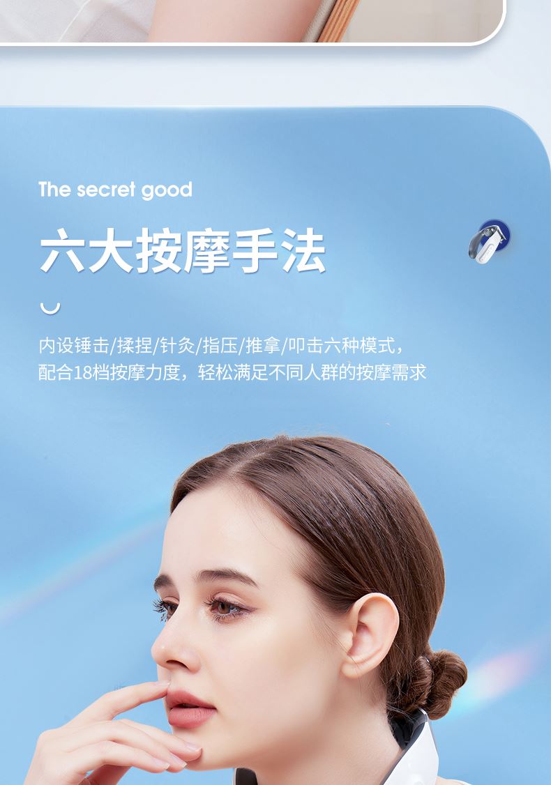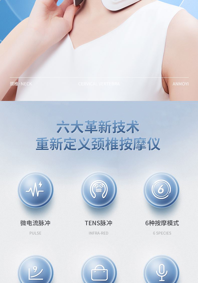 双效舒缓颈部不适,呵护你的颈椎 方便携带,戴脖子上 轻巧无重力感; 缓解僵硬肿胀(六大按摩手法:推拿、针灸、刮痧、脉冲、拔罐、叩击); 弹性臂技术回弹好韧性强,深度贴合颈部 ; 304不锈钢电极片,触感细腻不过敏 18档力度调节, 6种按摩模式,强度可调,一键启动,语音提示,持久续航 升级热敷技术,42度恒温 让血液流通更顺畅,肌肉更活力