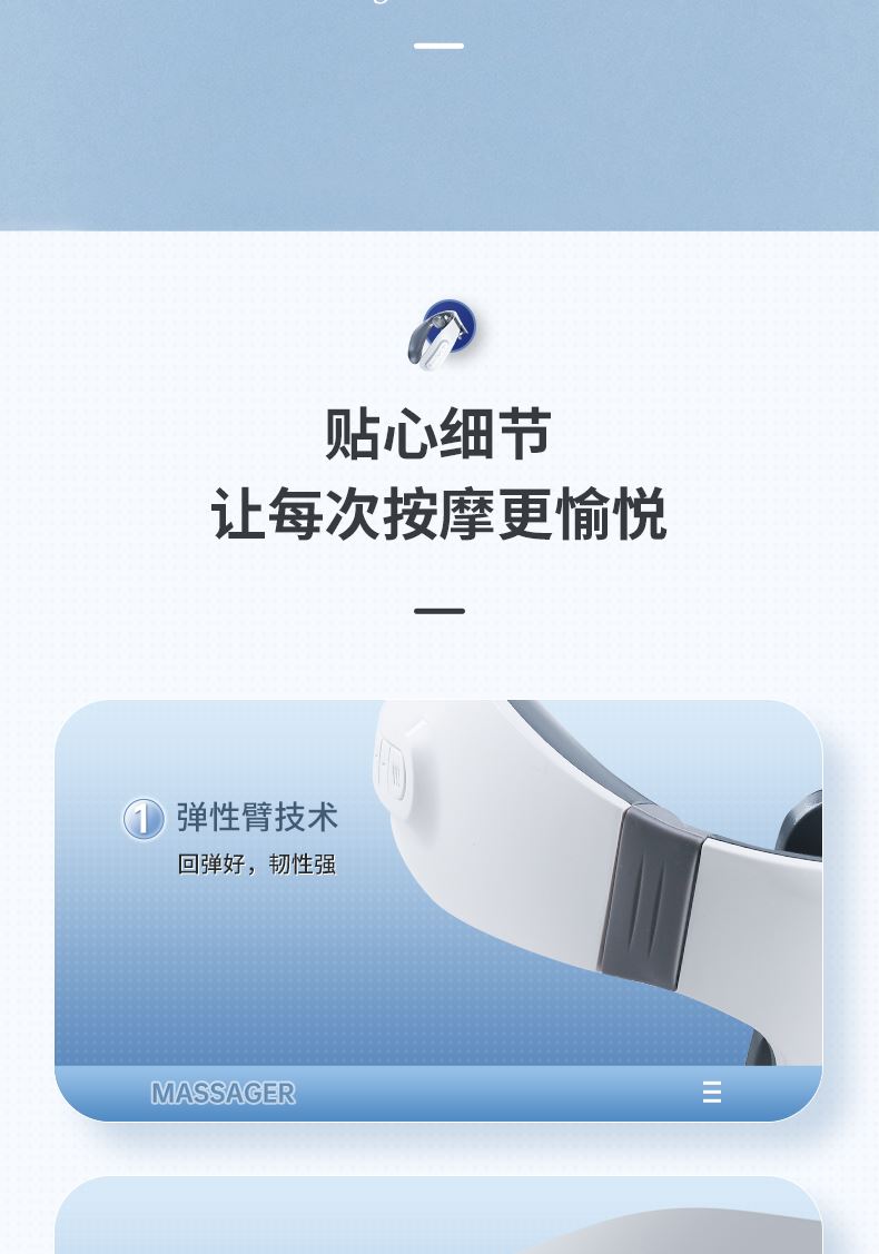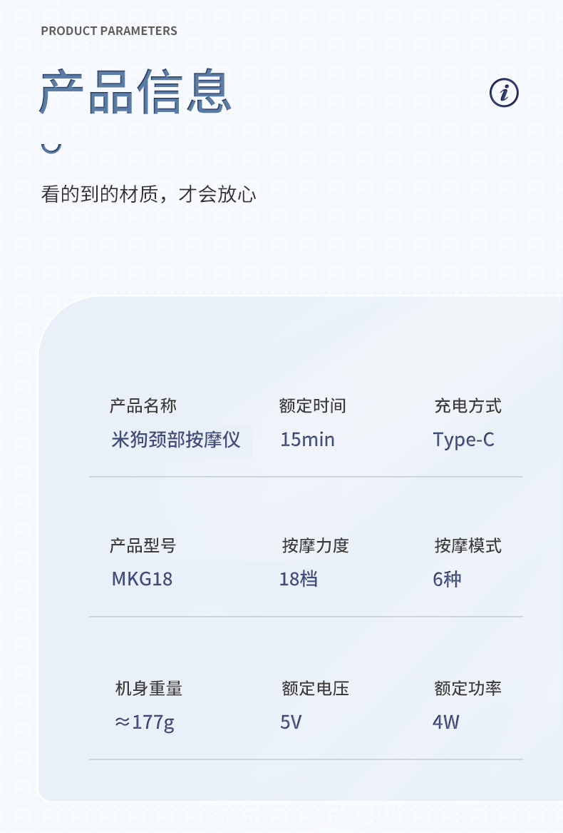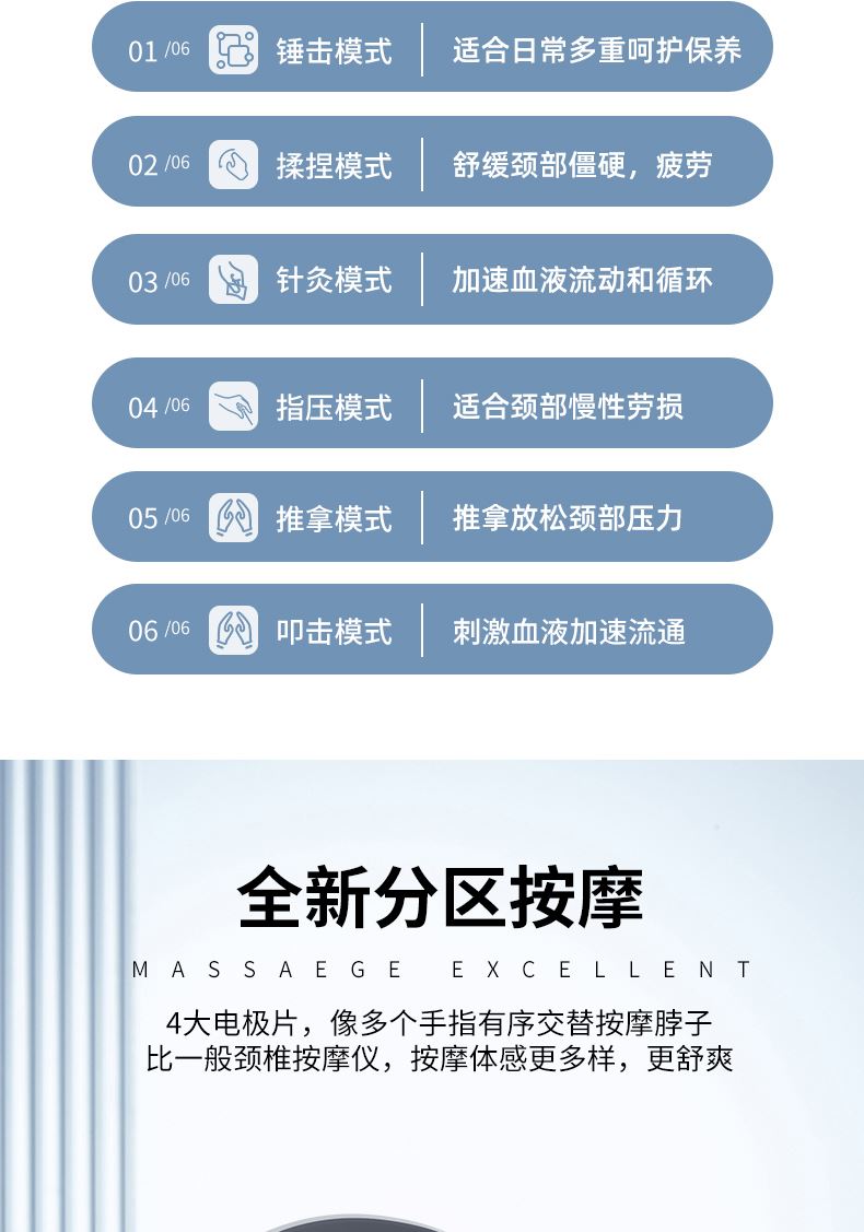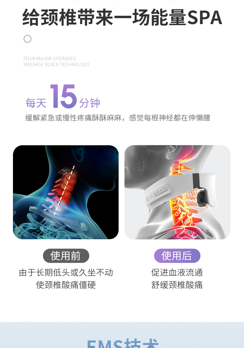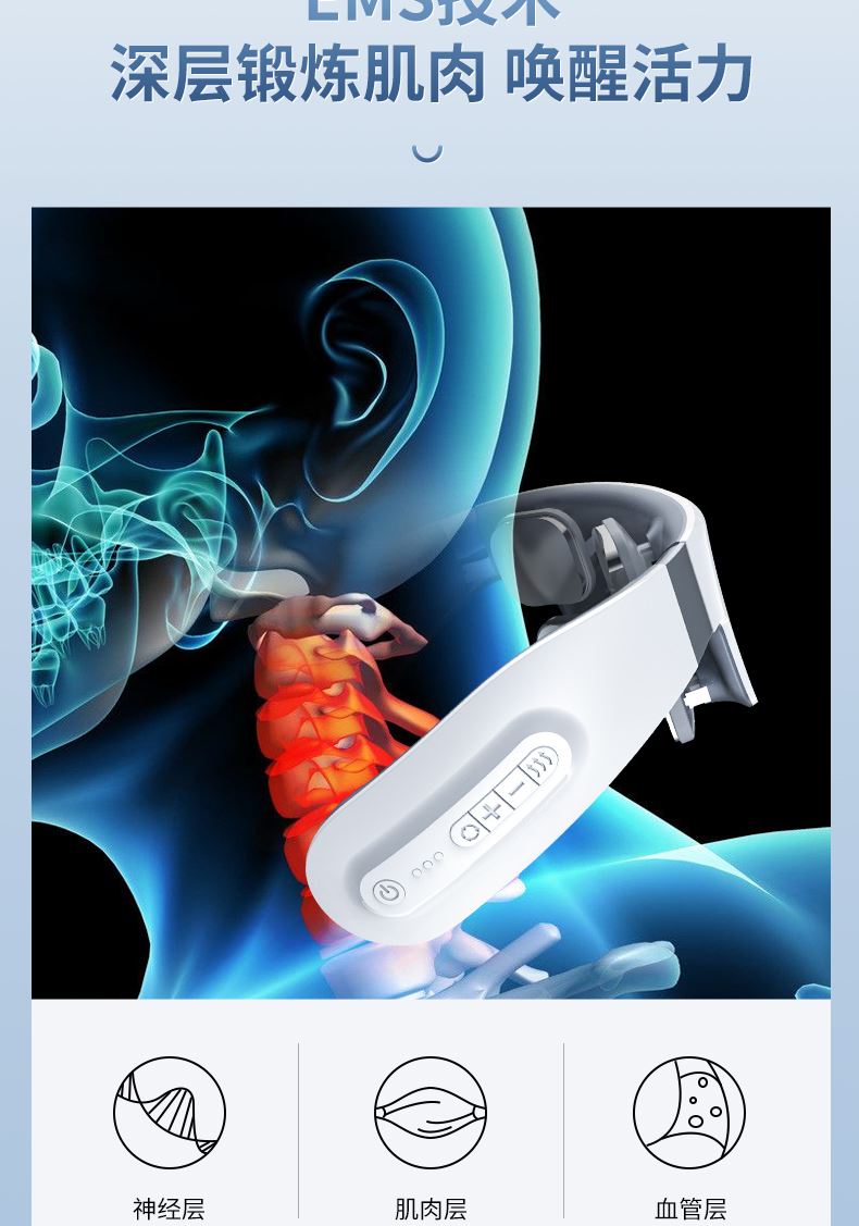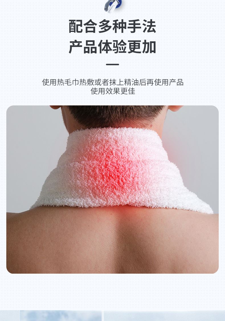 双效舒缓颈部不适,呵护你的颈椎 方便携带,戴脖子上 轻巧无重力感; 缓解僵硬肿胀(六大按摩手法:推拿、针灸、刮痧、脉冲、拔罐、叩击); 弹性臂技术回弹好韧性强,深度贴合颈部 ; 304不锈钢电极片,触感细腻不过敏 18档力度调节, 6种按摩模式,强度可调,一键启动,语音提示,持久续航 升级热敷技术,42度恒温 让血液流通更顺畅,肌肉更活力