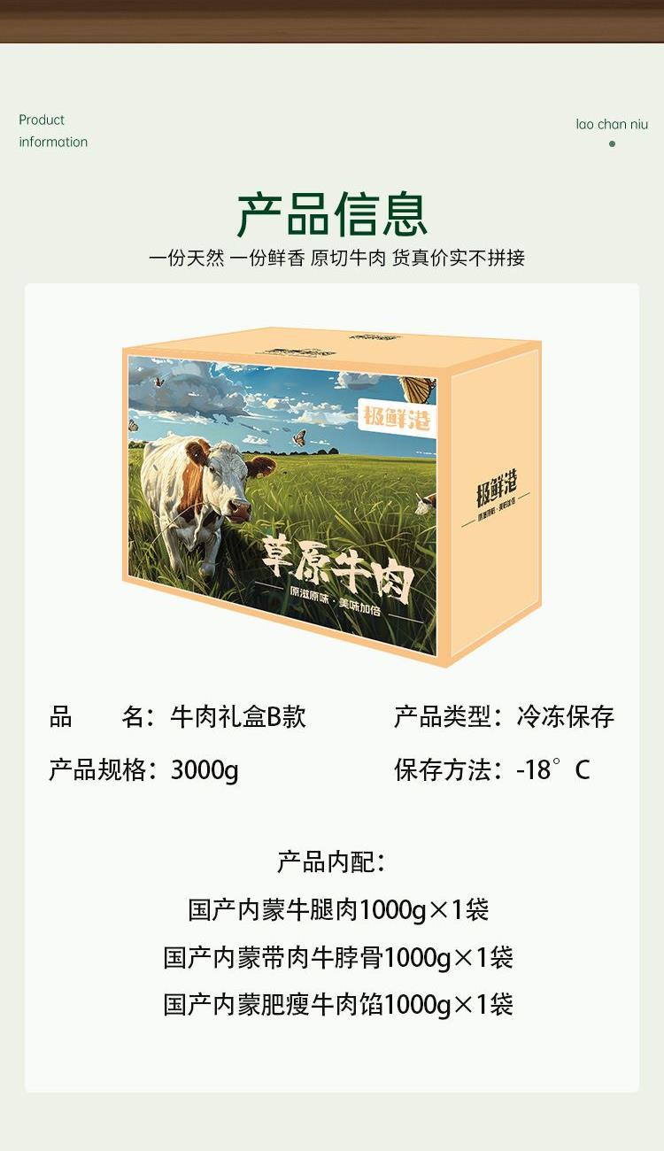 产品:牛肉礼盒B款 产品规格:3000g 产品类型:冷冻保存 保存方法:-18°C 产品内配: 国产内蒙牛腿肉1000gx1袋国产内蒙带肉牛脖骨1000gx1袋国产内蒙肥瘦牛肉馅1000gx1袋 好品质 源自好牧场 高原成长,肉质紧实生态散养,自然成熟 肉质紧实 口感劲道 细腻口感 意犹未尽 原切牛肉 拒绝拼接 精选部位 整块原切