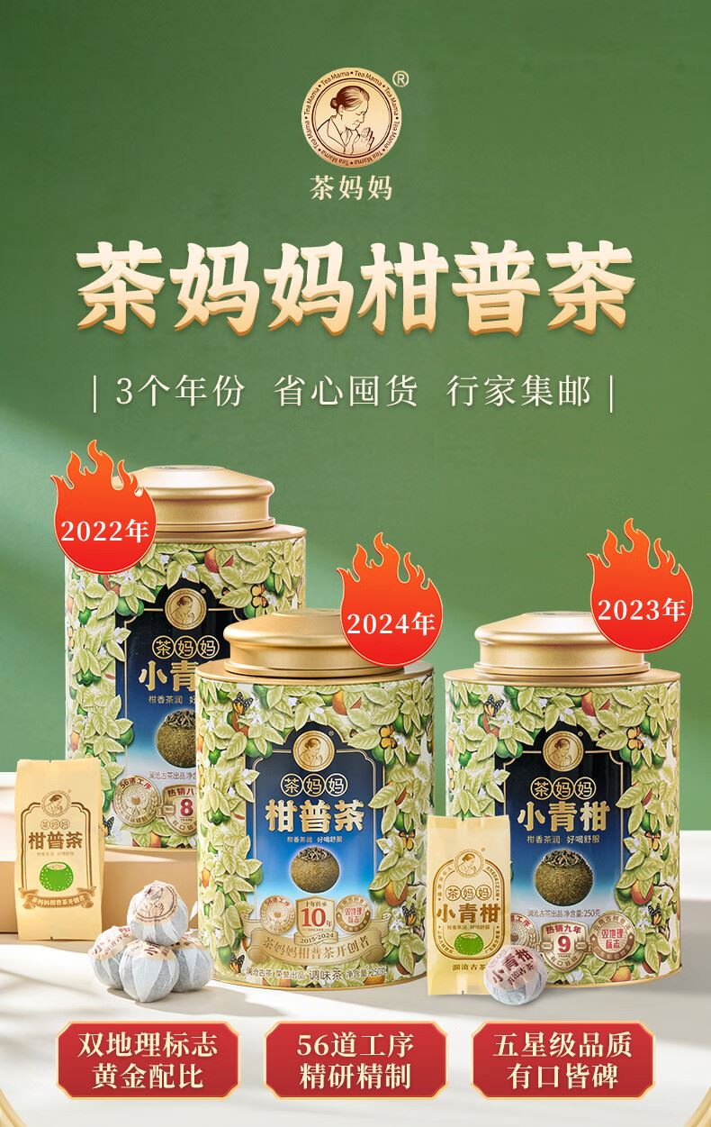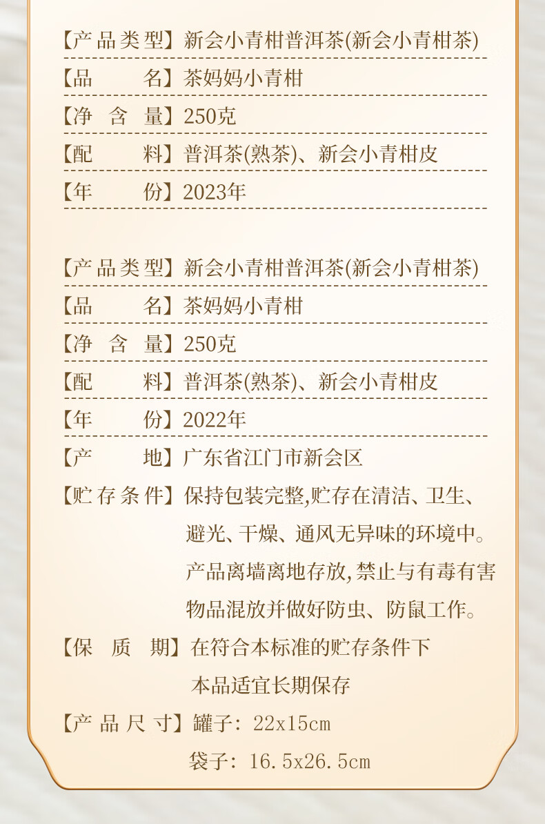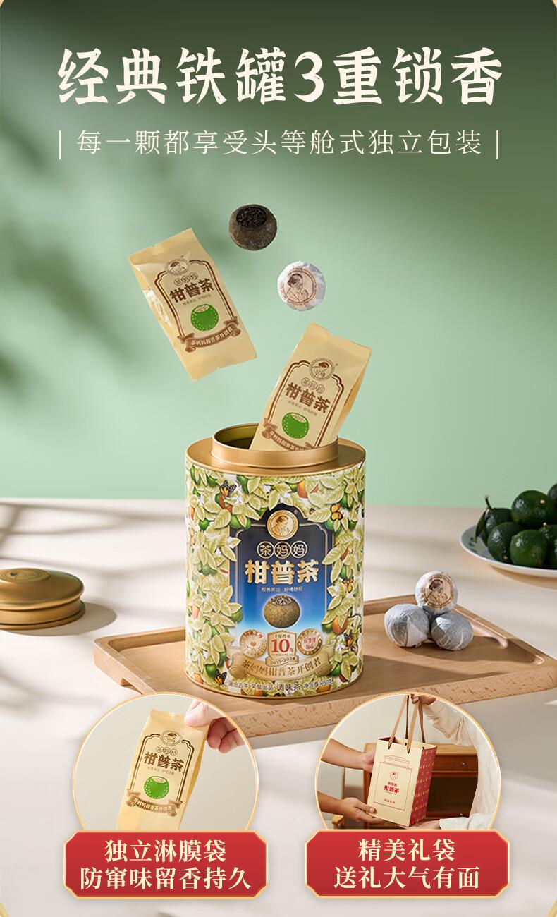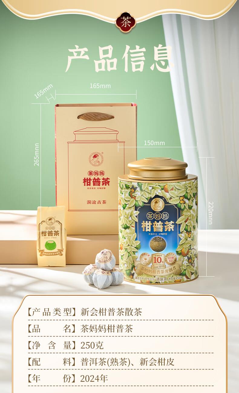 茶类:柑普 净含量:250克 配料:普洱茶(熟茶)、新会柑皮 产地:广东省江门市新会区 推荐冲泡次数:12次 产品尺寸: 罐子:22x15cm 袋子:16.5x26.5cm 茶妈妈柑普茶开创者 |始于2015年,连续畅销10年| 双地理标志黄金配比 56道工序精研精制 五星级品质有口皆碑 46年发酵历史,发酵技术堪称业界典范曾多次荣获熟茶品类荣誉和奖项 5星养护好柑果精选新会头采单枝柑 |确保每颗柑果都是“高品质”|