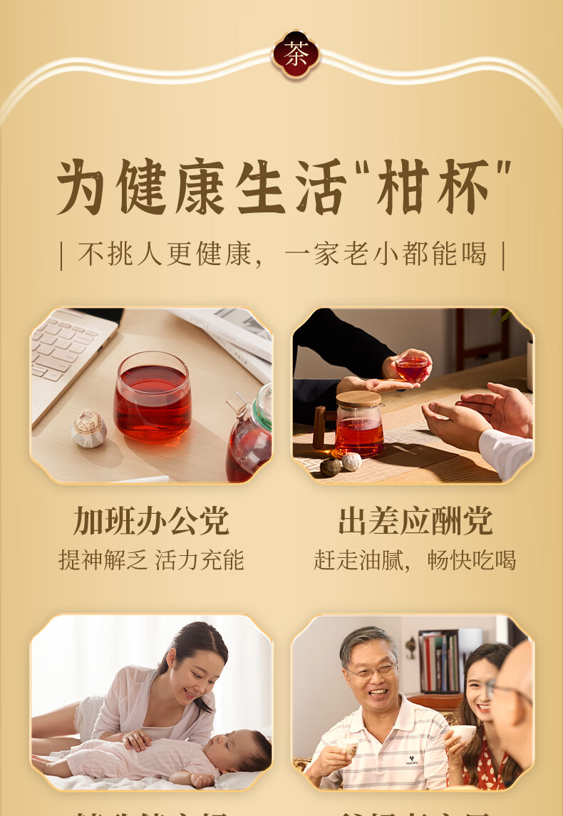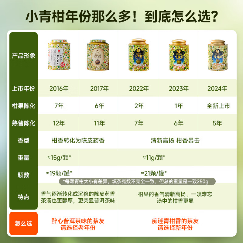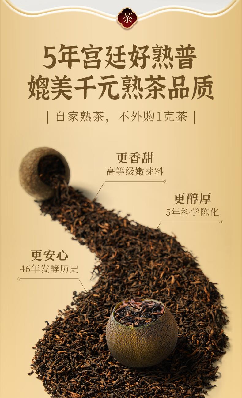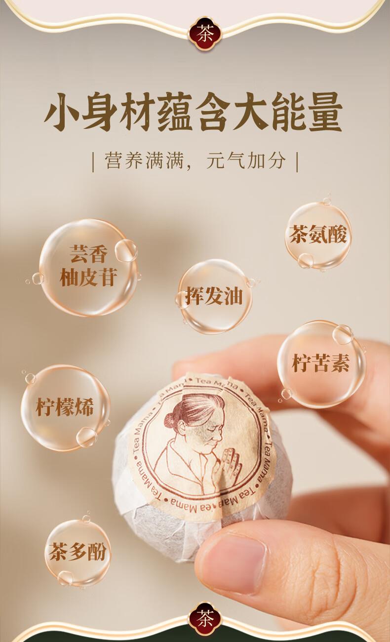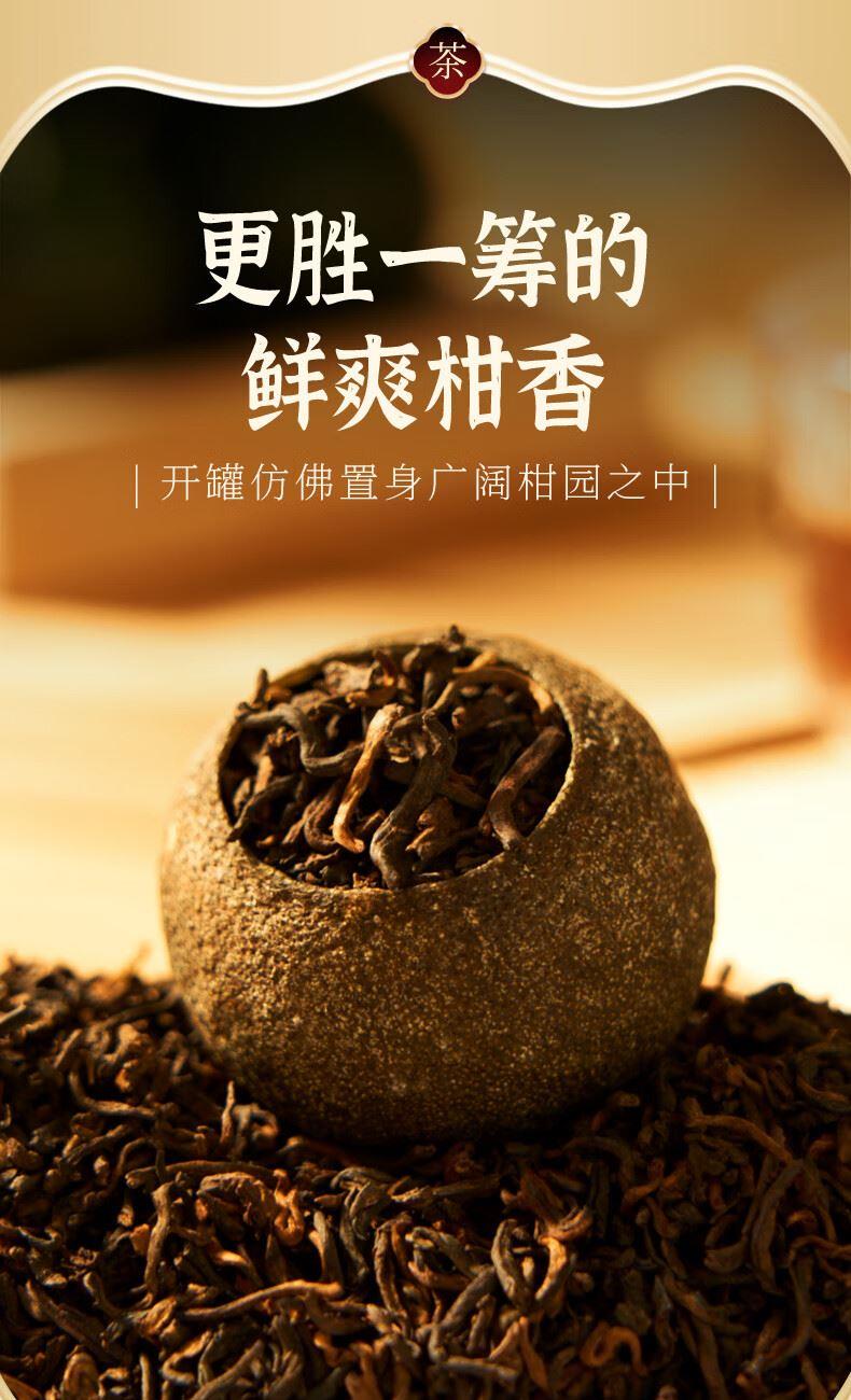 茶类:柑普 净含量:250克 配料:普洱茶(熟茶)、新会柑皮 产地:广东省江门市新会区 推荐冲泡次数:12次 产品尺寸: 罐子:22x15cm 袋子:16.5x26.5cm 茶妈妈柑普茶开创者 |始于2015年,连续畅销10年| 双地理标志黄金配比 56道工序精研精制 五星级品质有口皆碑 46年发酵历史,发酵技术堪称业界典范曾多次荣获熟茶品类荣誉和奖项 5星养护好柑果精选新会头采单枝柑 |确保每颗柑果都是“高品质”|