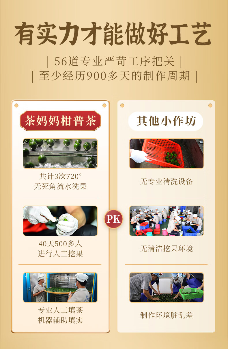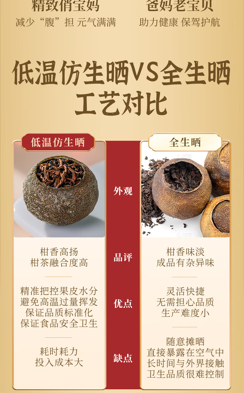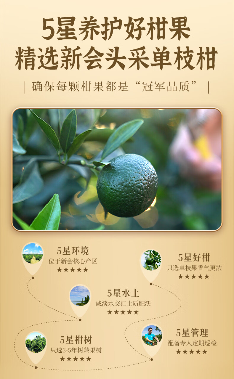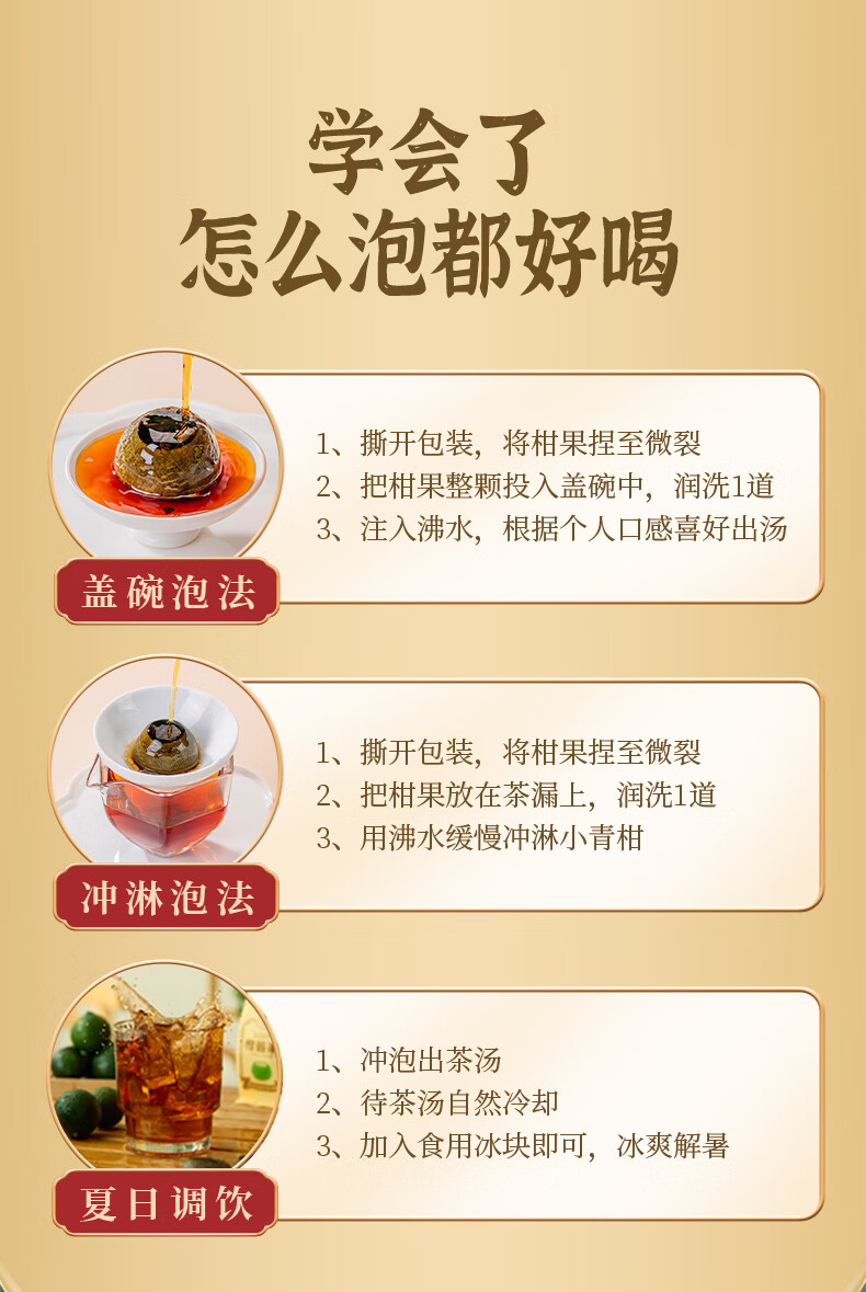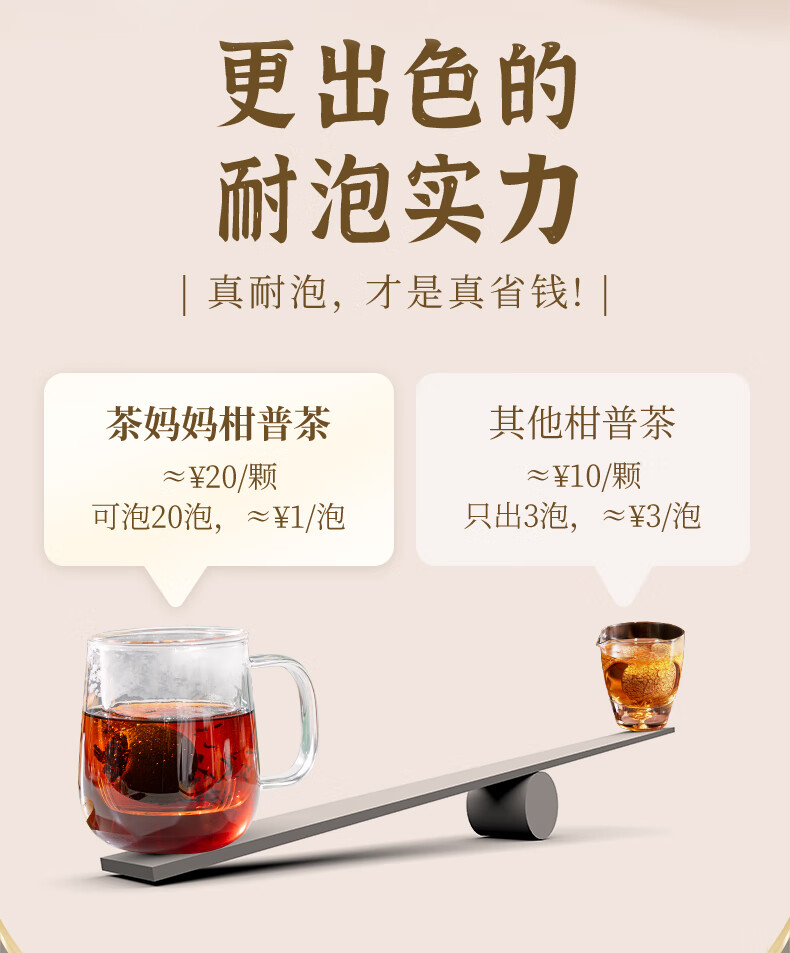 茶类:柑普 净含量:250克 配料:普洱茶(熟茶)、新会柑皮 产地:广东省江门市新会区 推荐冲泡次数:12次 产品尺寸: 罐子:22x15cm 袋子:16.5x26.5cm 茶妈妈柑普茶开创者 |始于2015年,连续畅销10年| 双地理标志黄金配比 56道工序精研精制 五星级品质有口皆碑 46年发酵历史,发酵技术堪称业界典范曾多次荣获熟茶品类荣誉和奖项 5星养护好柑果精选新会头采单枝柑 |确保每颗柑果都是“高品质”|