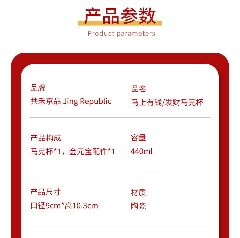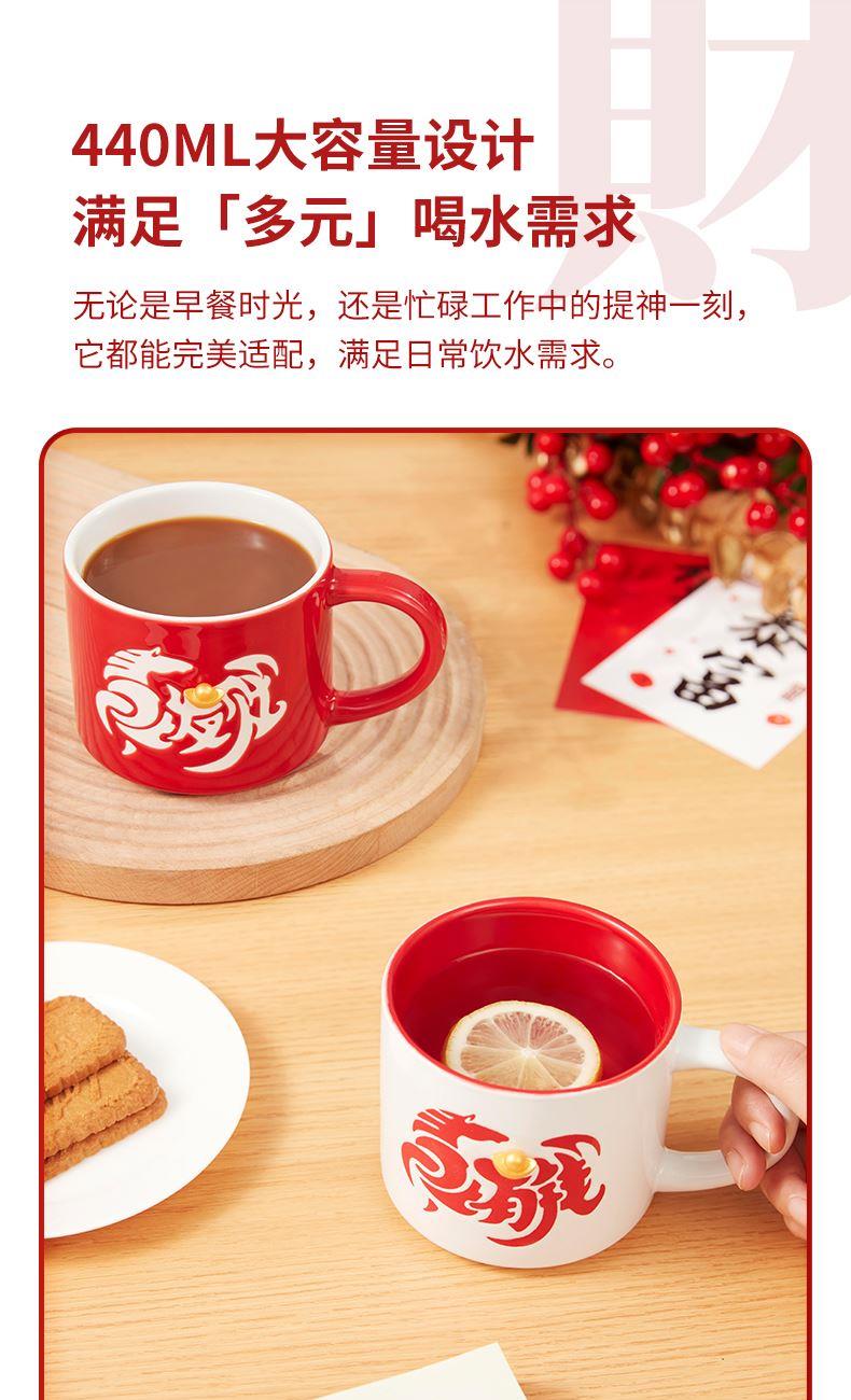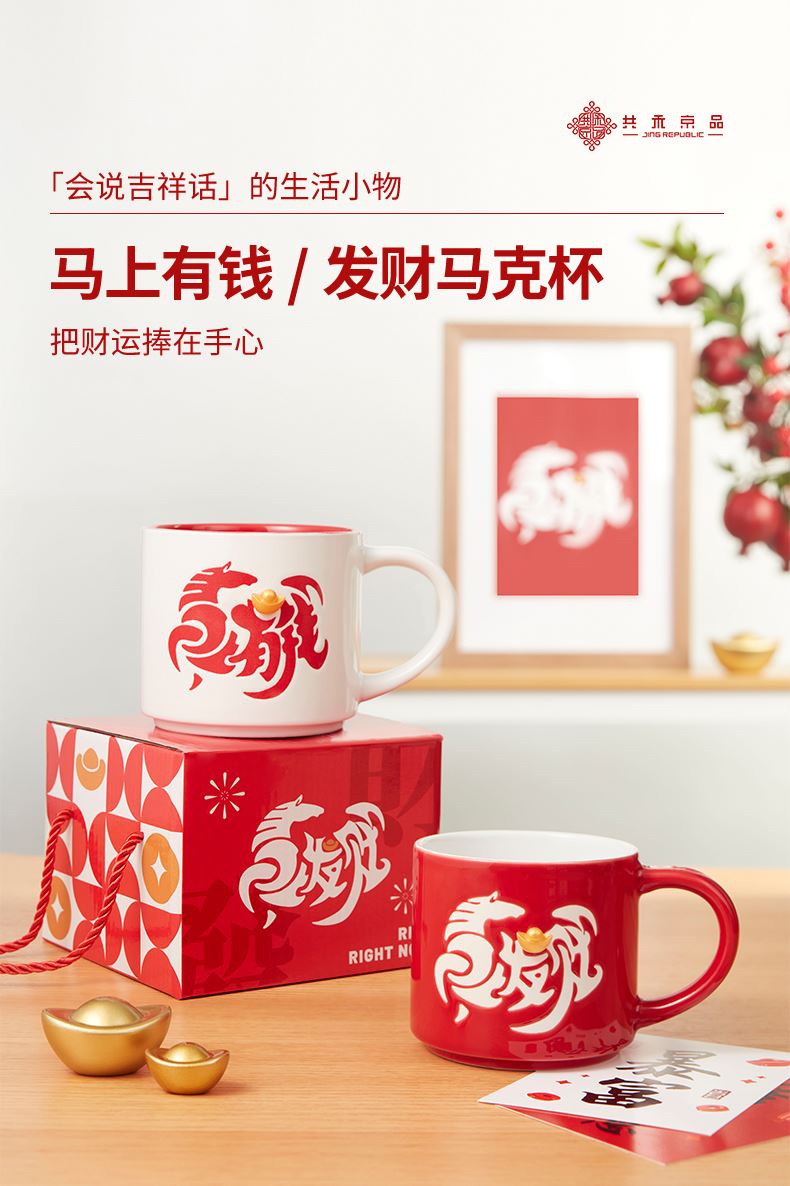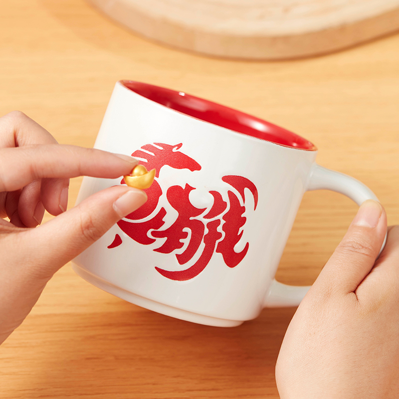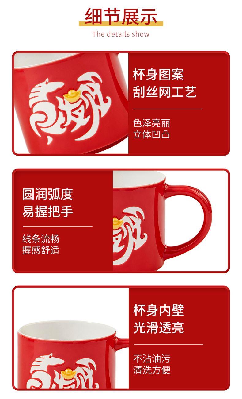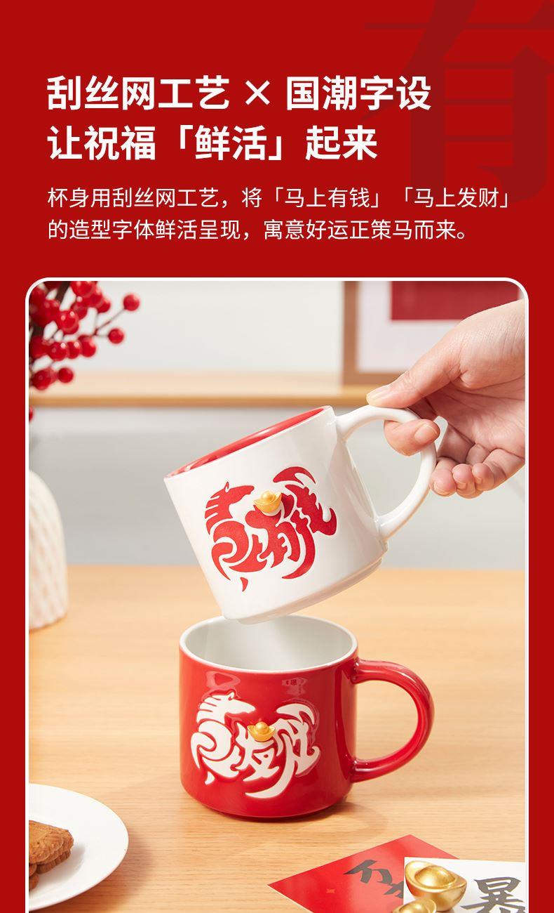 产品卖点 ① 杯身图案采用刮丝网工艺,将「马上有钱」「马上发财」的造型字体鲜活呈现,寓意好运正策马而来 ② 可 DIY 黏贴小元宝,把「财运掌控权」交给你 ③ 采用高温烧制的优质瓷士高温瓷「强度高」不易划损④ 440ML大容量设计,满足多元喝水需求