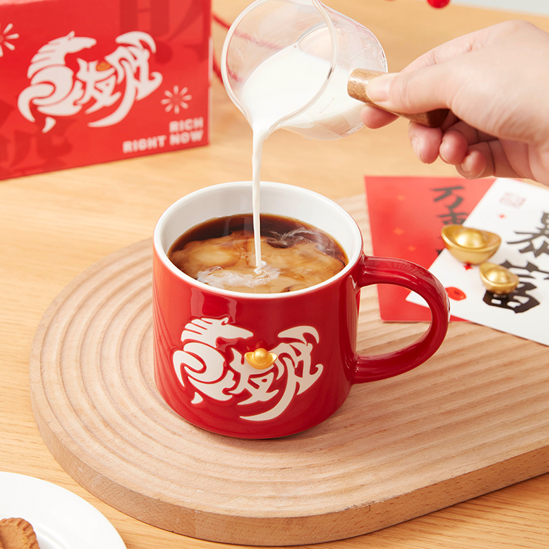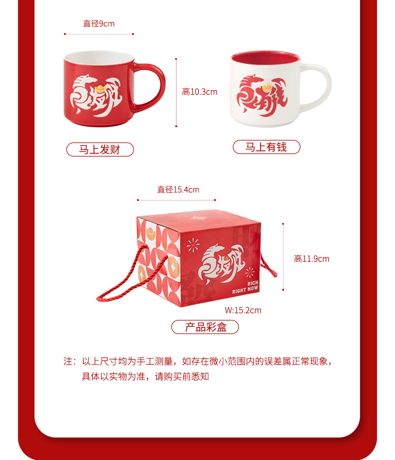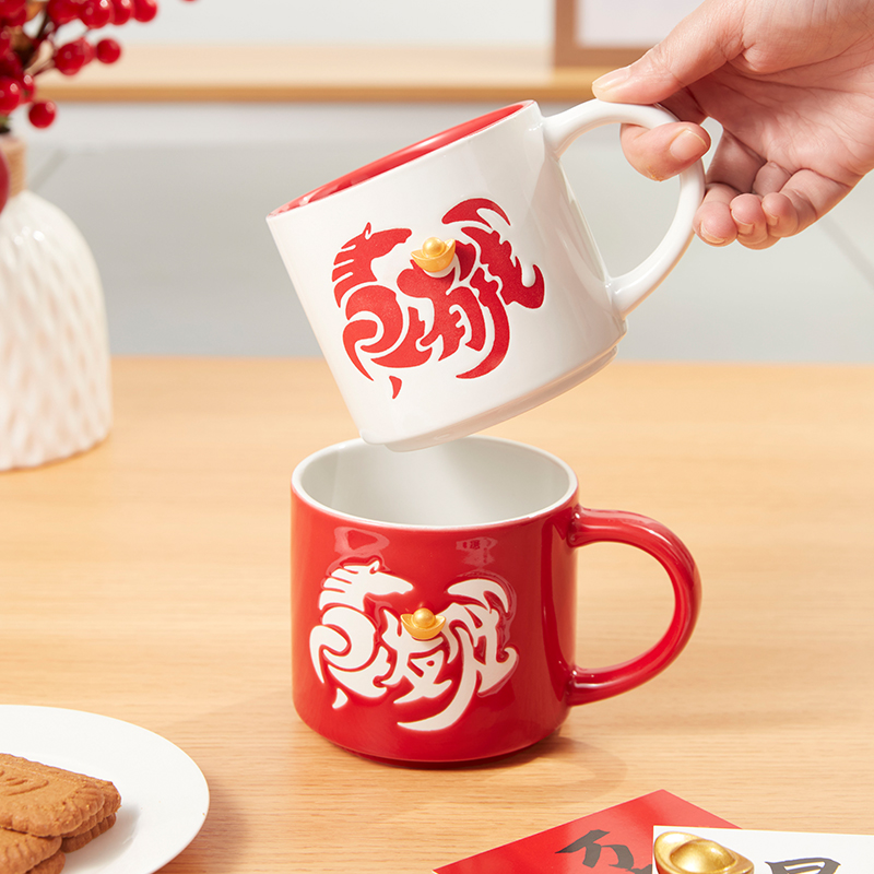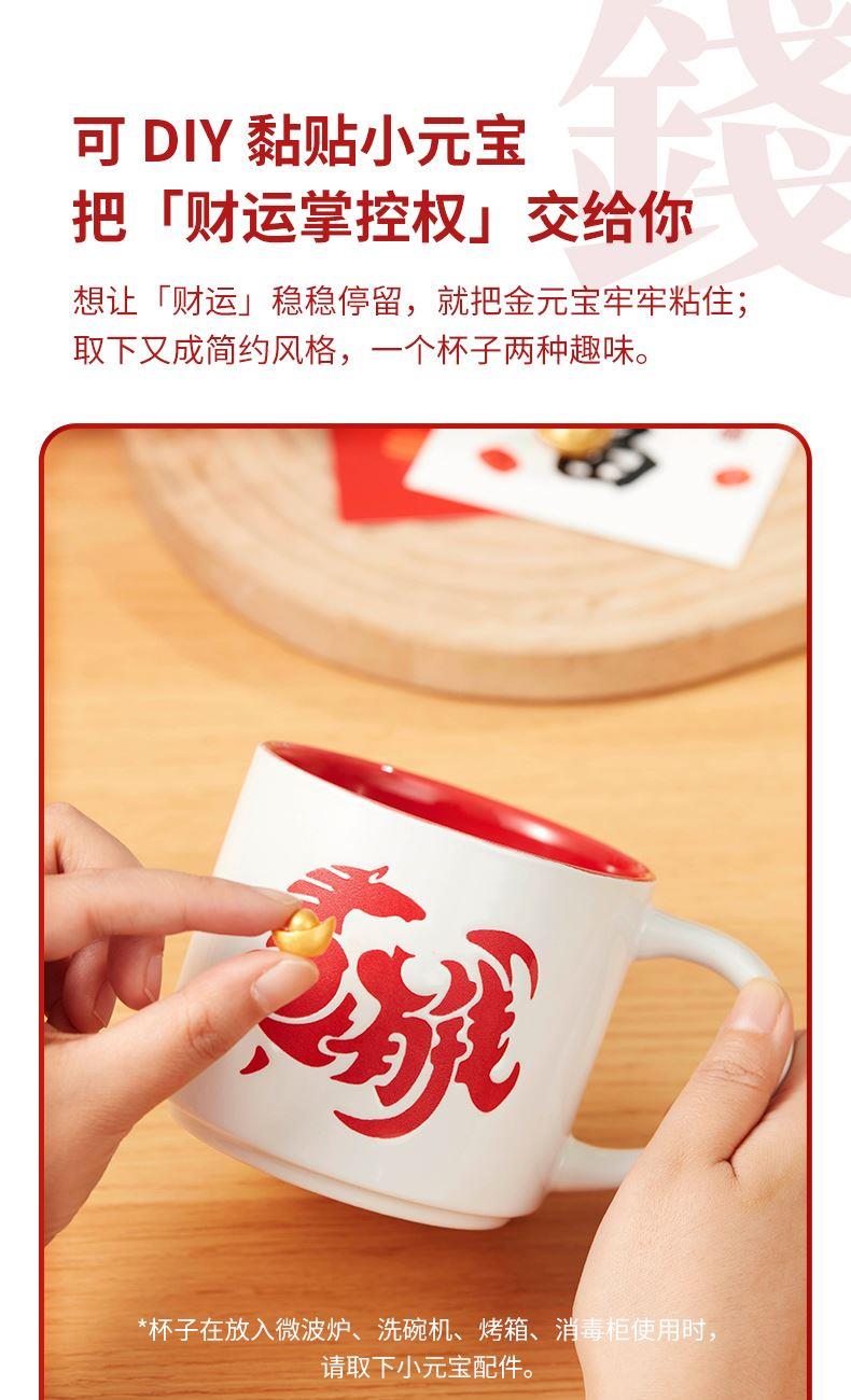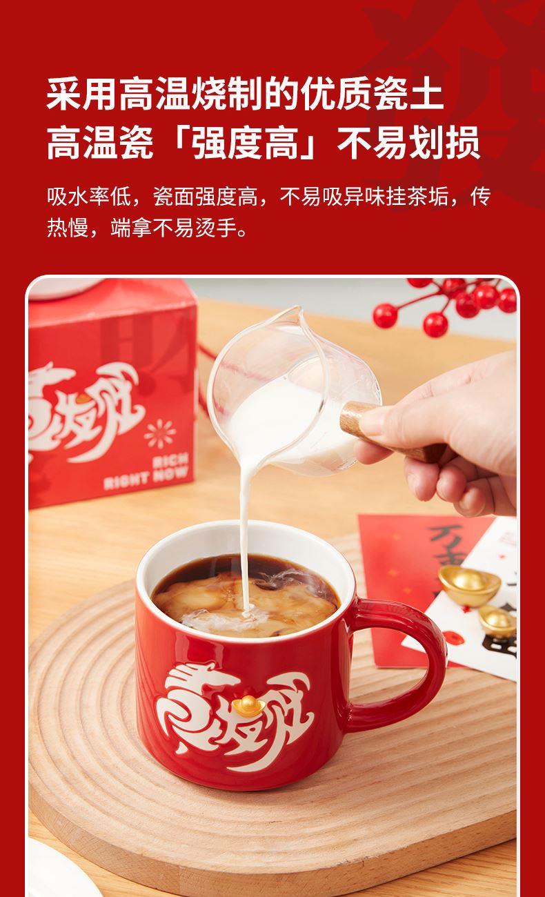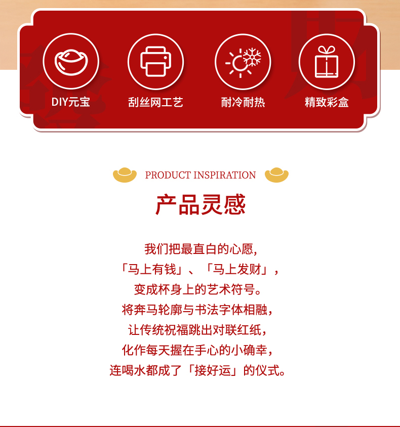 产品卖点 ① 杯身图案采用刮丝网工艺,将「马上有钱」「马上发财」的造型字体鲜活呈现,寓意好运正策马而来 ② 可 DIY 黏贴小元宝,把「财运掌控权」交给你 ③ 采用高温烧制的优质瓷士高温瓷「强度高」不易划损④ 440ML大容量设计,满足多元喝水需求