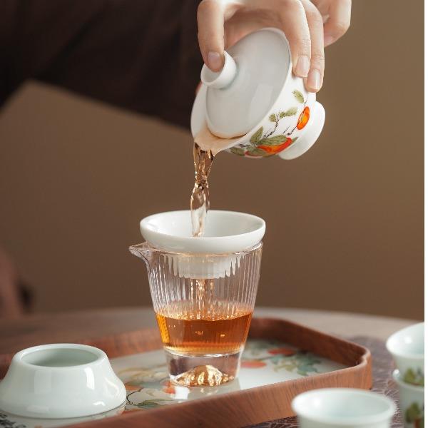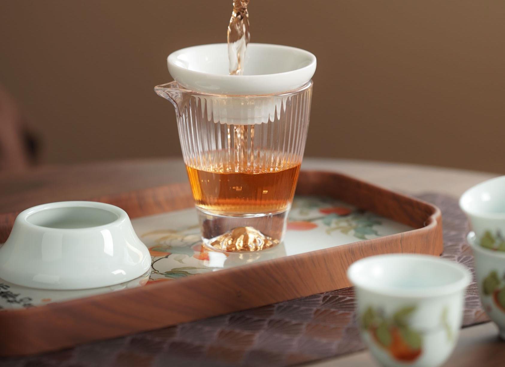 配置:1盖碗/6杯/1过滤网/1玻璃茶海/1茶巾/1茶夹/1茶盘/1旅包