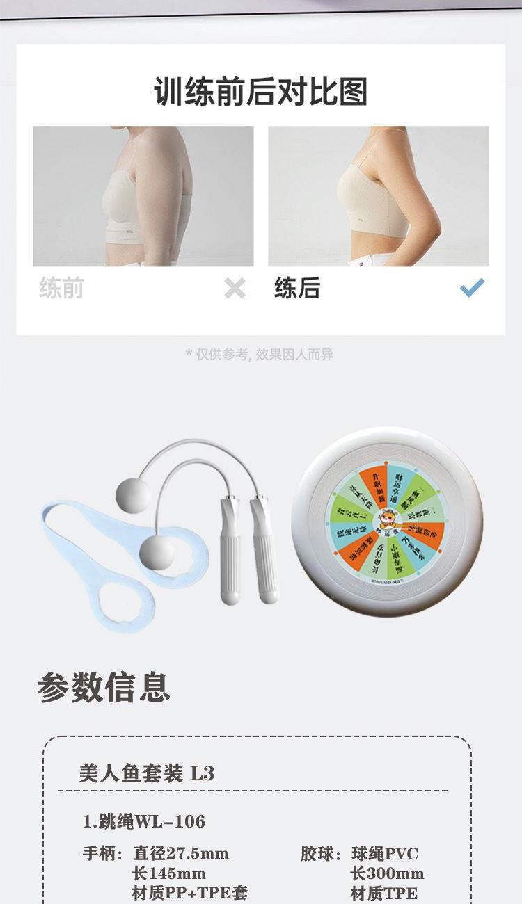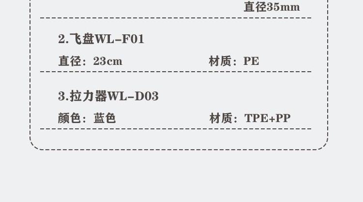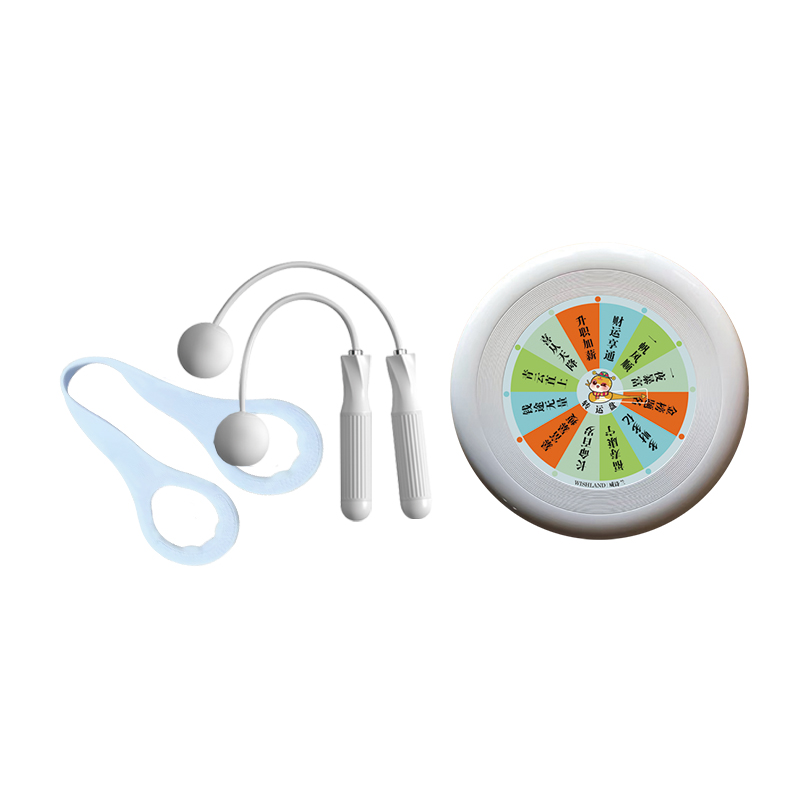 产品配置:跳绳* 1、飞盘* 1、拉力器*1、精美礼盒*1 产品规格: 1、跳绳 GFTS-106 手柄:直径27.5mm 长145mm ,材质PP+TPE套 胶球:球绳PVC 长300mm 材质TPE 直径35mm 2、飞盘 WL-F01 直径:24cm 材质:PE 3、拉力器 WL-D03 材质:TPE+PP 颜色:蓝色