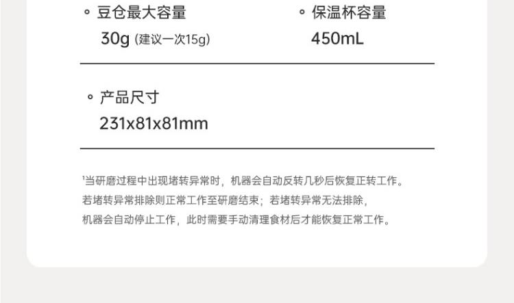 颜色:象牙白/浅草律 电池容量:800*2mAh 满电续航(次数):15次 额定功率:18W 杯体容量:上杯350ml 下杯450ml 档位:5档 刀头材质:陶瓷 豆仓容量:30g