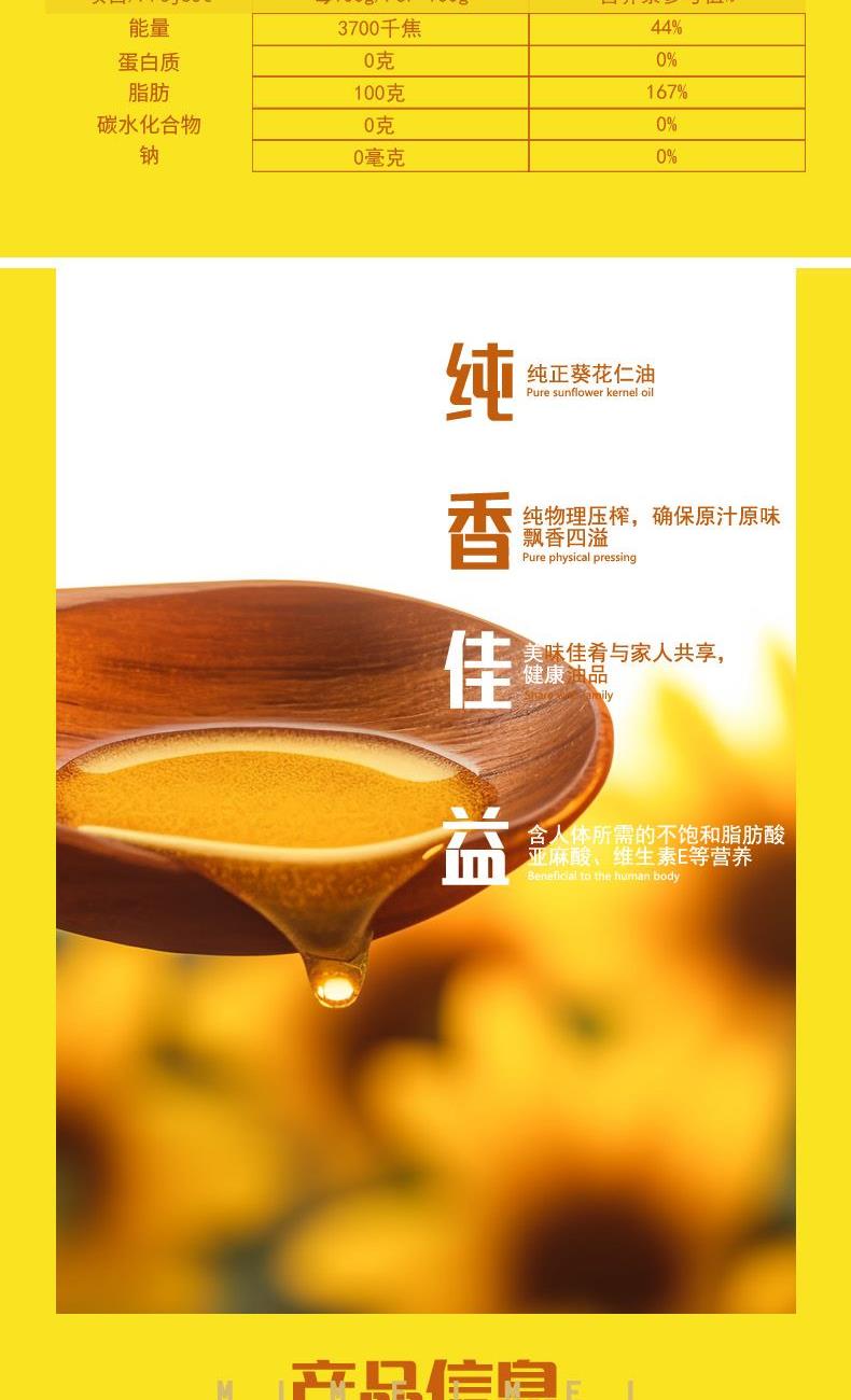 1.采用传统的物流压榨工艺制作,不含任何有害物质 2..葵花籽油属于低脂油类,表面看色泽金黄、清明透亮、口感纯正。 3.具有高亚油酸,高亚油酸,高维生素E的特点4.力争上油,事业有成,想要都有