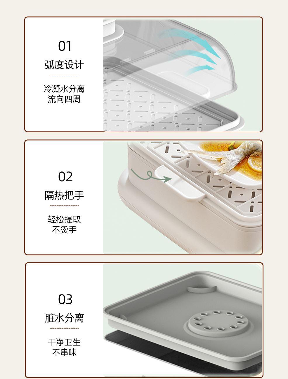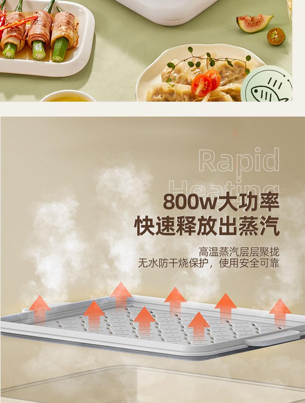 额定功率:800W 产品容量:18L 额定电压:220V~ 产品频率:50Hz 产品净重:2.4kg 产品毛重:2.7kg 整箱重量:11.8kg 产品尺寸:330x310x335mm 彩盒尺寸:380x355x275mm 产品条码:6959443012221 外箱尺寸:730x400x590mm 透明蒸笼食品级透明蒸笼,独立冷凝回流盘 触控数码显示触摸控制,多位数码显示 双环聚能加热双环聚能不锈钢发热盘、快速出蒸汽 智能预约、保温24小时智能预约,120分钟保温