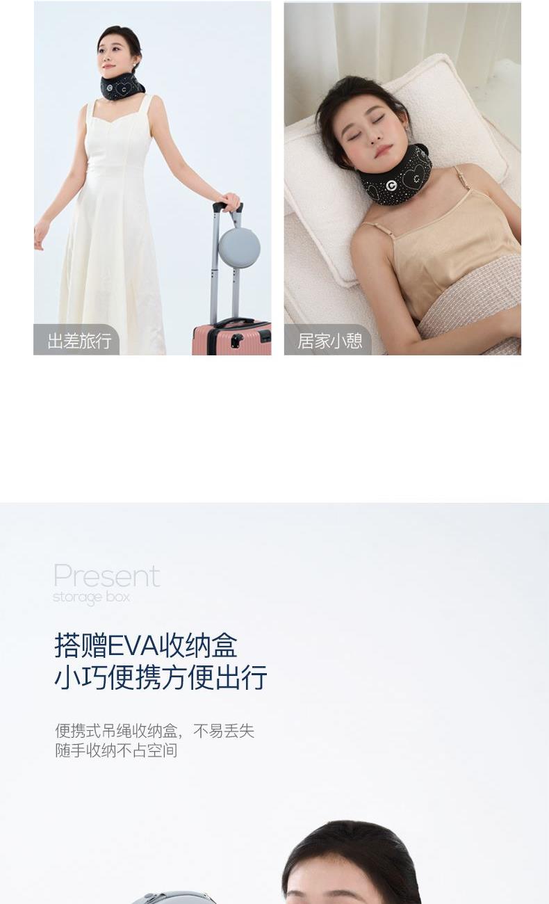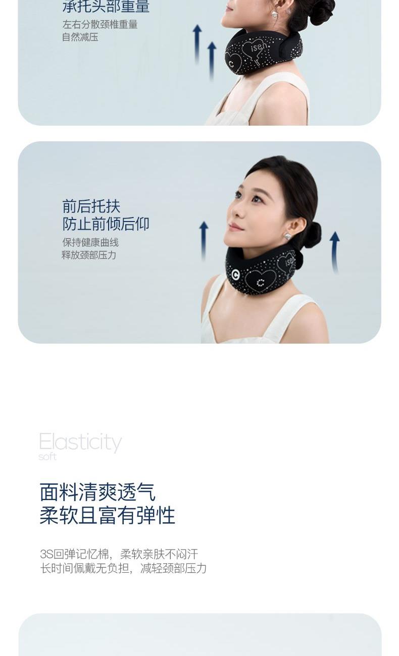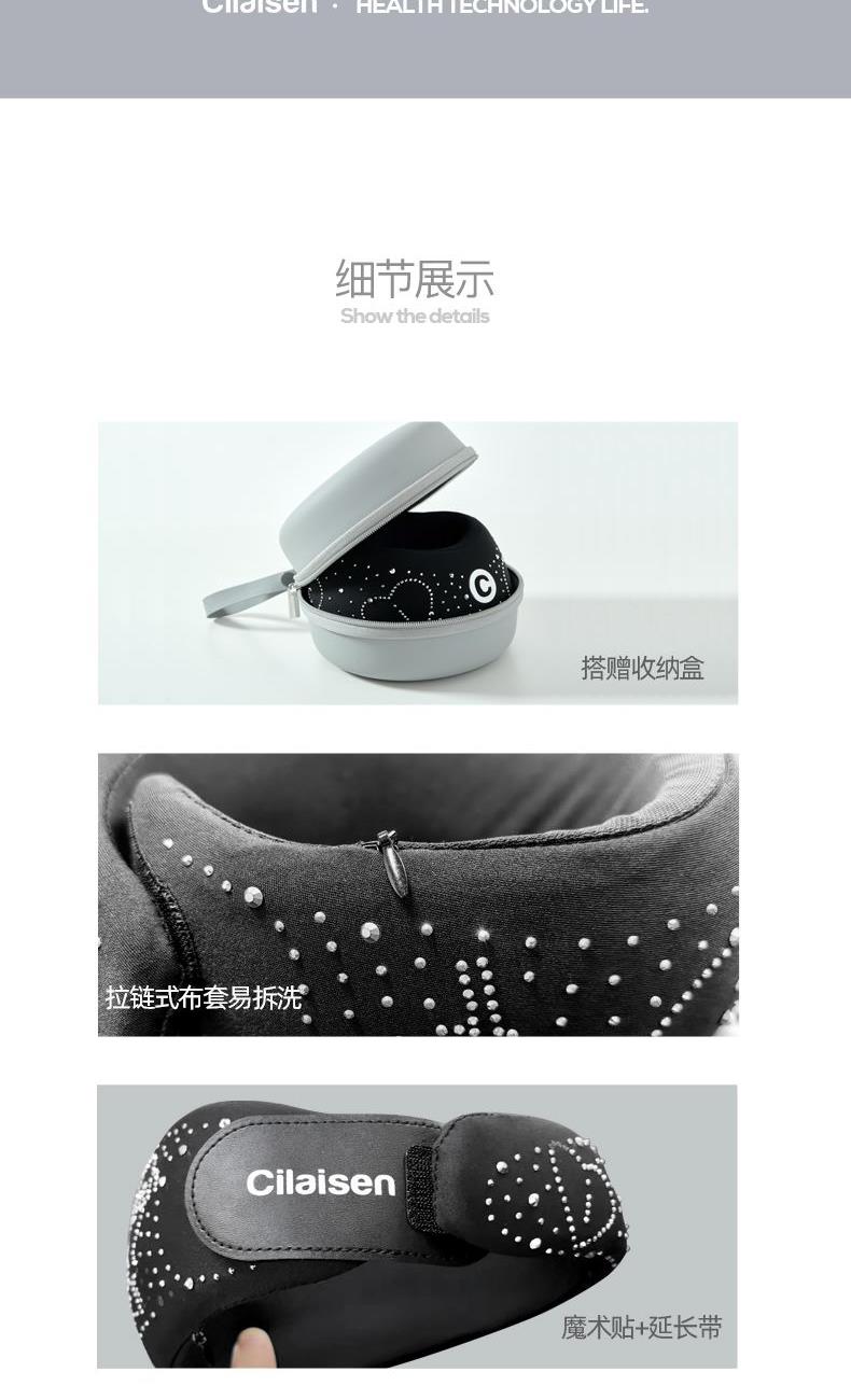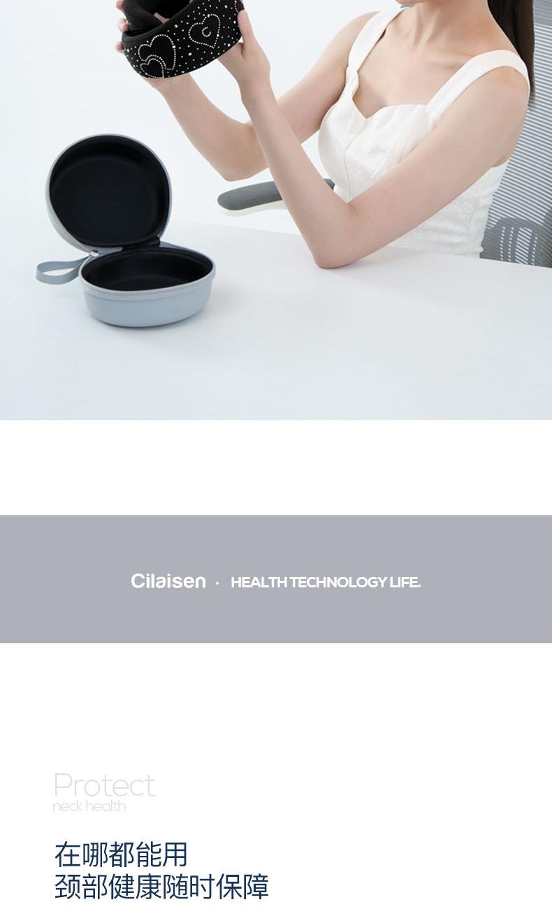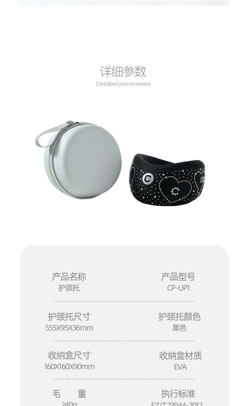 产品参数: 型号:CP-UP1 条码 : 6972831861249 颜色:黑色 尺寸:555X95X36mm 外套:75%锦纶 25%氨纶 外内套:88%锦纶 12%氨纶 内罩:94%聚酯纤维 6%氨纶;填充物:聚氨酯 收纳盒尺寸:160X160X90mm ;收纳盒材质:EVA 毛重:240g ;包装清单:护颈托、收纳盒、延长带 ; 执行标准:FZ/T 73044-2012-合格品 GB18401-2010-B类 核心卖点: 1,360°环绕护颈,0负担,强支撑符合人体工学,良好的支撑有效缓解低头族颈脖僵硬舒缓颈脖压力 2,3秒回弹记忆棉,柔软亲肤,不闷汗;时刻让下颚保持放松状态,快回弹记忆棉会驱使头部自然向上抬起 3,多场景适用:久坐/长途驾驶/办公/家务/低头一族 4,加强魔术搭扣+延长带设计,适合各种体型脖子,魔术贴长期粘贴不松动 5,搭赠EVA收纳盒,小巧便携方便出行