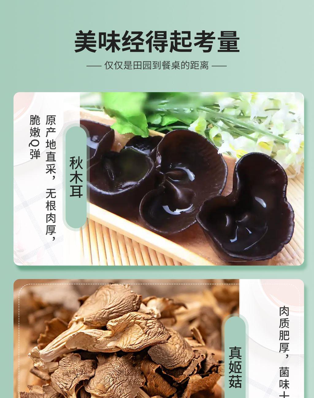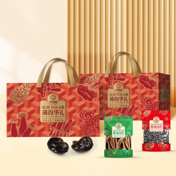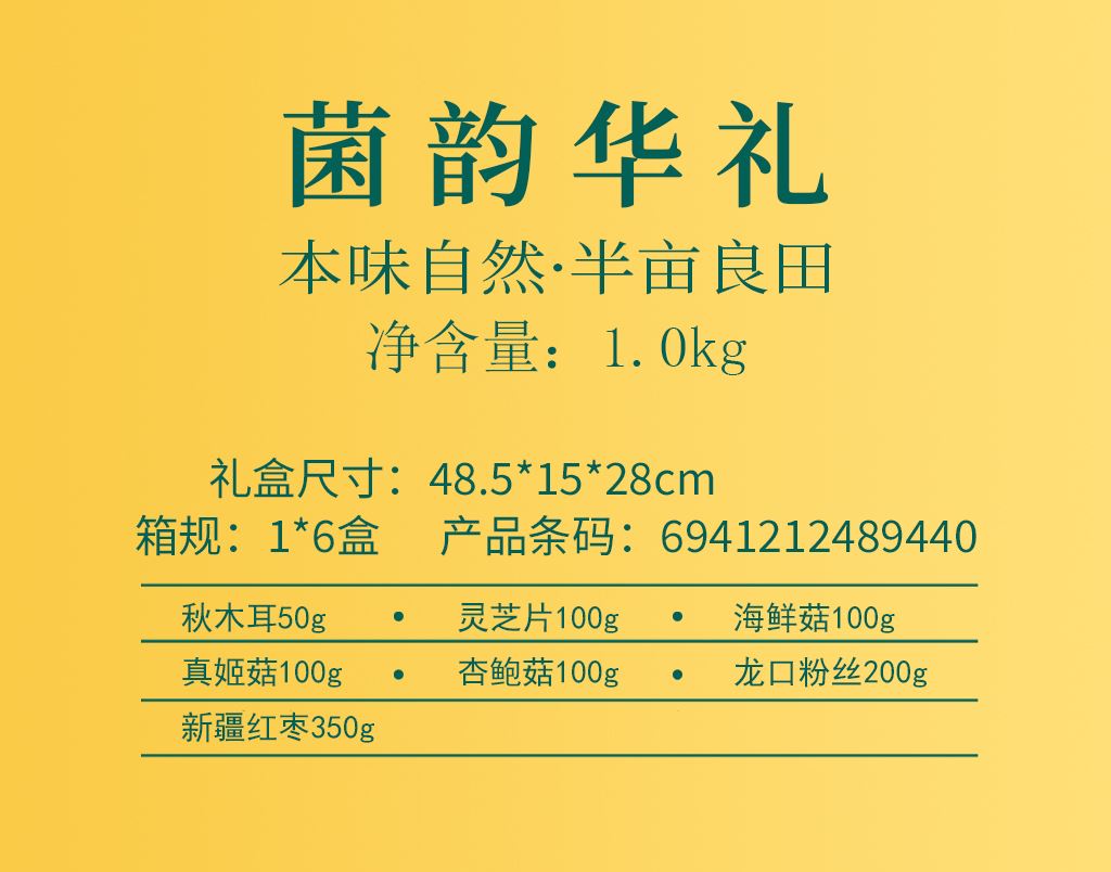 产品配置: 野生秋木耳50g 精选灵芝片100g 精选海鲜菇100g 精选真姬菇100g 精选杏鲍菇100g 龙口粉丝200g 新疆红枣350g 净含量:1.0kg 礼盒尺寸:48.5*15*28cm 半亩川菌韵华礼山珍菌菇、滋补灵芝、甘甜红枣、劲道粉丝,一盒集齐各地美味与养生好物,馈赠亲友、自留食用皆宜!